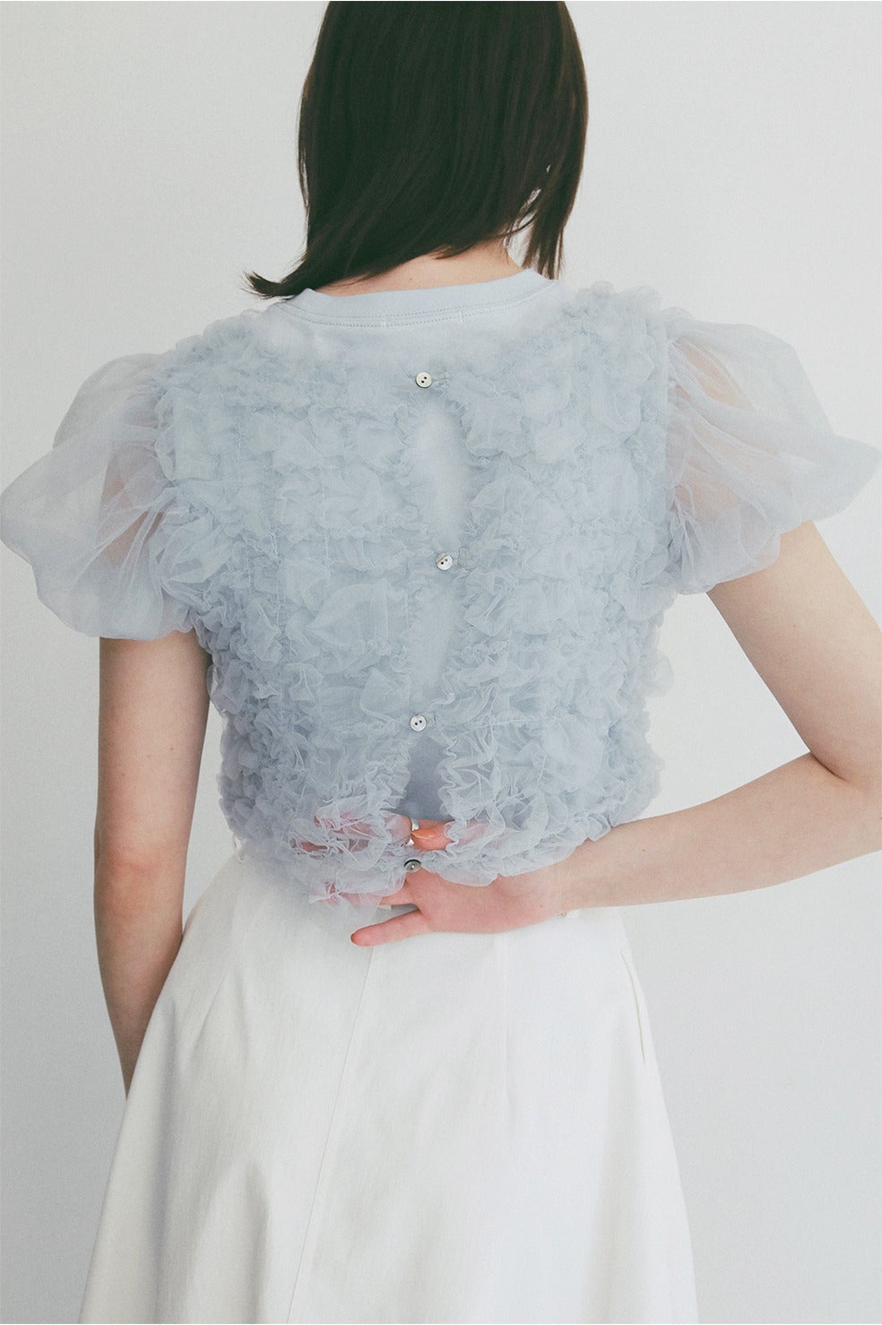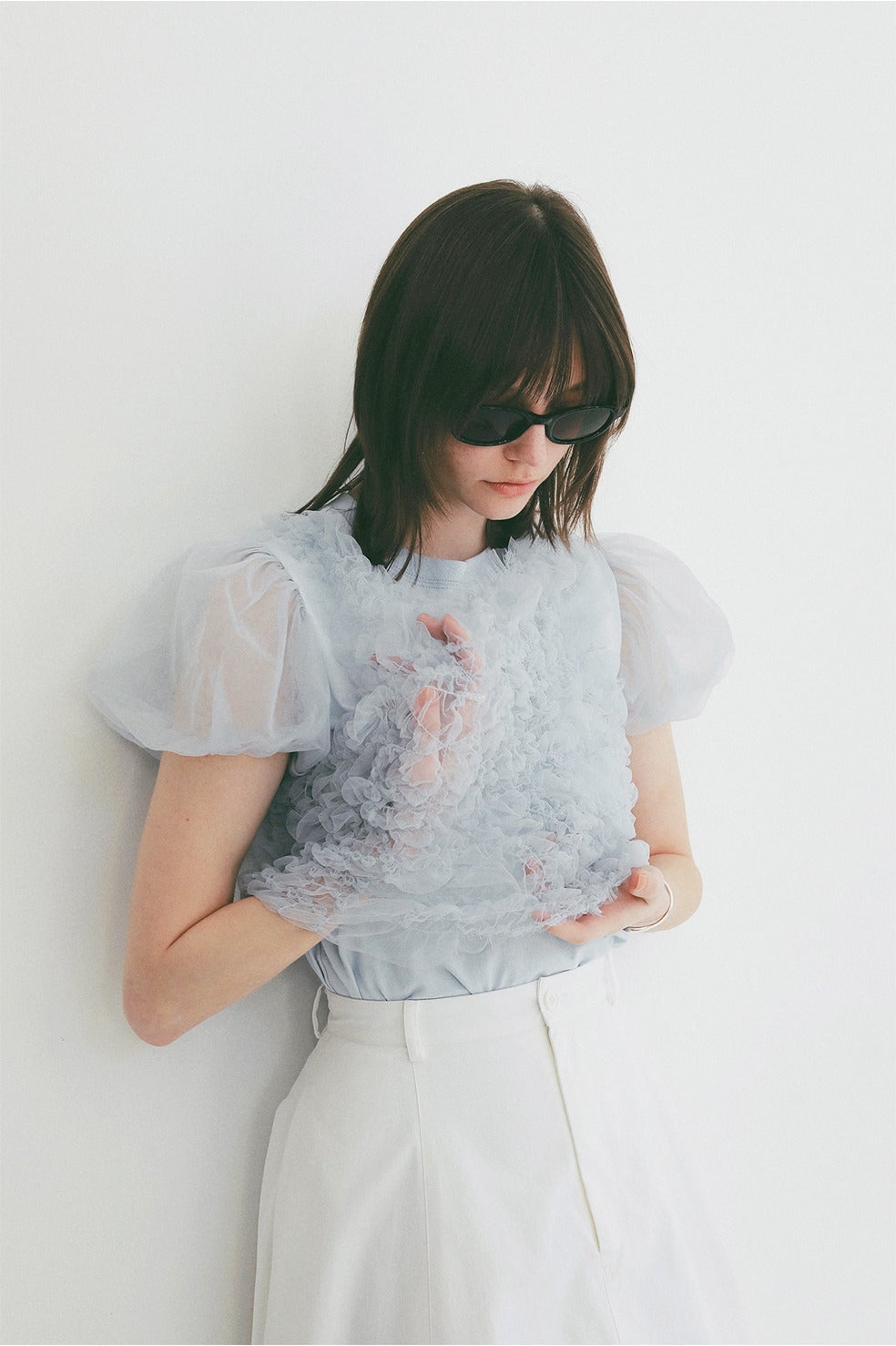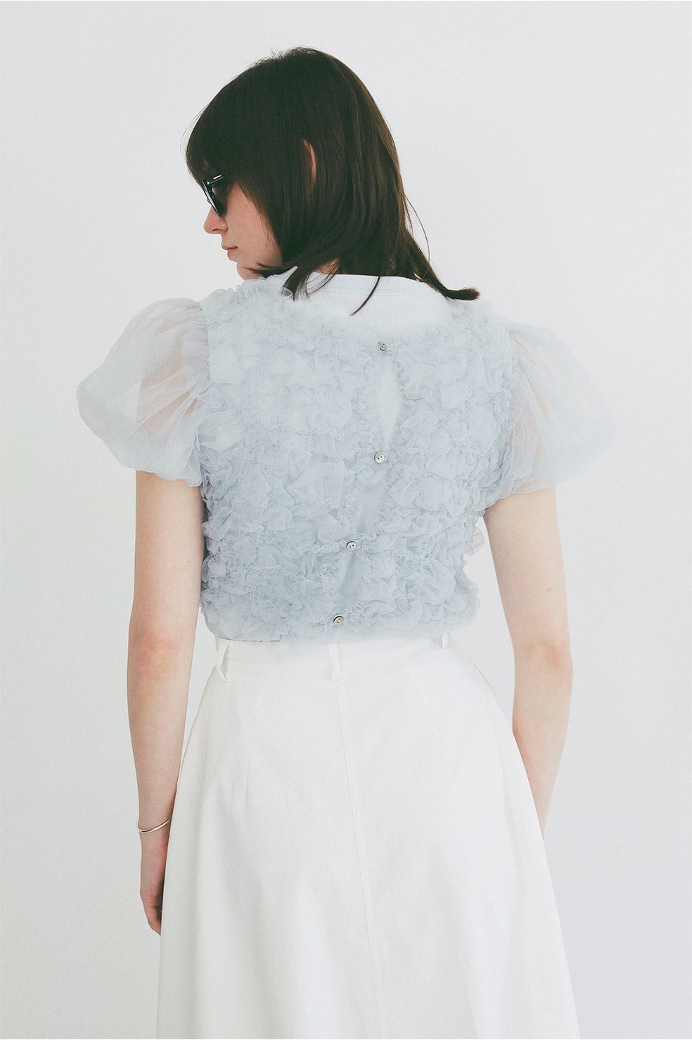 柔らかなチュールにランダムなシャーリング刺繍を施したショートベストと、チュールのパフスリーブがドッキングされたTシャツのレイヤードアイテム。