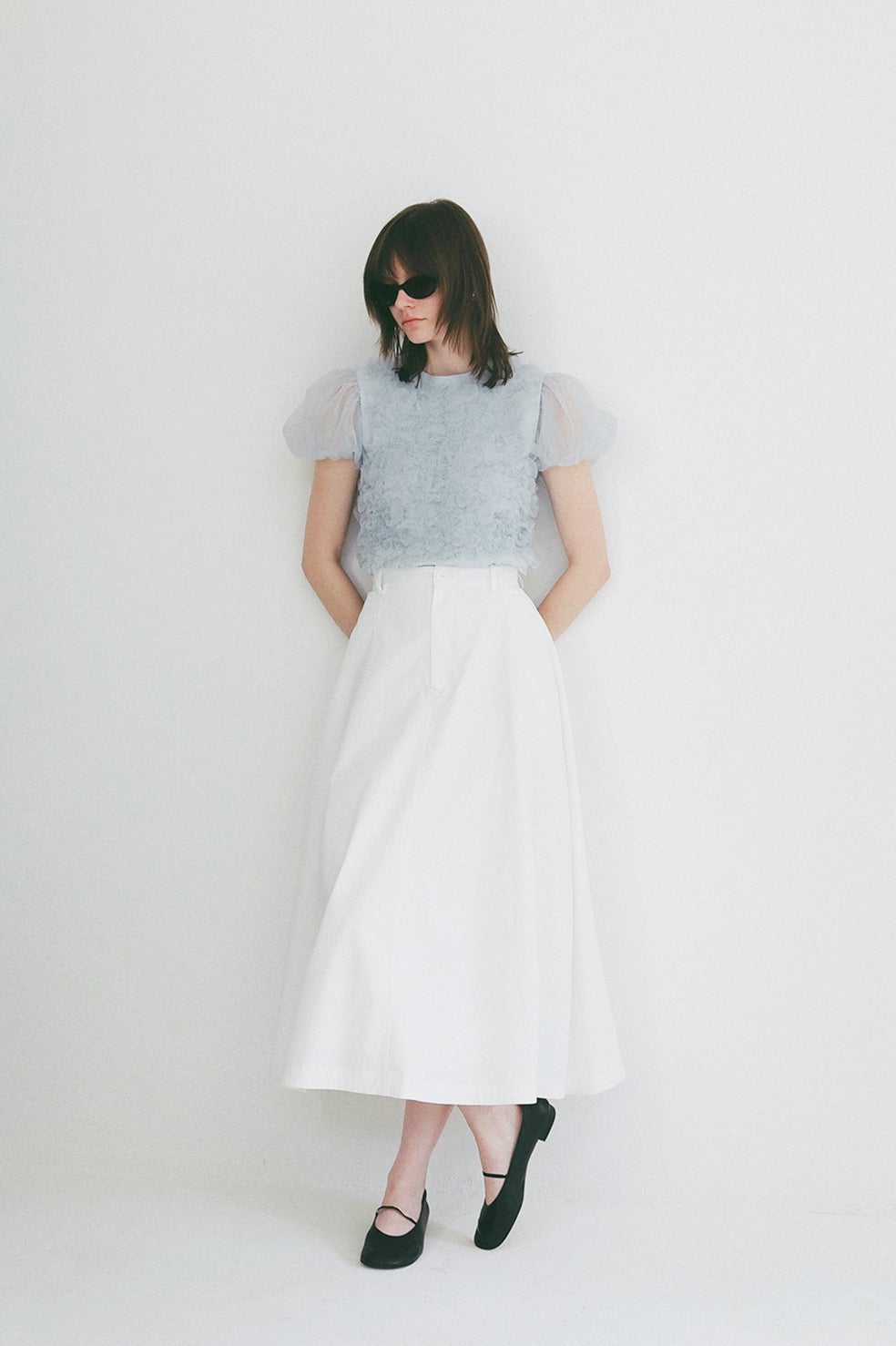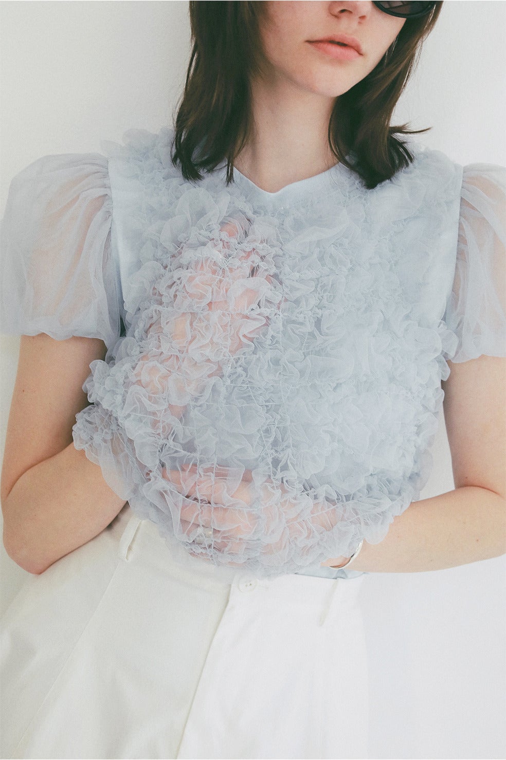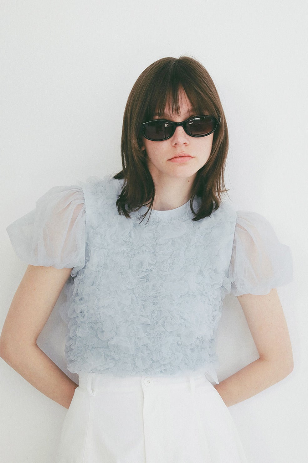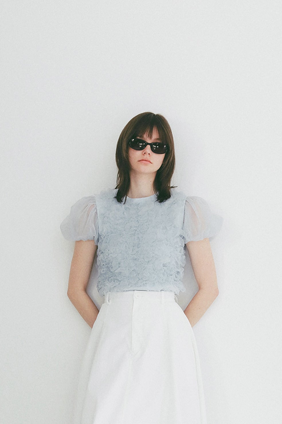 柔らかなチュールにランダムなシャーリング刺繍を施したショートベストと、チュールのパフスリーブがドッキングされたTシャツのレイヤードアイテム。