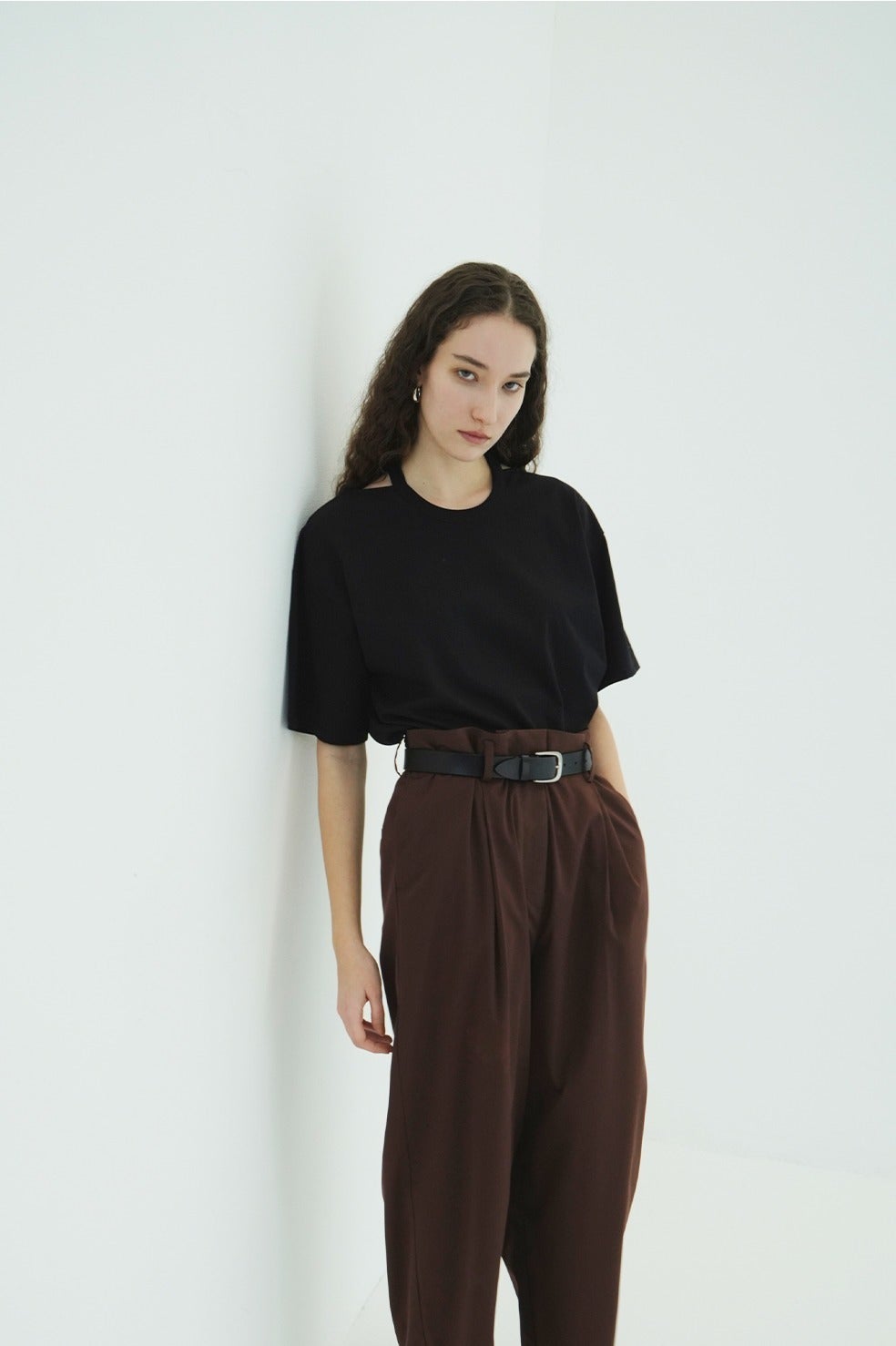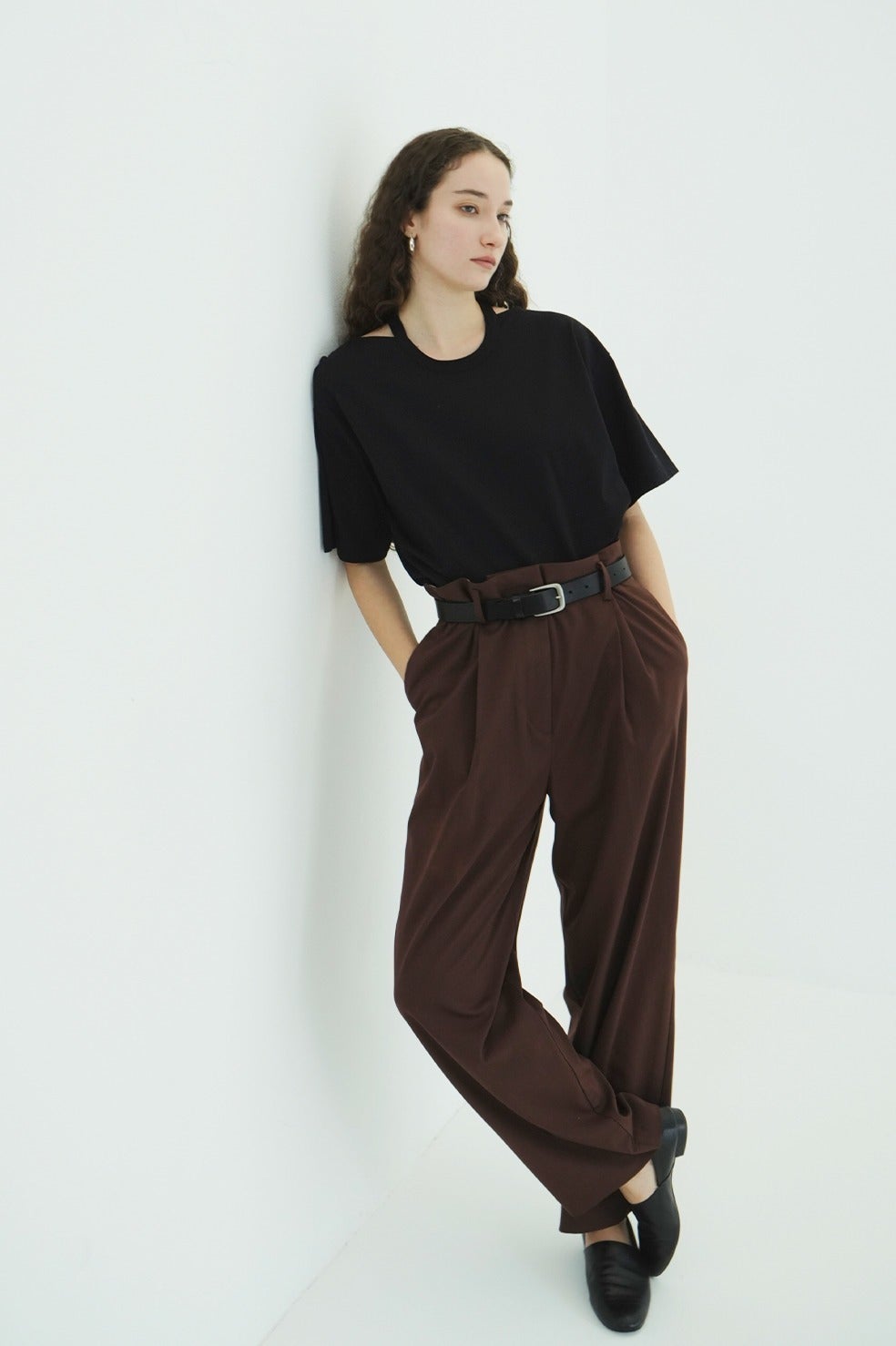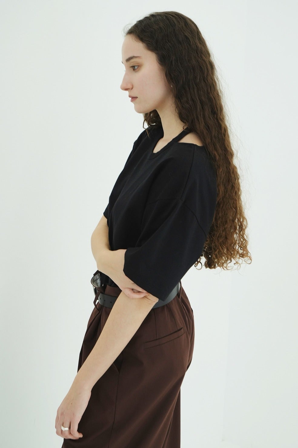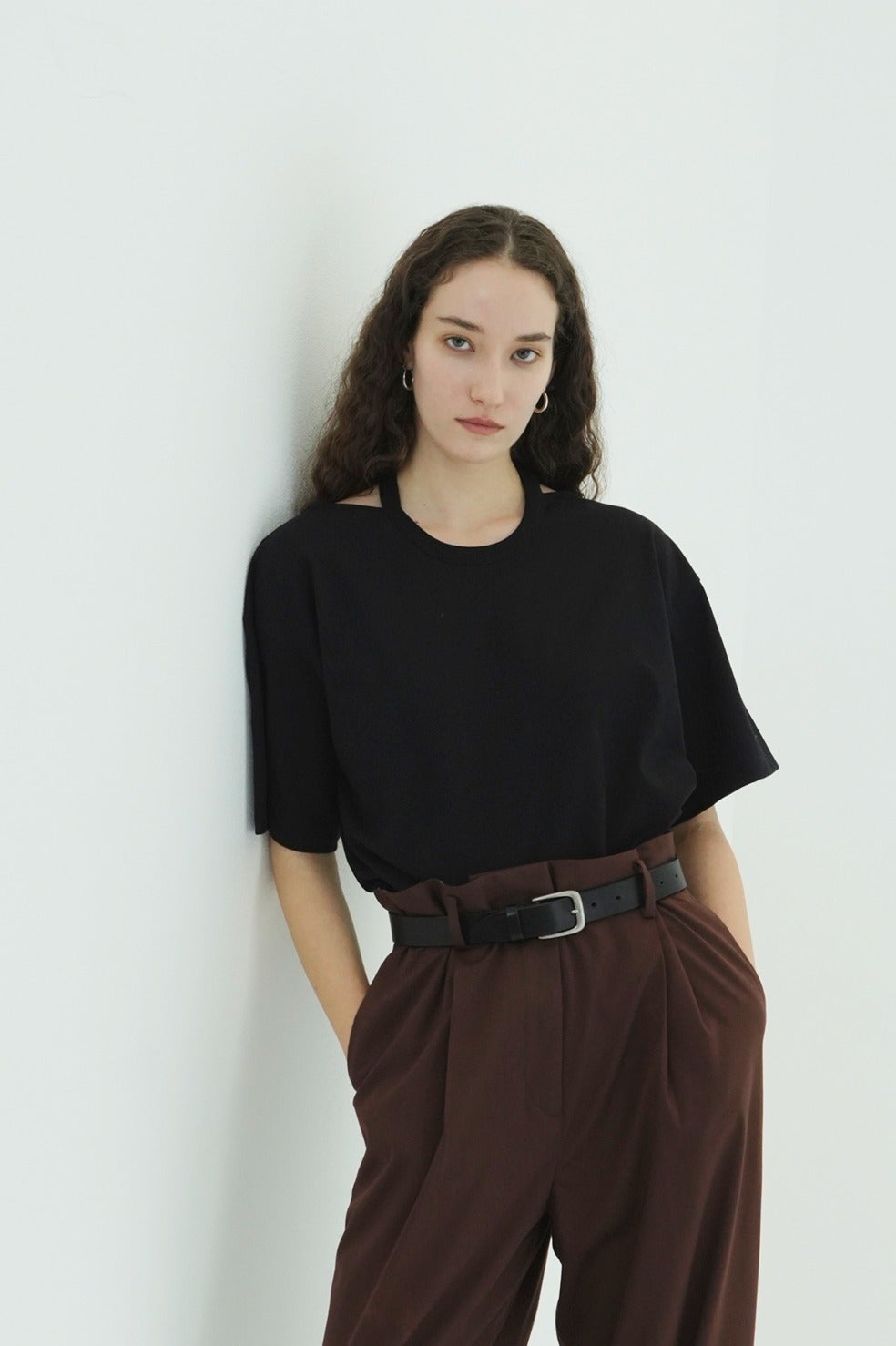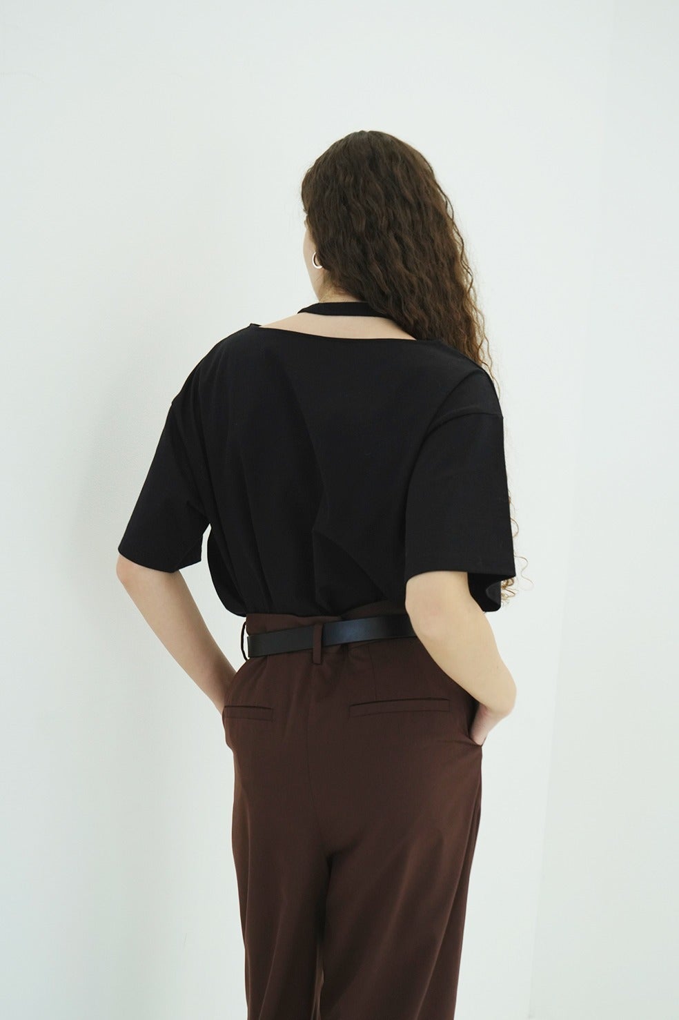 襟元がスラッシュネックになっており、さりげなくデコルテが見えるデザインがアクセントに。ダブルフェイスで着用でき、反対側はチョーカー風のデザインで気分やスタイリングに合わせて着回しができます。
