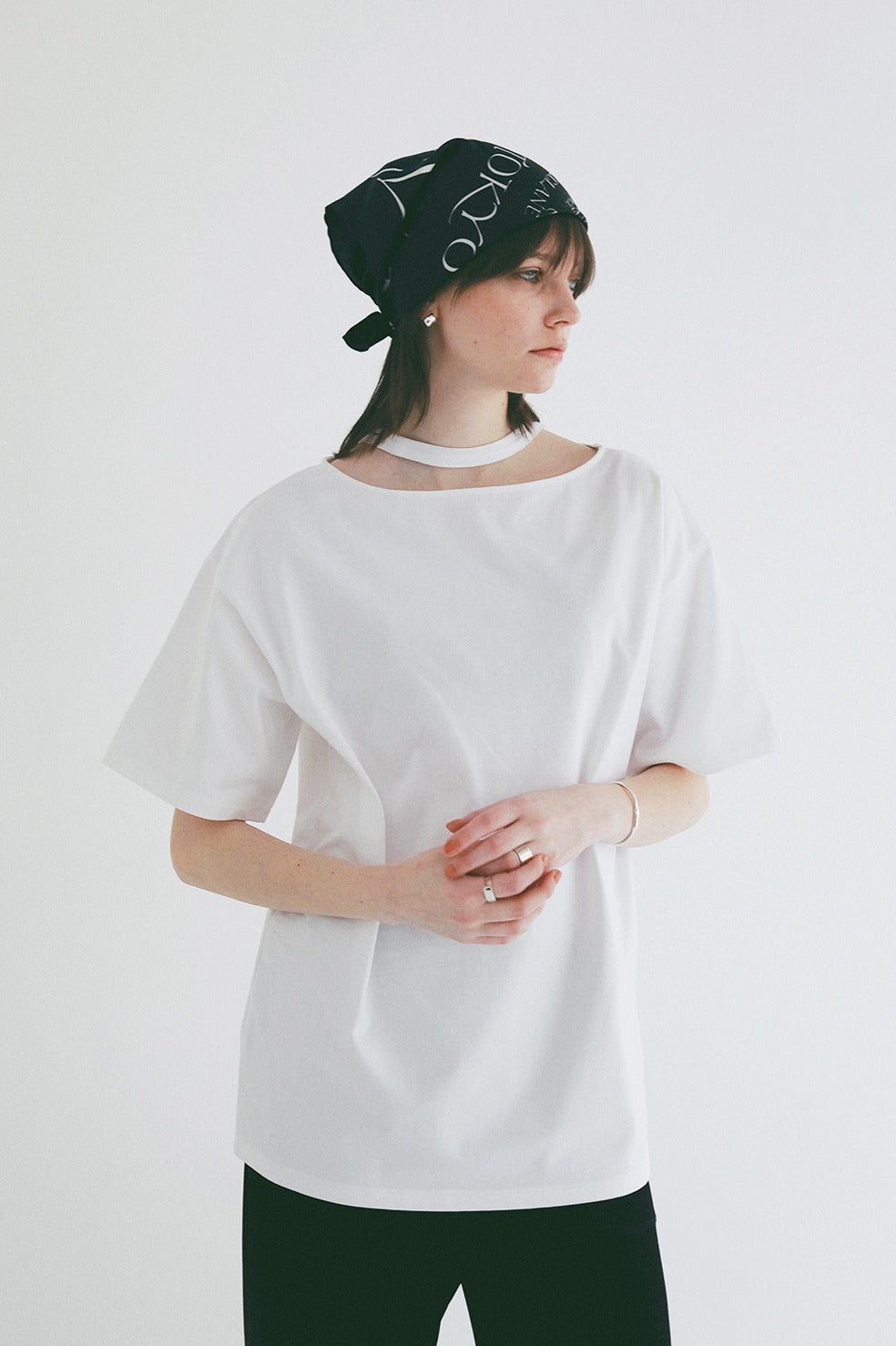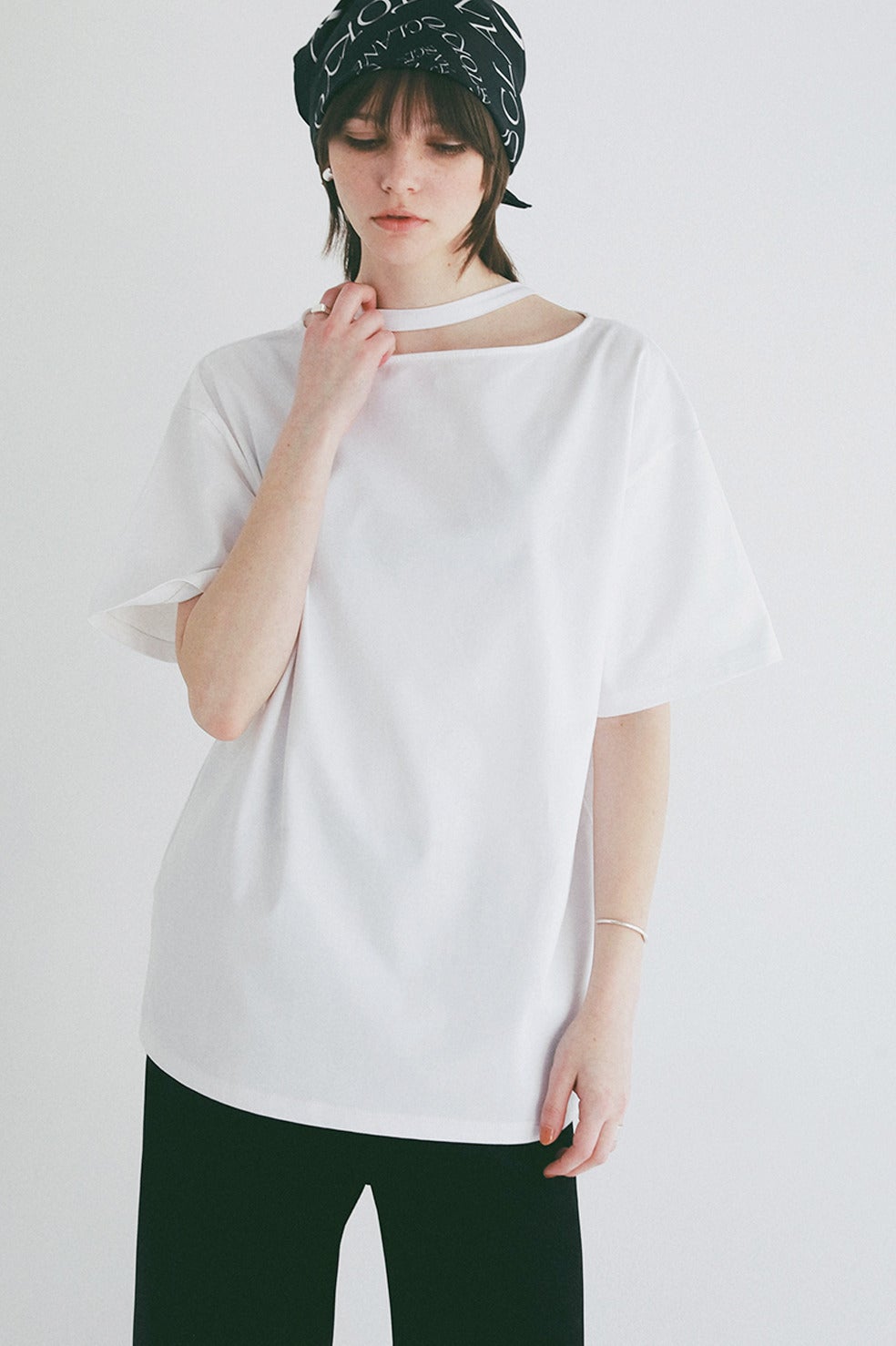 襟元がスラッシュネックになっており、さりげなくデコルテが見えるデザインがアクセントに。ダブルフェイスで着用でき、反対側はチョーカー風のデザインで気分やスタイリングに合わせて着回しができます。