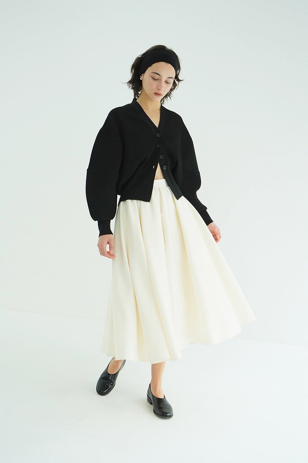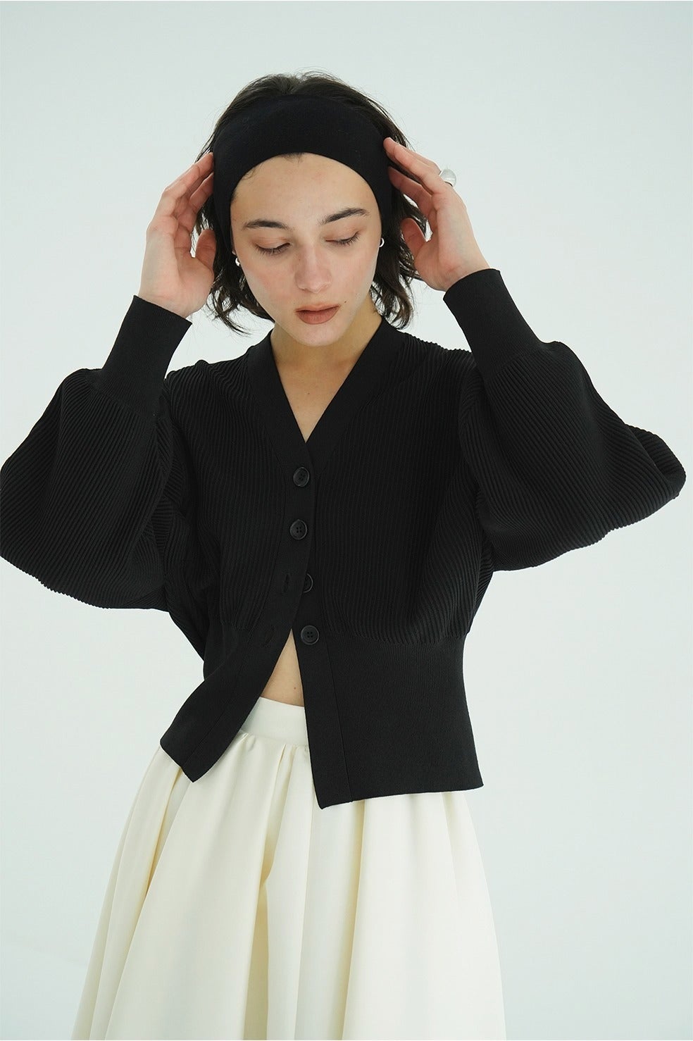 袖の構築的なカーブラインが印象的な、CLANEらしいモード感漂うカーディガン。