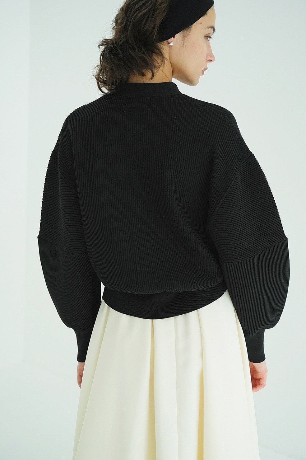 身頃と袖で異なる2種類のリブ編みを採用し、袖部分に切り替えを施すことで、立体感のある表情に仕上げました。ゆったりとしたボリューム感がありながら、ウエストに自然にフィットし、スタイリングのバランスが取りやすいシルエットです。