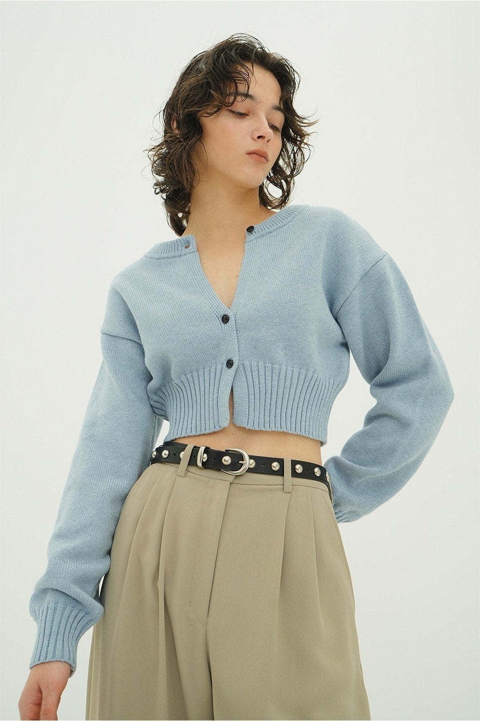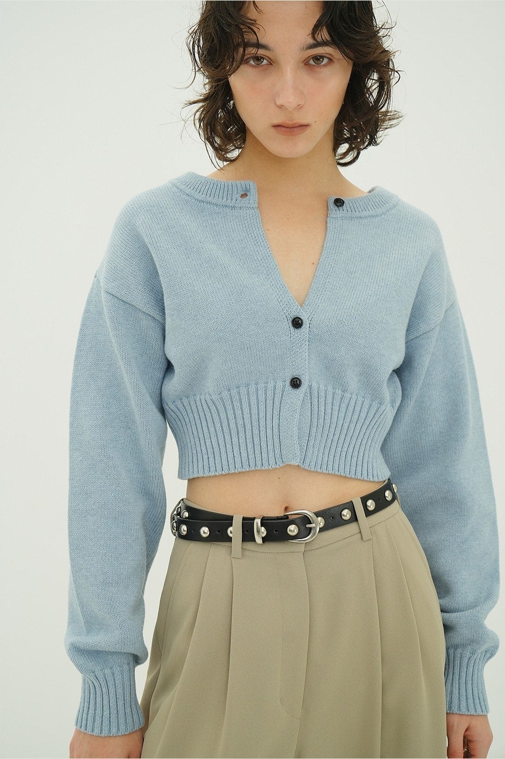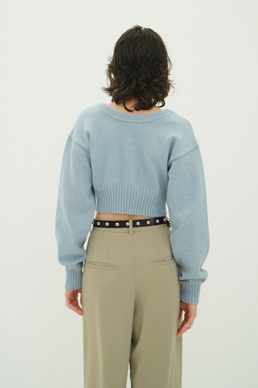 ボタンを開けてカーディガンとして、閉じてトップスとして着用可能。上部のみ外して抜け感を出したり、襟のように折り返したり、前後どちらでも着用できるため、スタイリングに合わせて印象を変えられるデザインです。