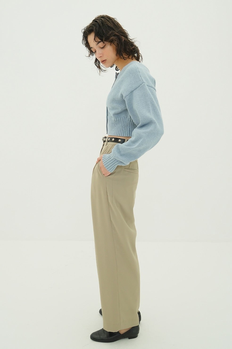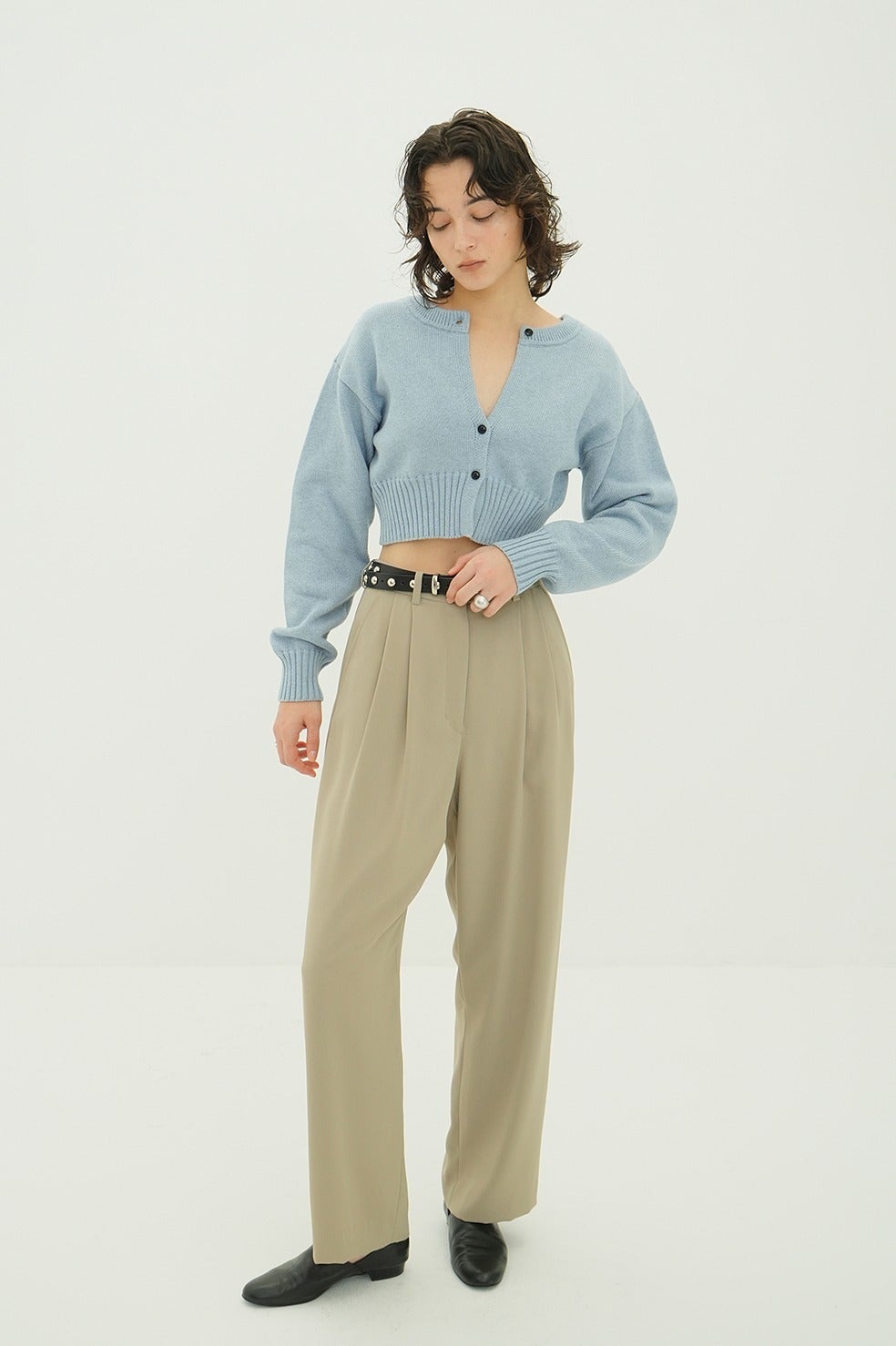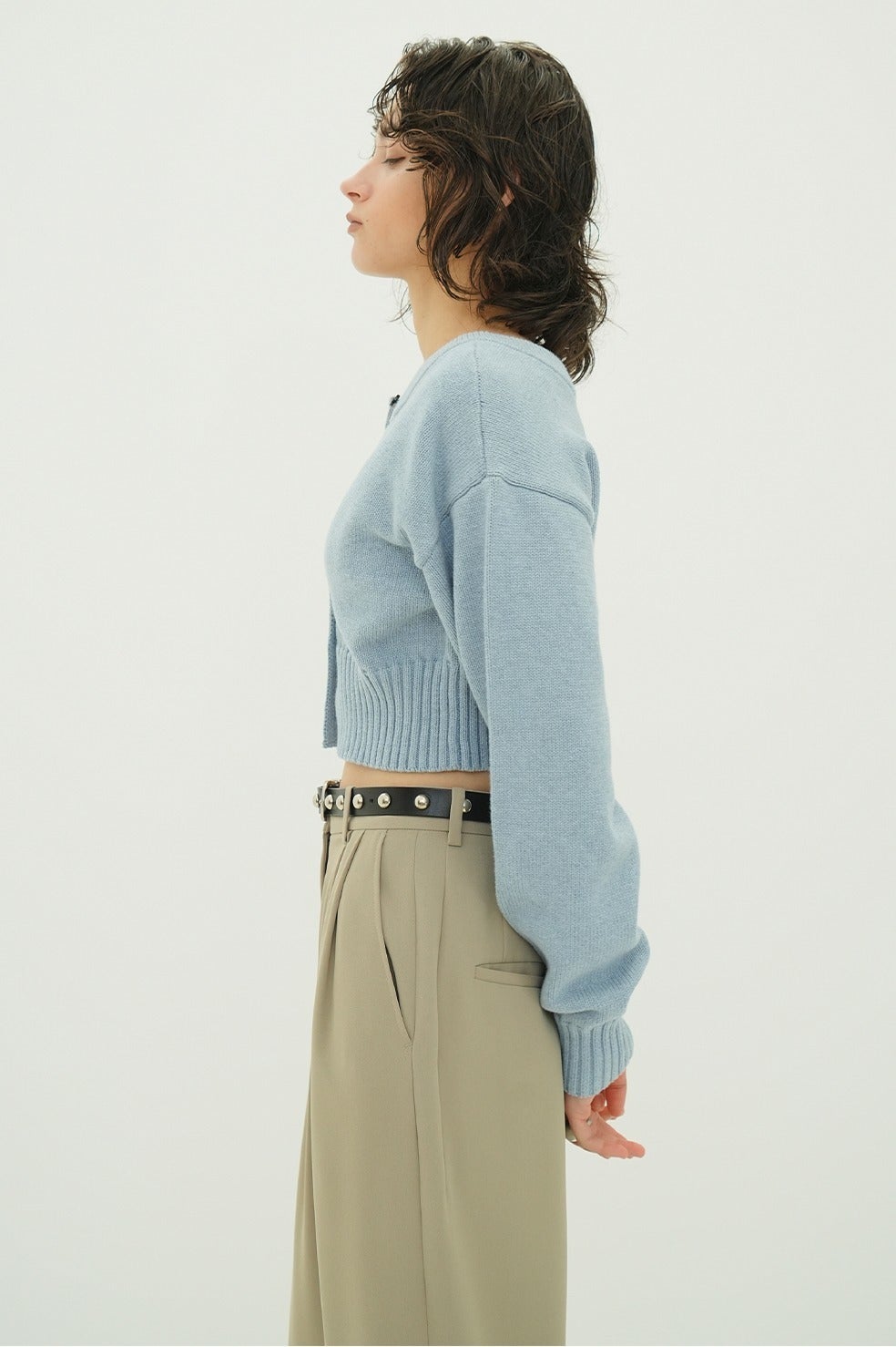 ボタンを開けてカーディガンとして、閉じてトップスとして着用可能。上部のみ外して抜け感を出したり、襟のように折り返したり、前後どちらでも着用できるため、スタイリングに合わせて印象を変えられるデザインです。
