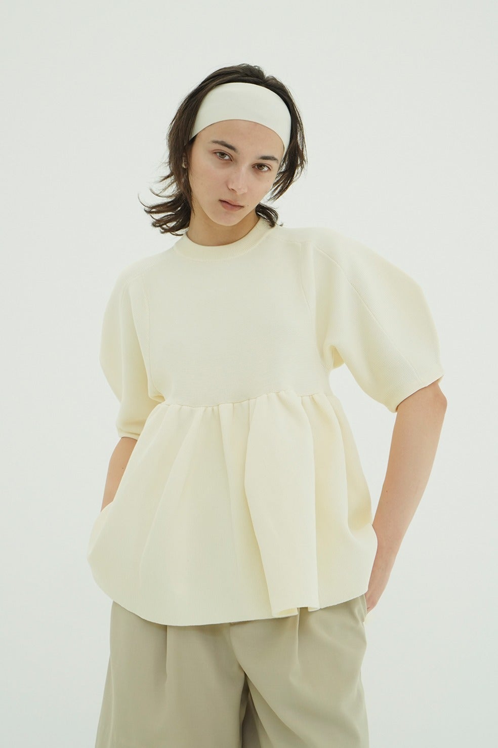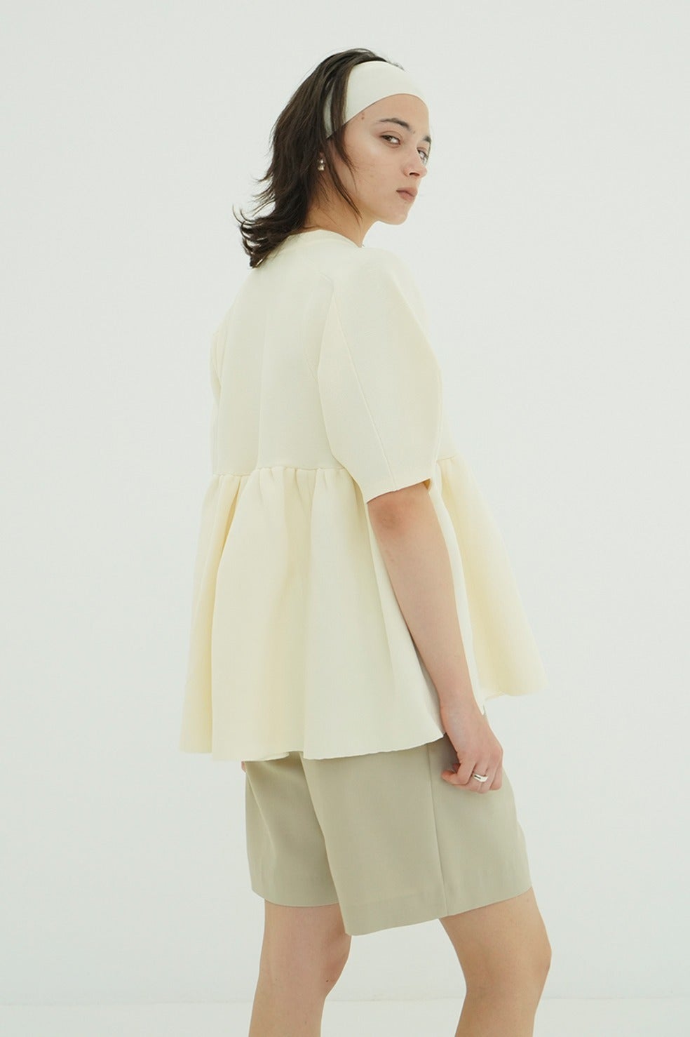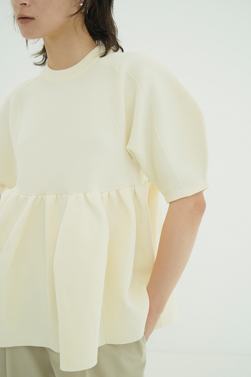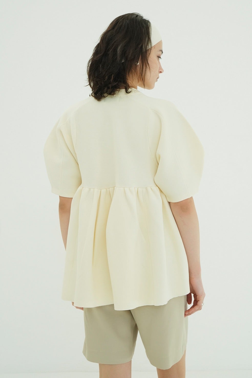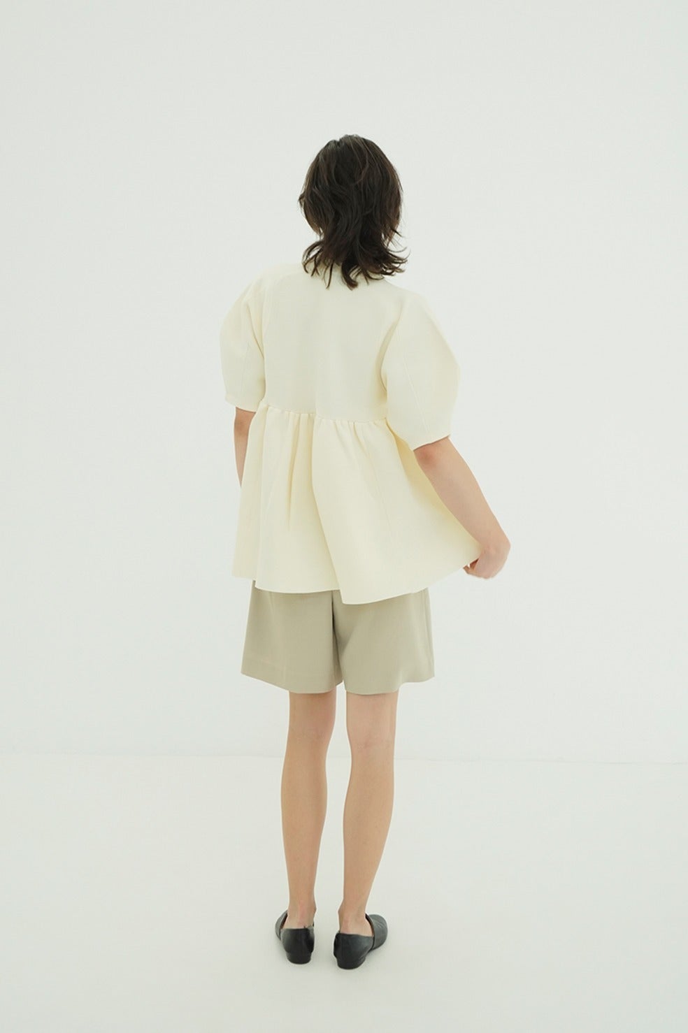 丸みのあるフォルムと立体感のあるペプラムディテールがスタイリングに存在感を添え、着るだけで雰囲気のある着こなしが完成します。