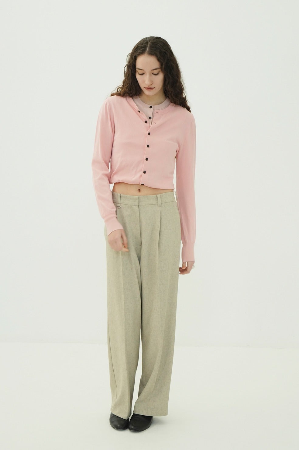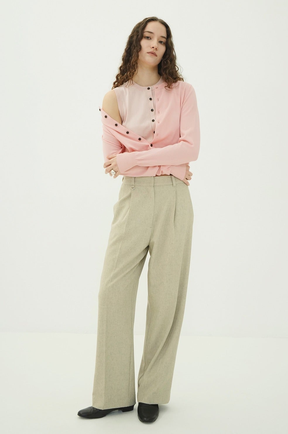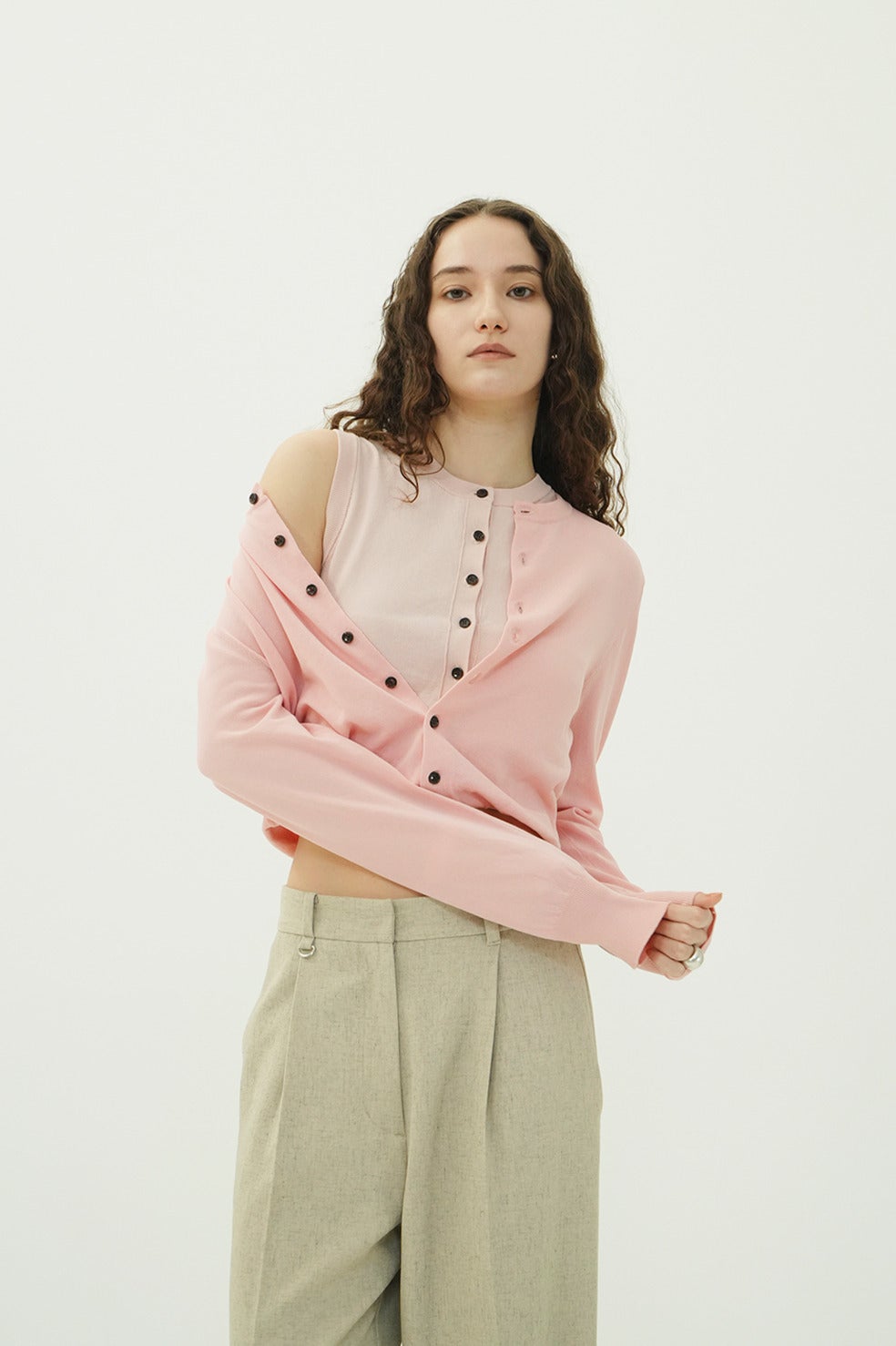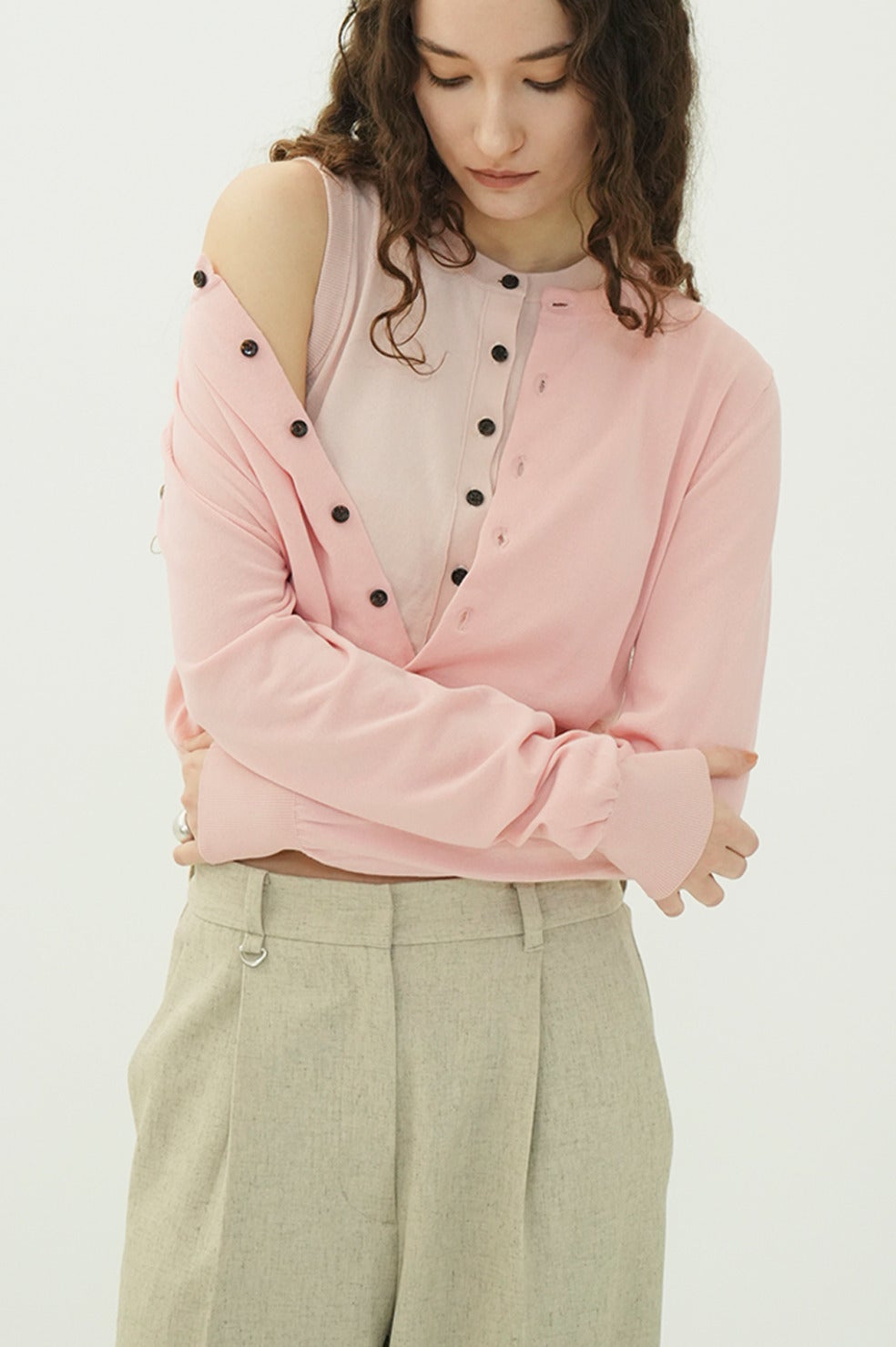気温の高い時期にはベストをメインに、カーディガンを腰に巻いてノースリーブとしても着用可能。一枚でさまざまな着こなしを楽しめます。