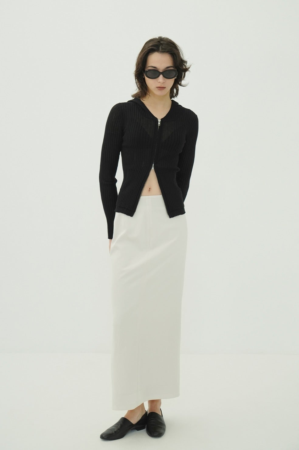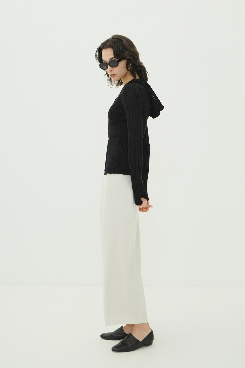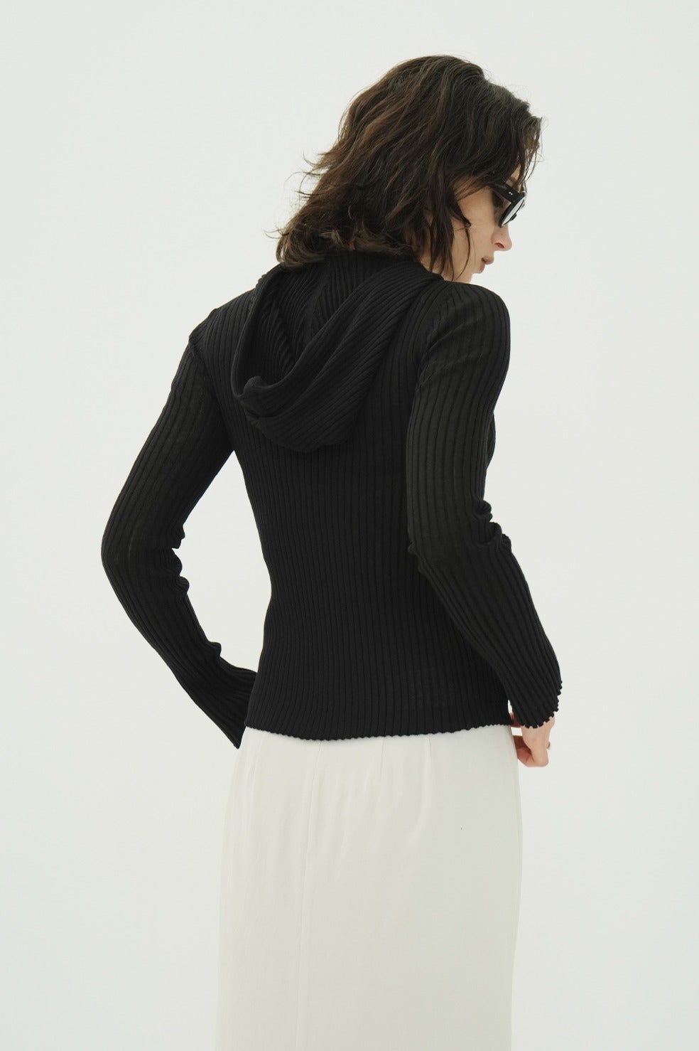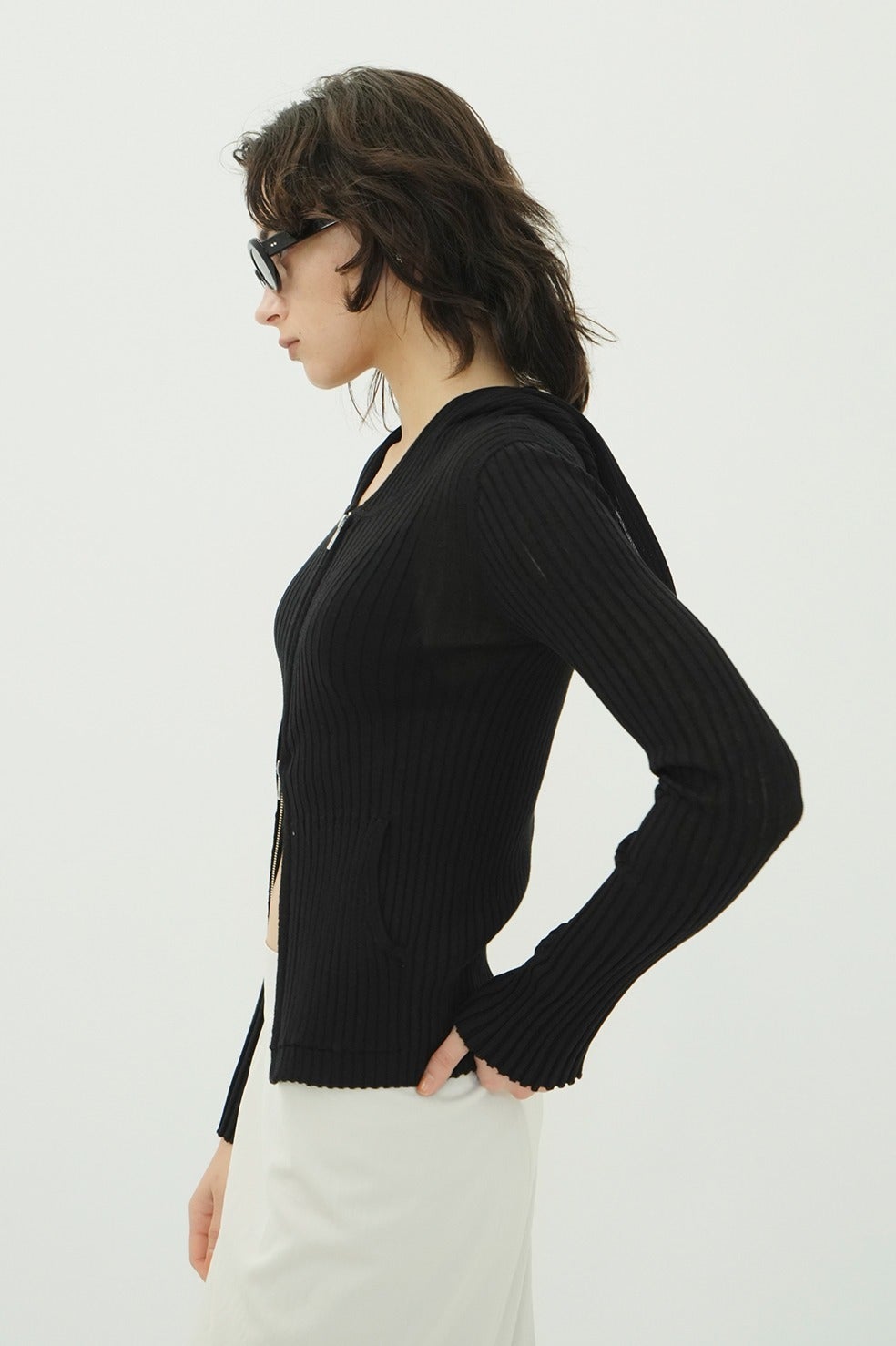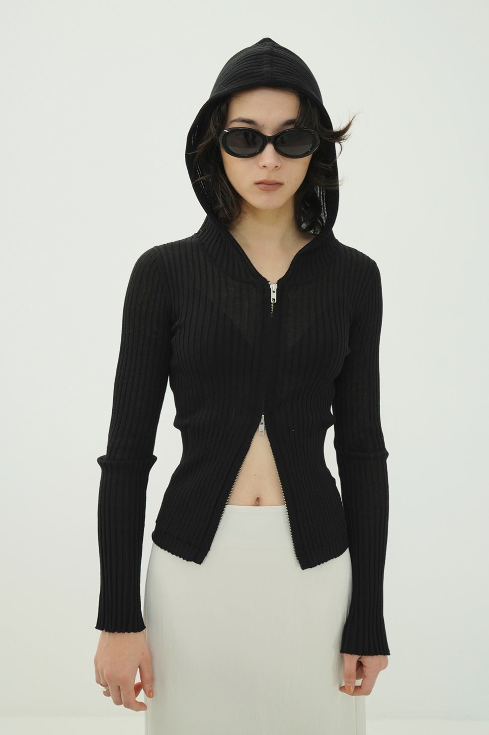 美しい編地が際立つ、コンパクトなシルエットのシアーニットフーディー。