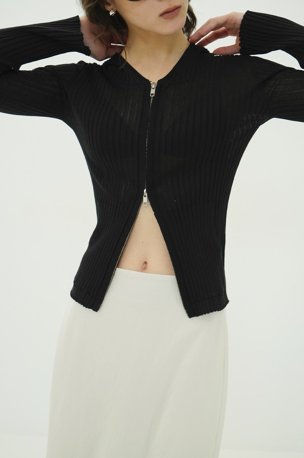 程よいシャリ感と透け感のバランスにこだわり、リブ編みがボディラインをすっきりと美しく引き立てます。