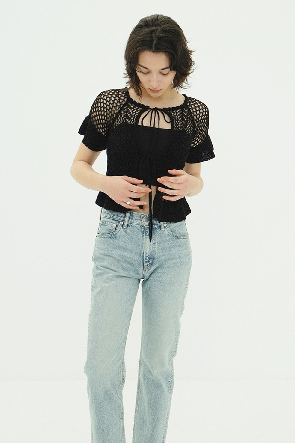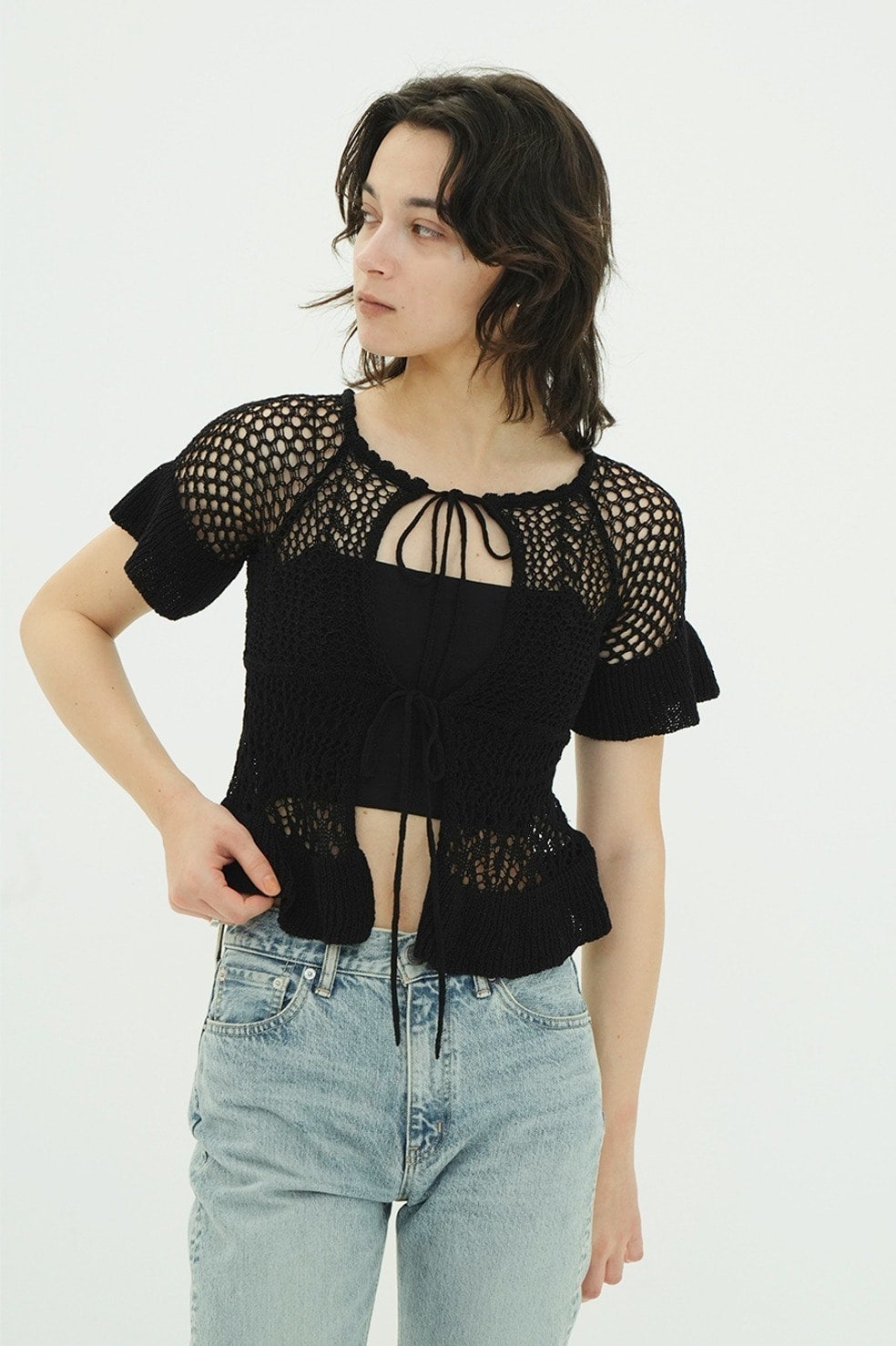 W FACE RIBBON CROCHET KNIT TOPS