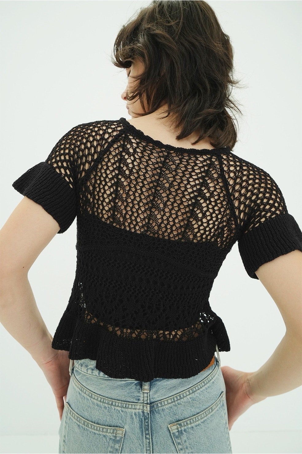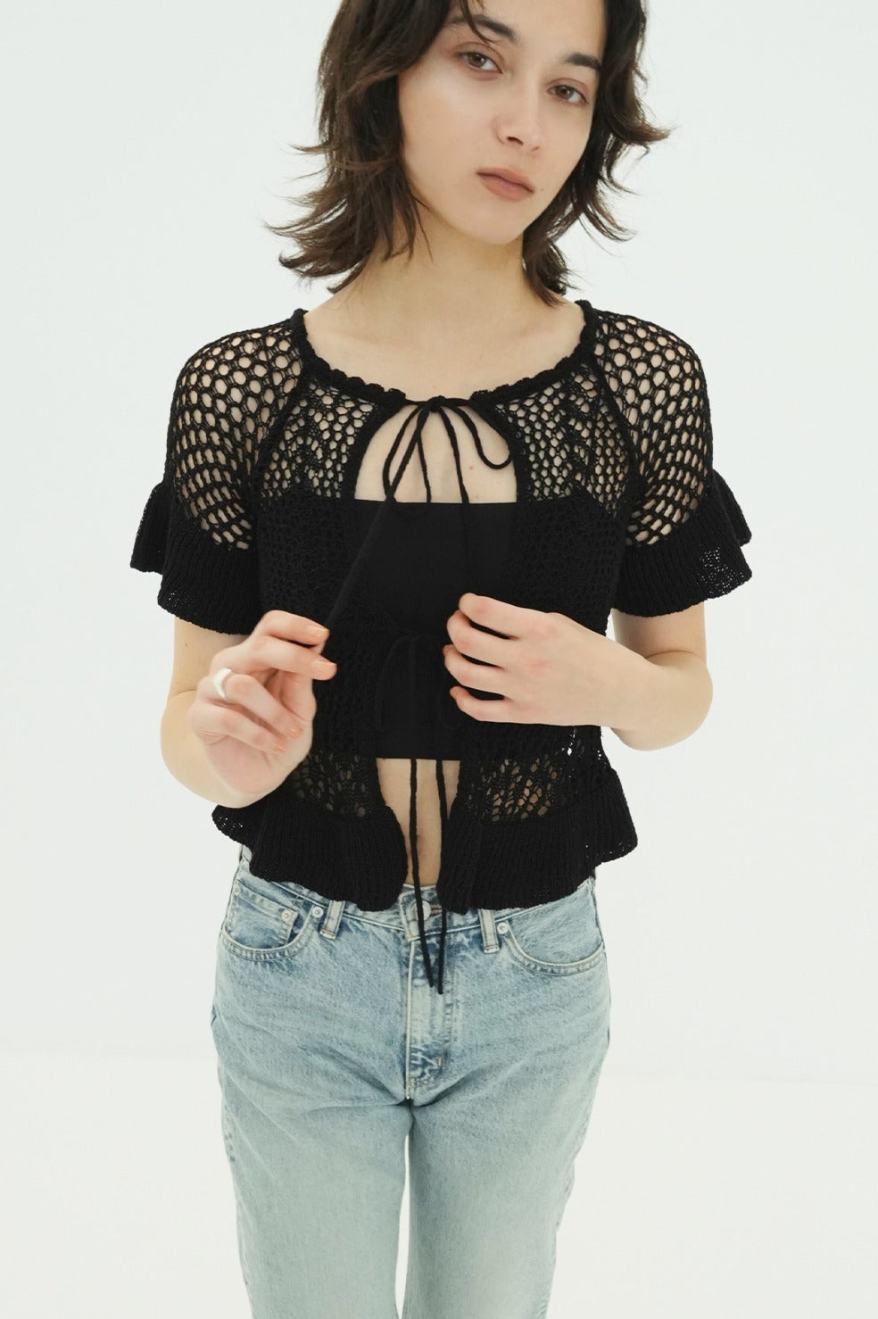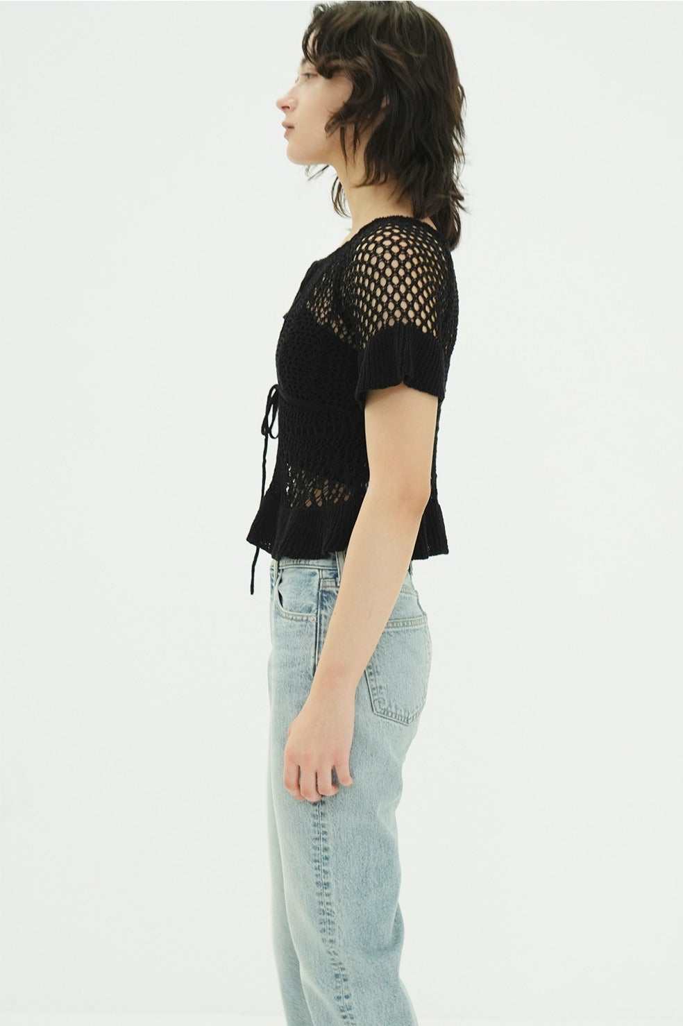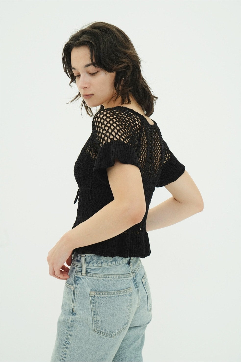 繊細な編み模様が生み出すコントラストの立体感と、程よい透け感がモードな印象を引き立てます。