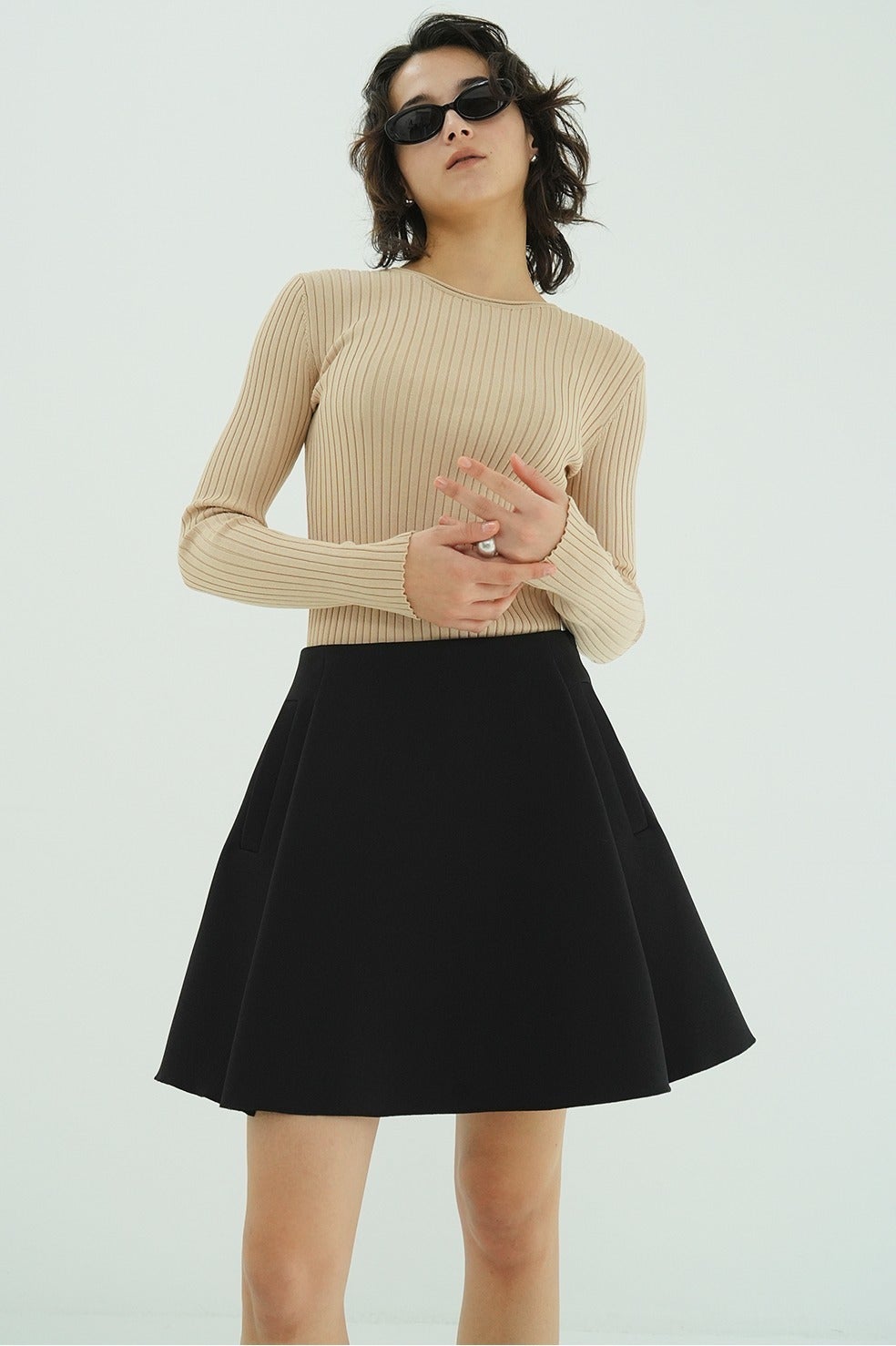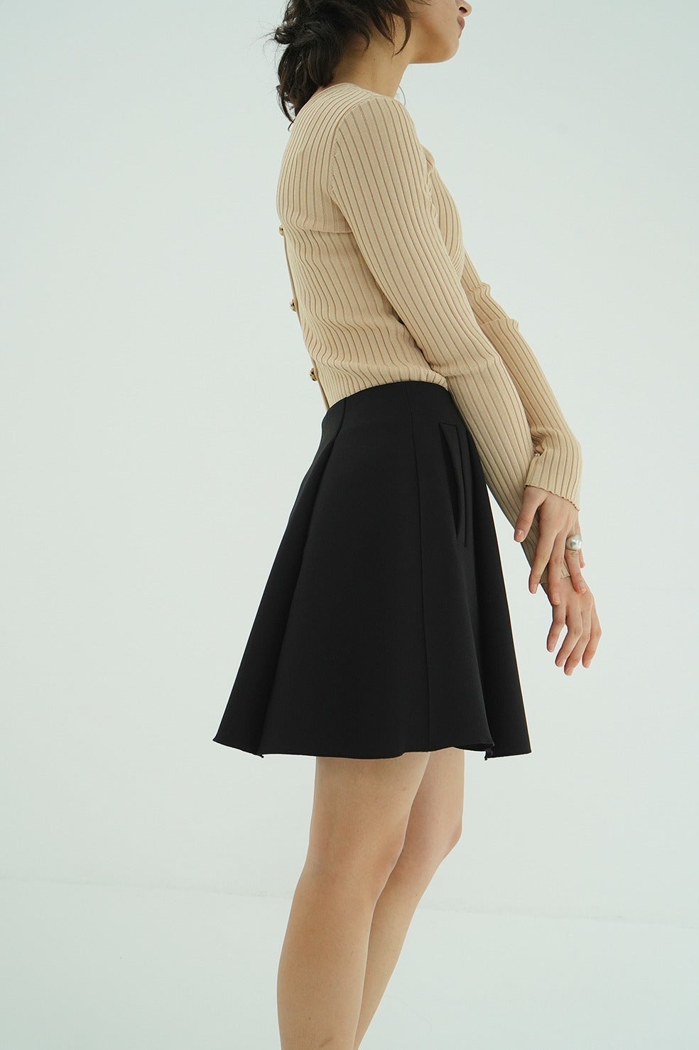 膨らみと落ち感を併せ持つ、ダブルジョーゼット生地を使用したフレアミニスカート。