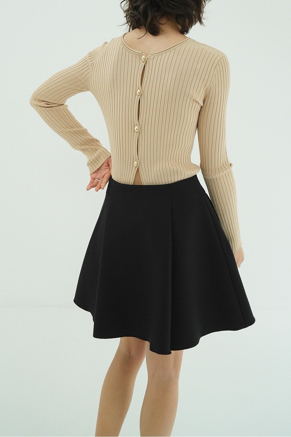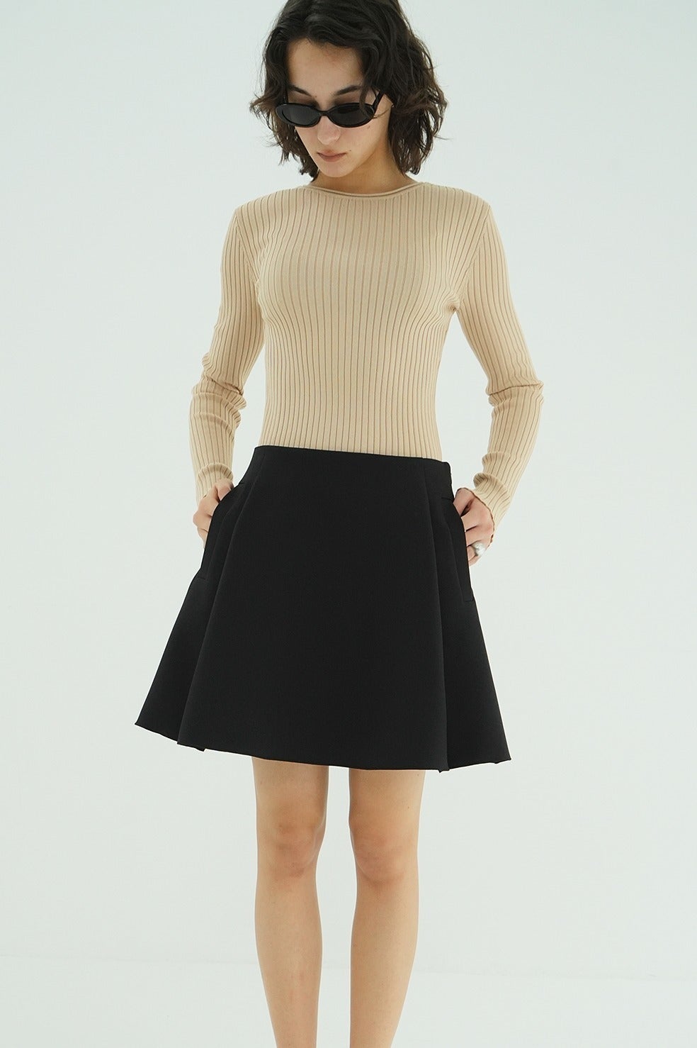 前後にタックを施すことで立体的なフレアラインを描き、女性らしさを引き立てながら、ローウエスト設定でモードなバランスを表現。ディテールには箱ポケットを配し、さりげないアクセントをプラスしています。