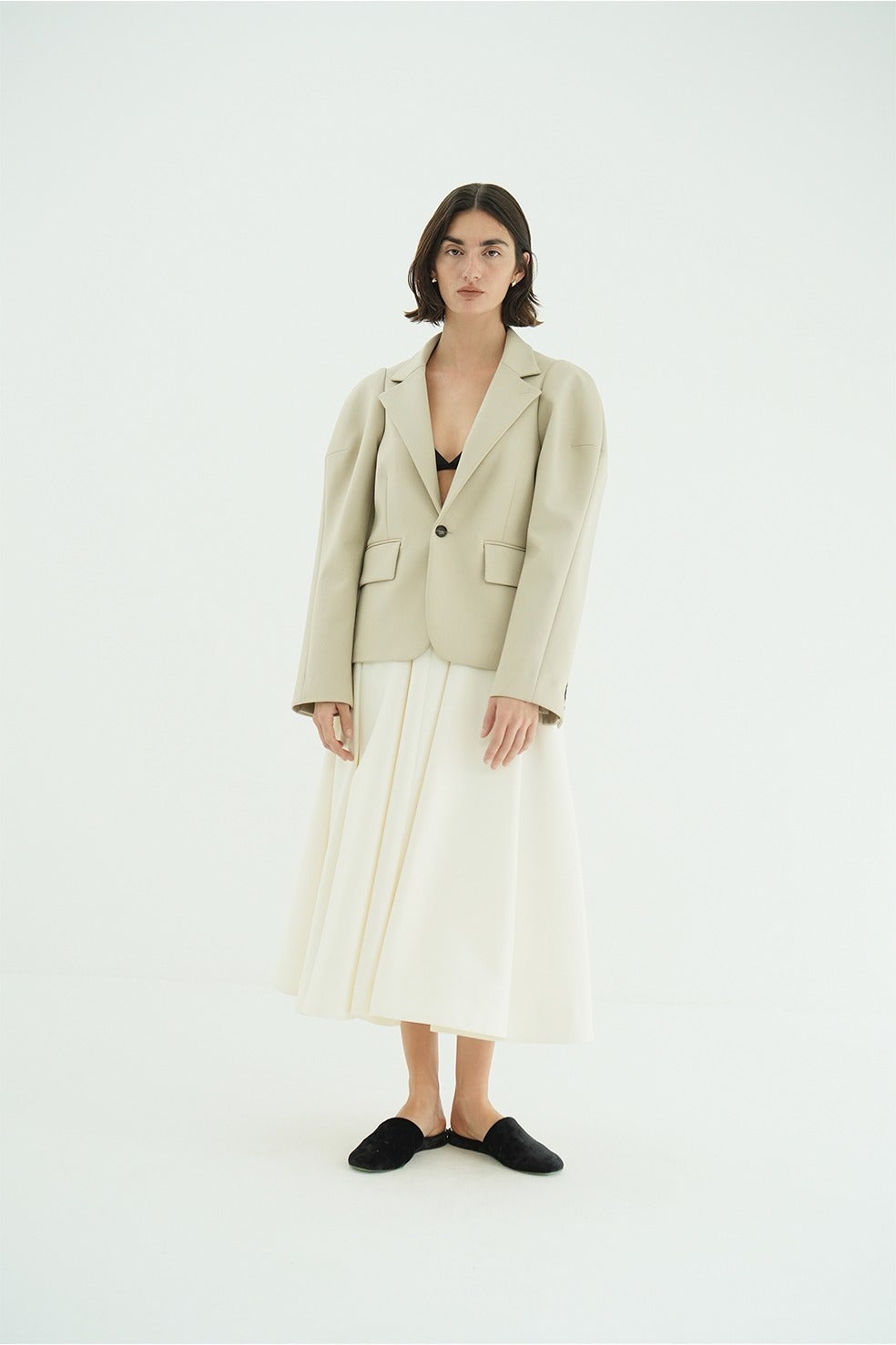 生地本来のハリとしなやかさを活かし、贅沢に施したフレアとタックギャザーで、立体感のあるシルエットを描きます。