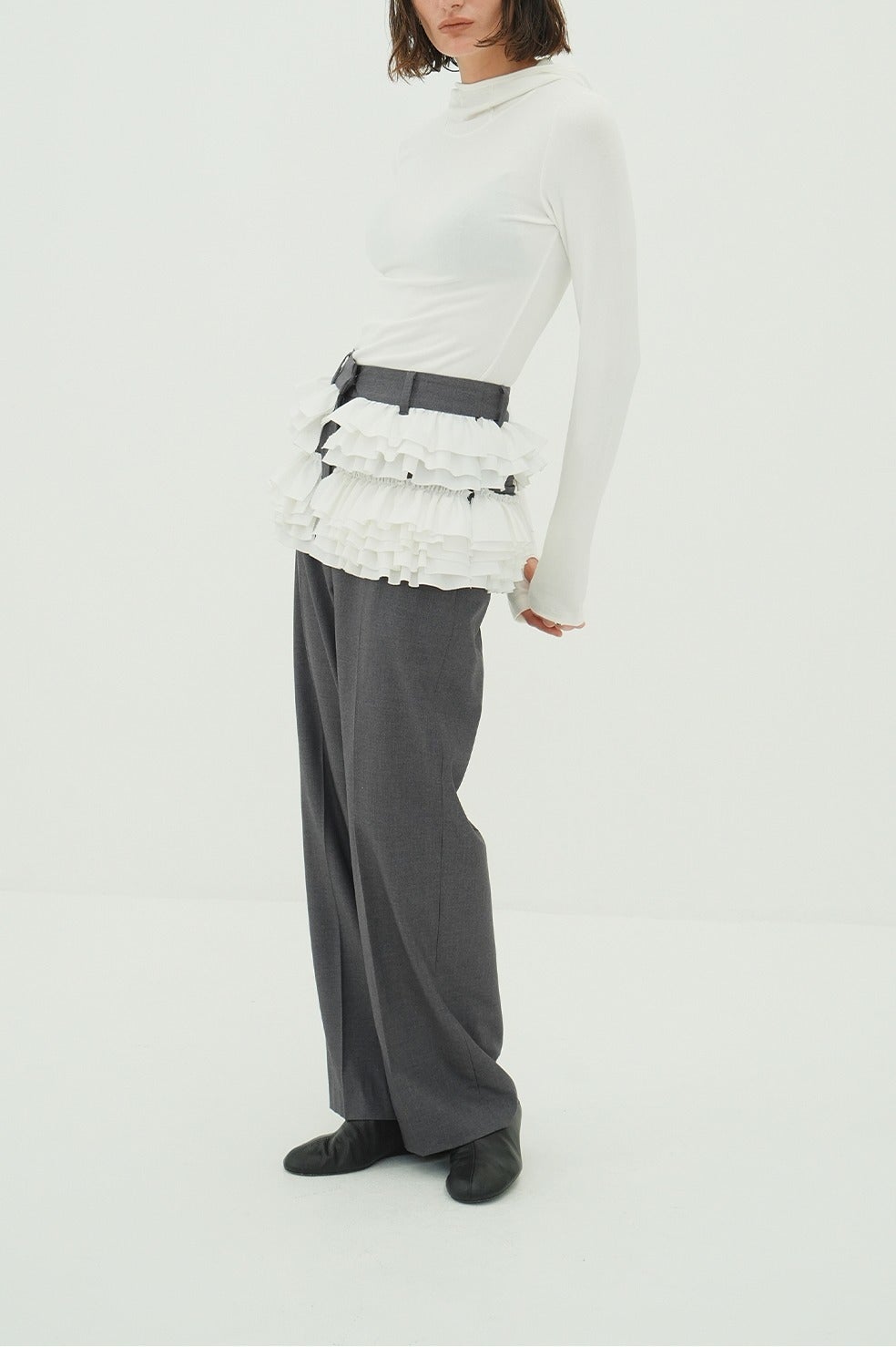 パンツはローウエストのストレートシルエットに。腰回りにたっぷりとあしらったフリルが、立体的で動きのある印象を引き立て、パンツとフリルで素材を切り替えることで、奥行きのあるデザインに仕上げました。