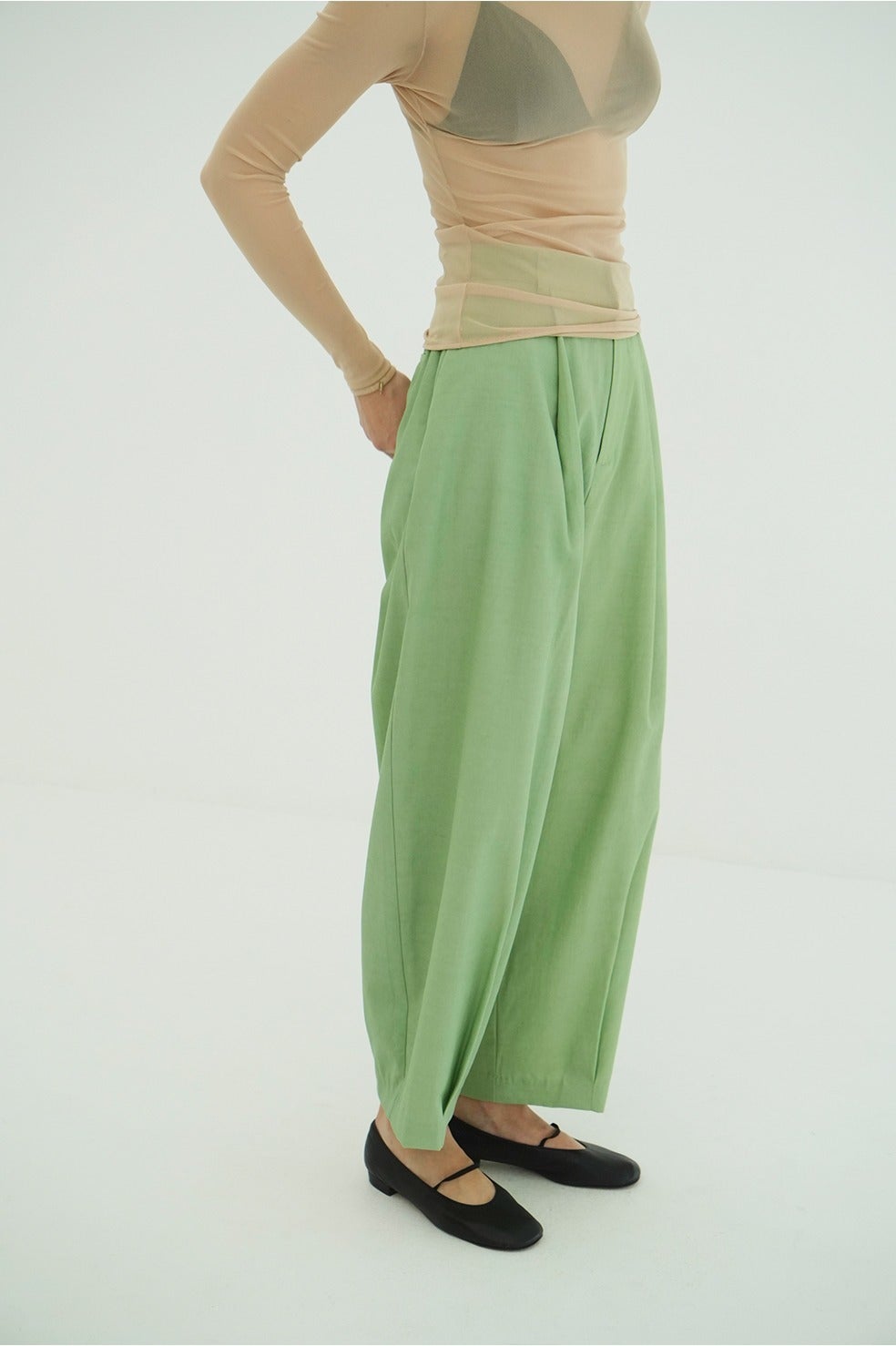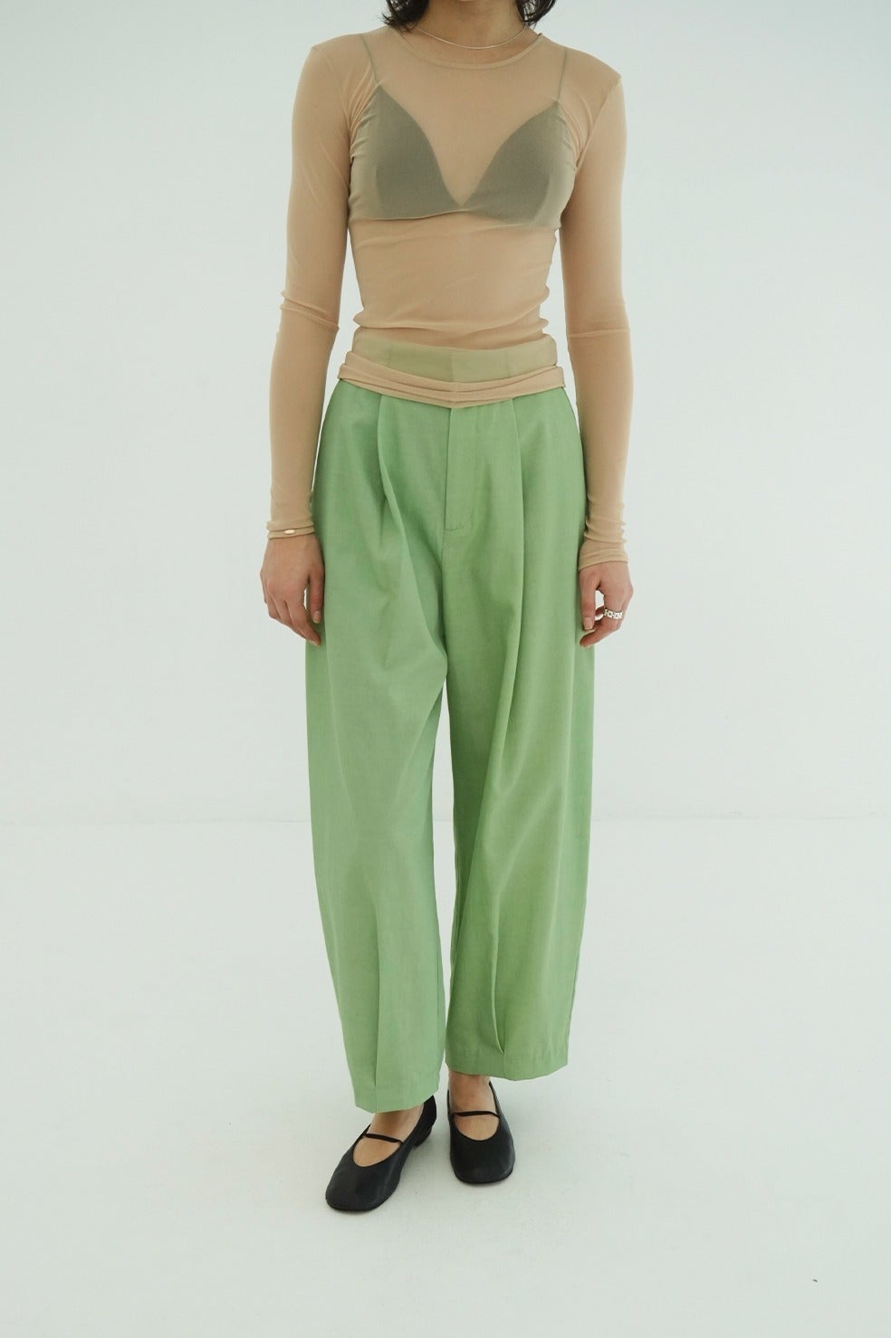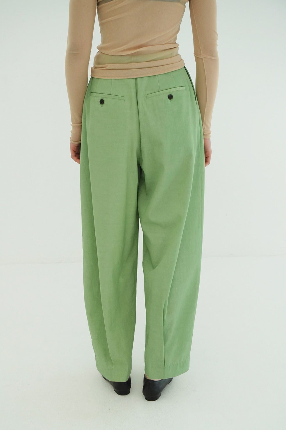 わたりにゆとりを持たせているため動きやすさも◎。裾に施したタックがニュアンスのある立体感を生み出した、存在感のあるパンツです。