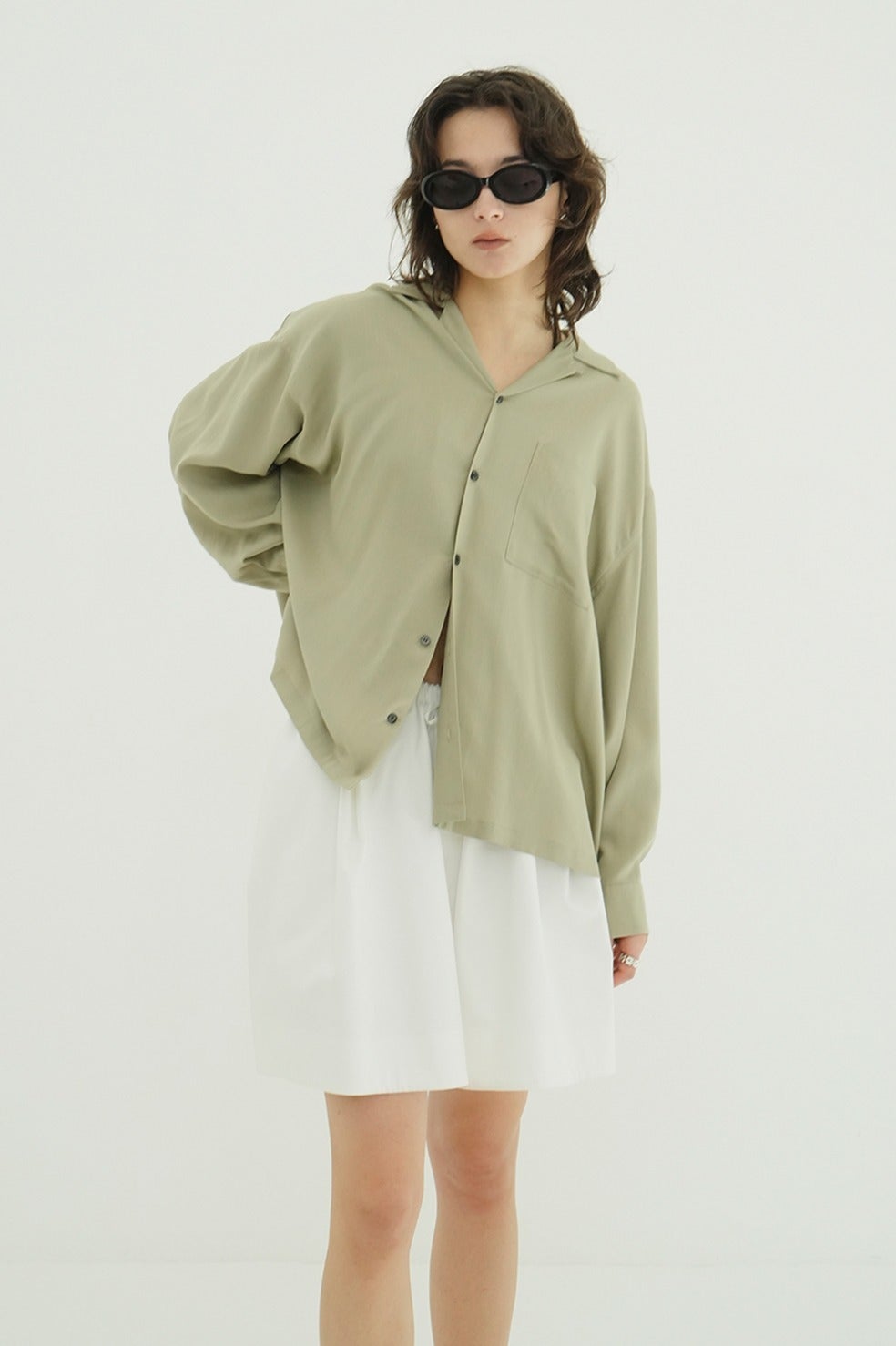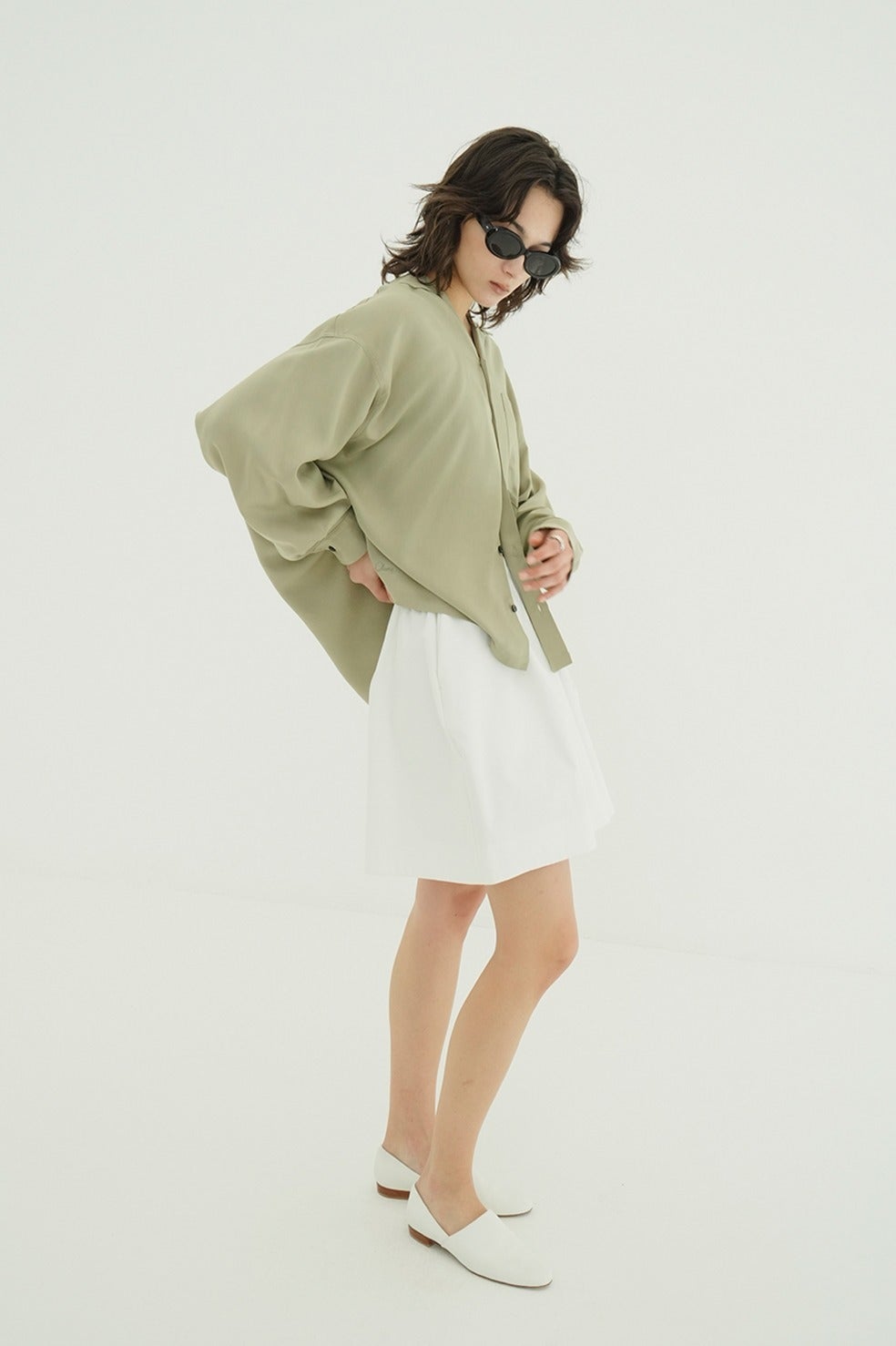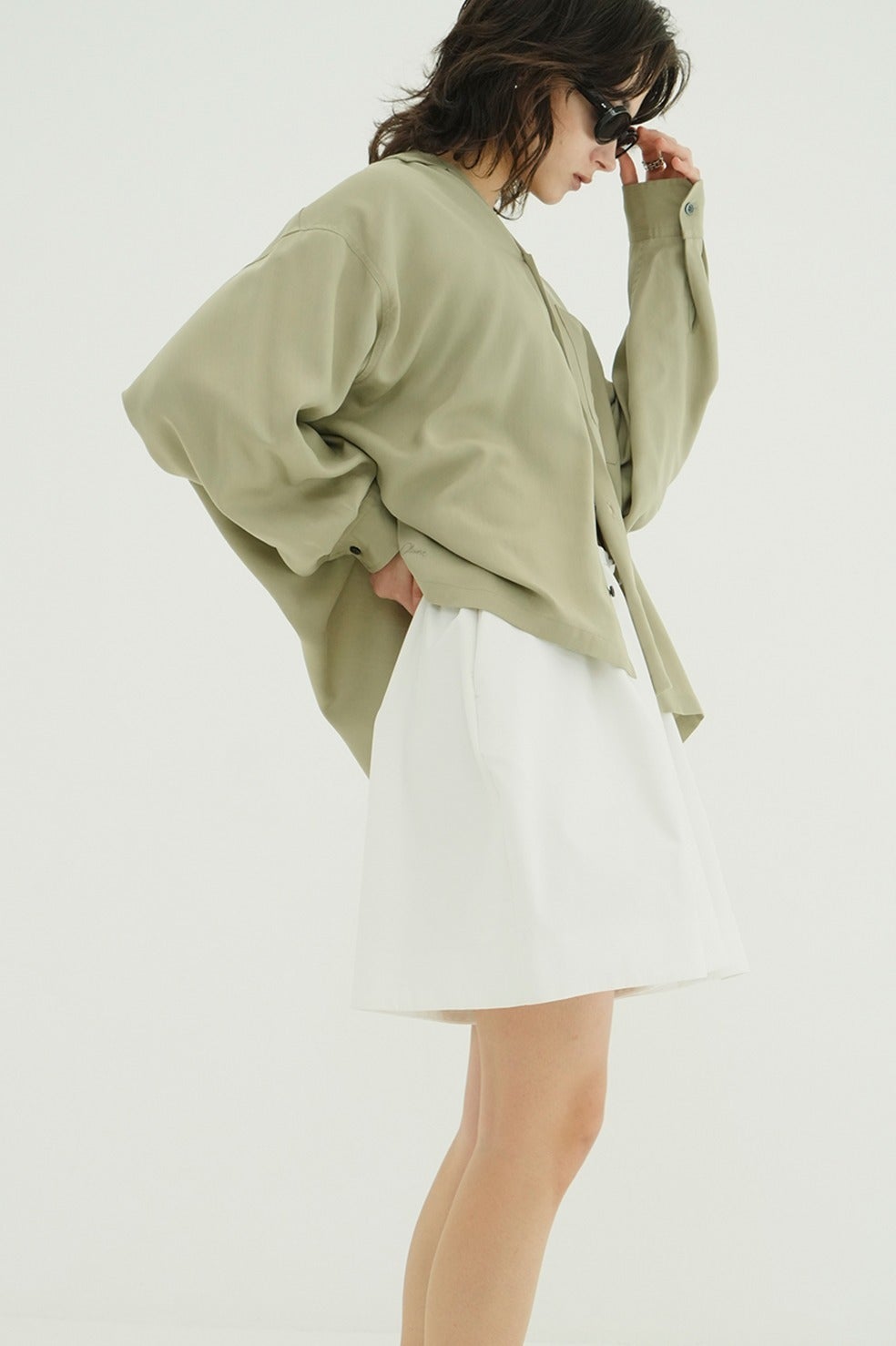 甘さを抑えたローウエストバランスと、落ち着いた丈感がモードな印象を引き立てます。スタイリングに取り入れやすく、バランスの取りやすい一着です。