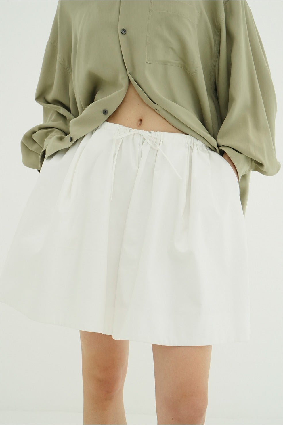 タックとギャザーを施した立体的なフォルムが、シルエットに存在感を与えます。ウエストはぐるりゴム仕様で、ドローコードによるサイズ調整も可能。