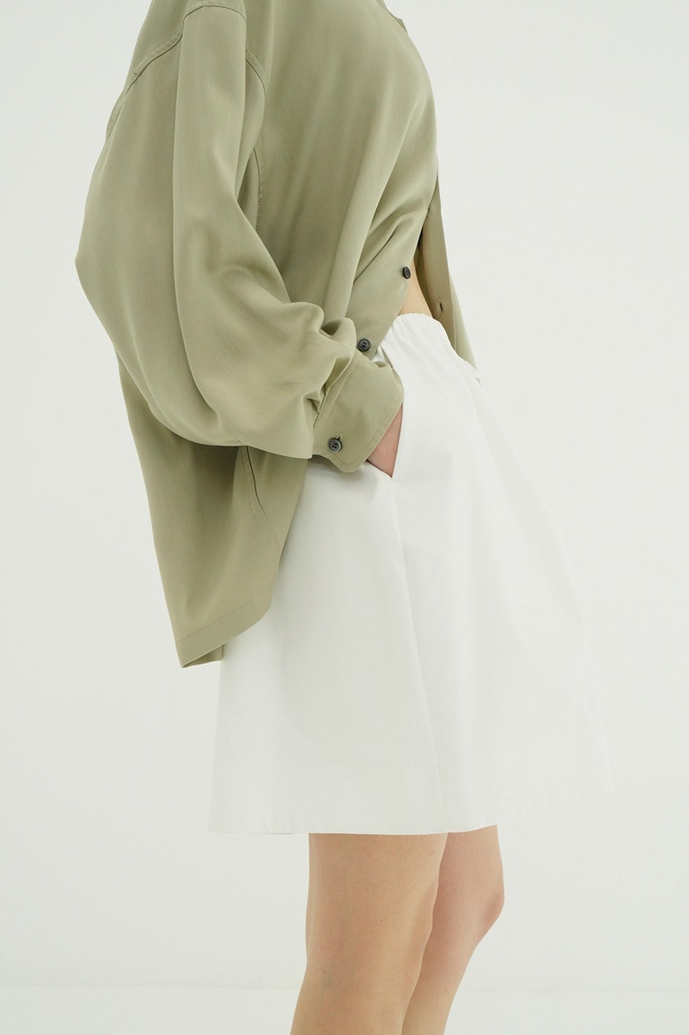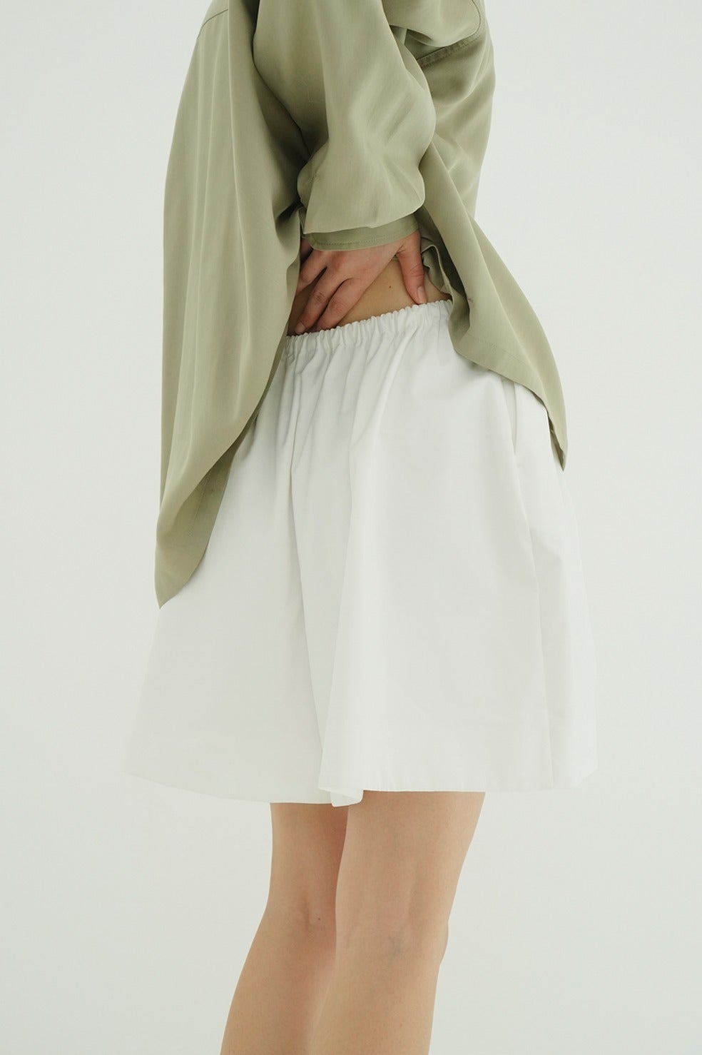 マットな綿混素材にカットソーをボンディングし、滑らかなハリ感が際立つローウエストフレアショートパンツ。
