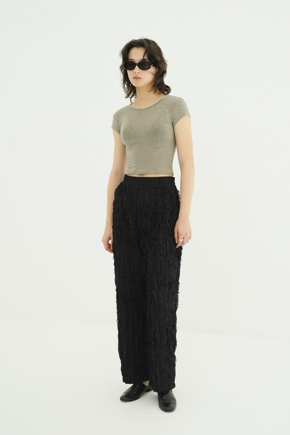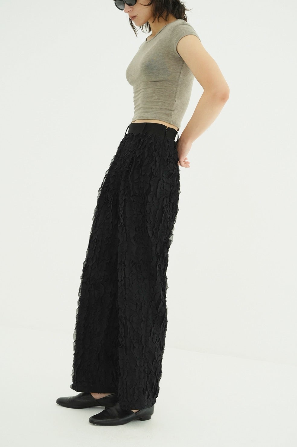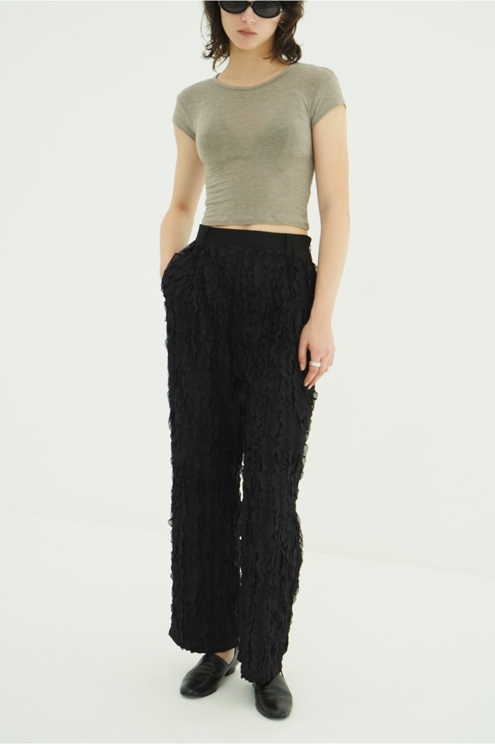 表情感のあるほのかなシアー素材に、程よいハリのあるフリルを太番手であしらったストレートパンツ。