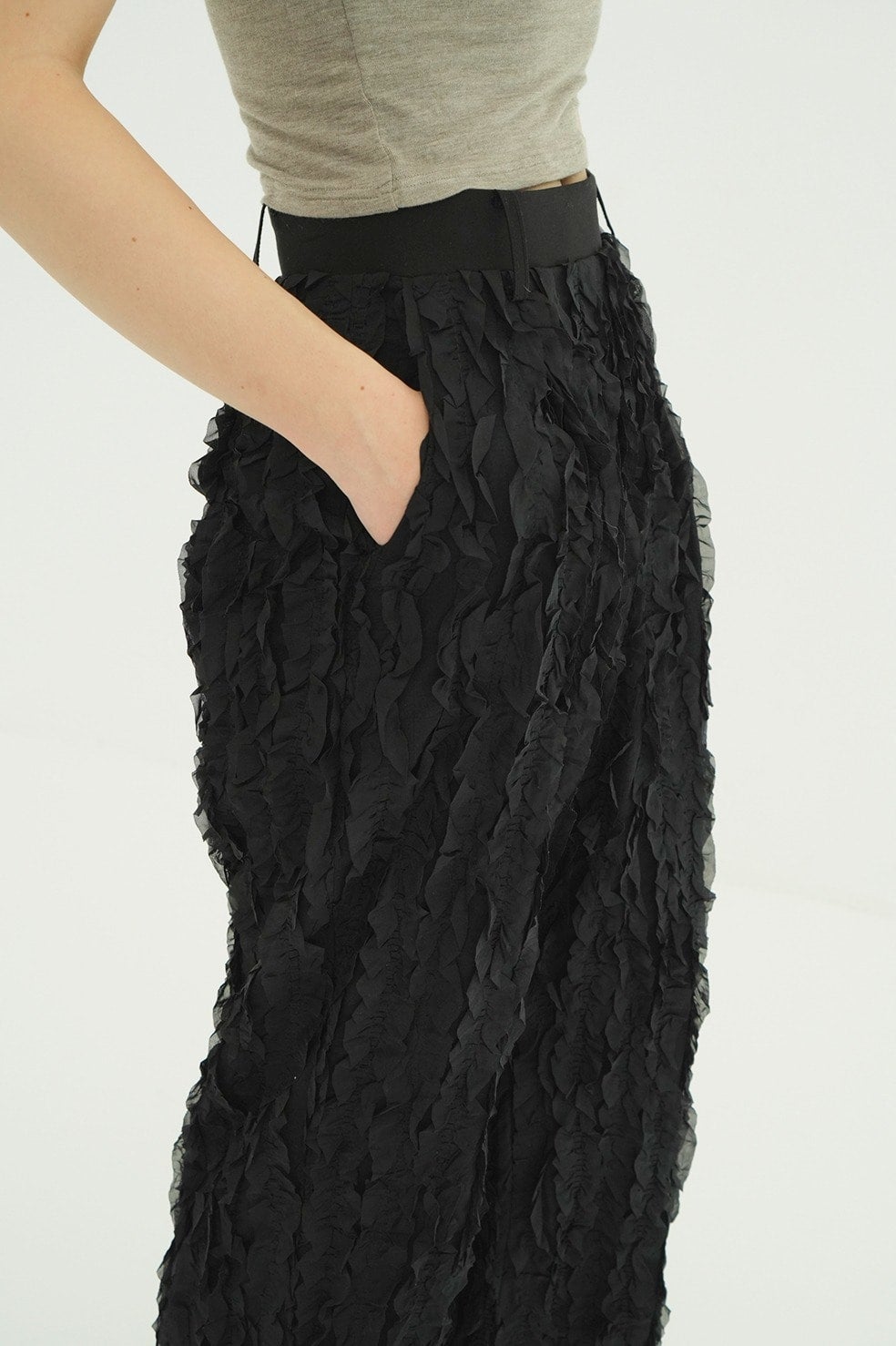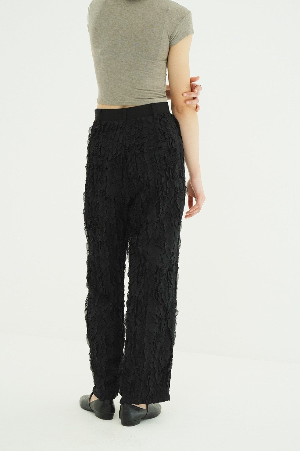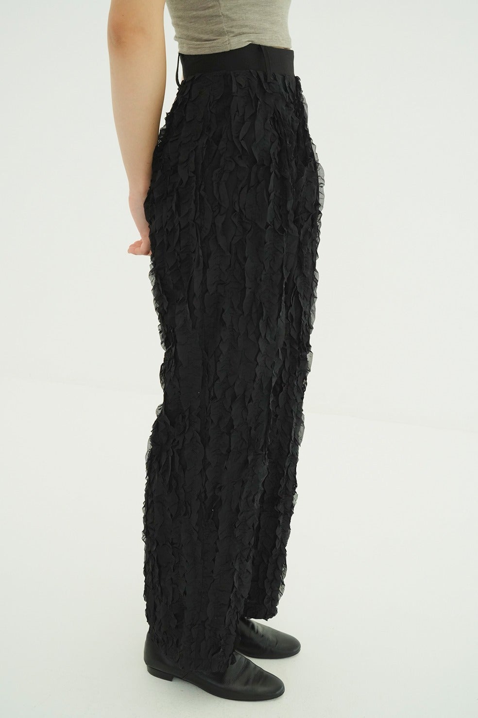 表情感のあるほのかなシアー素材に、程よいハリのあるフリルを太番手であしらったストレートパンツ。