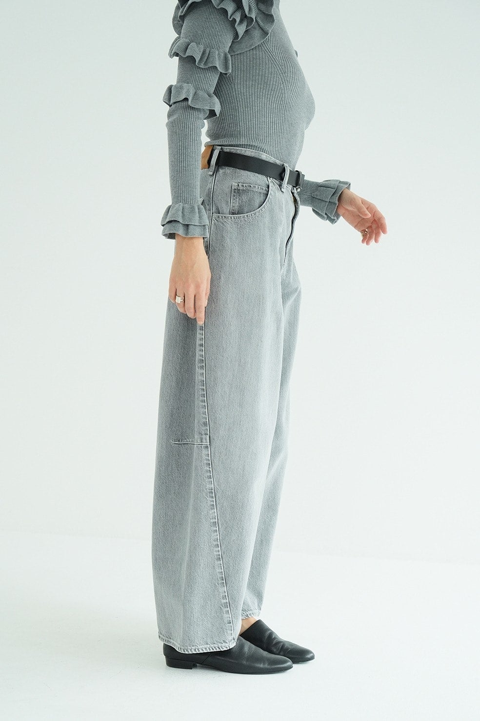 カジュアルにもモダンにも合わせやすい一本で、程よいヴィンテージ加工を施したブルーと、ライトグレーの2色展開です。