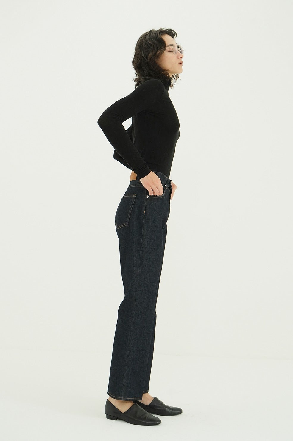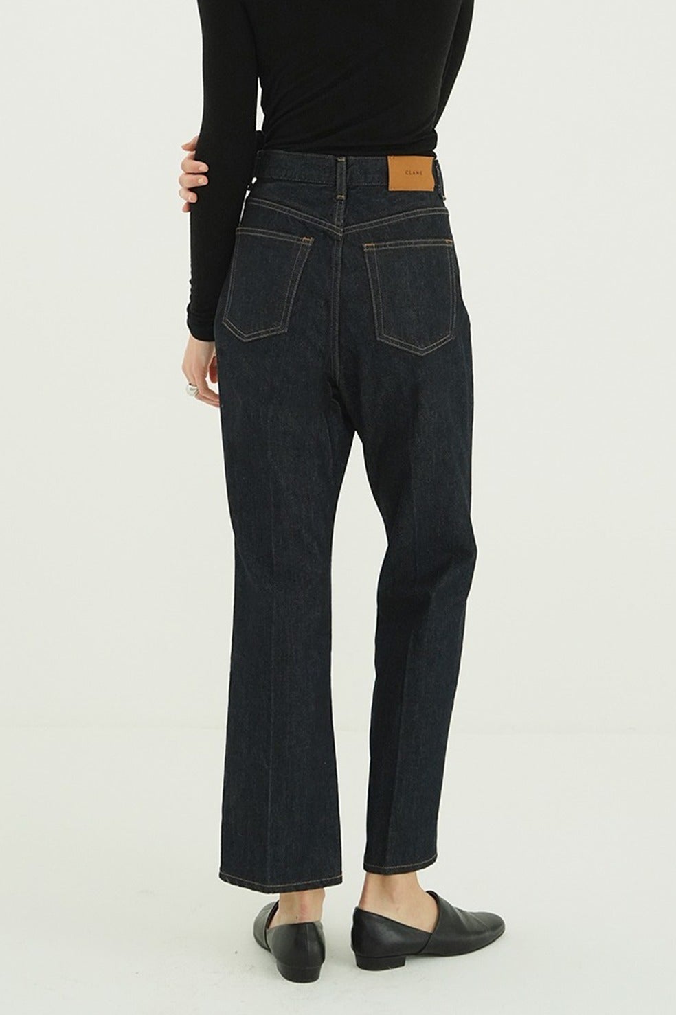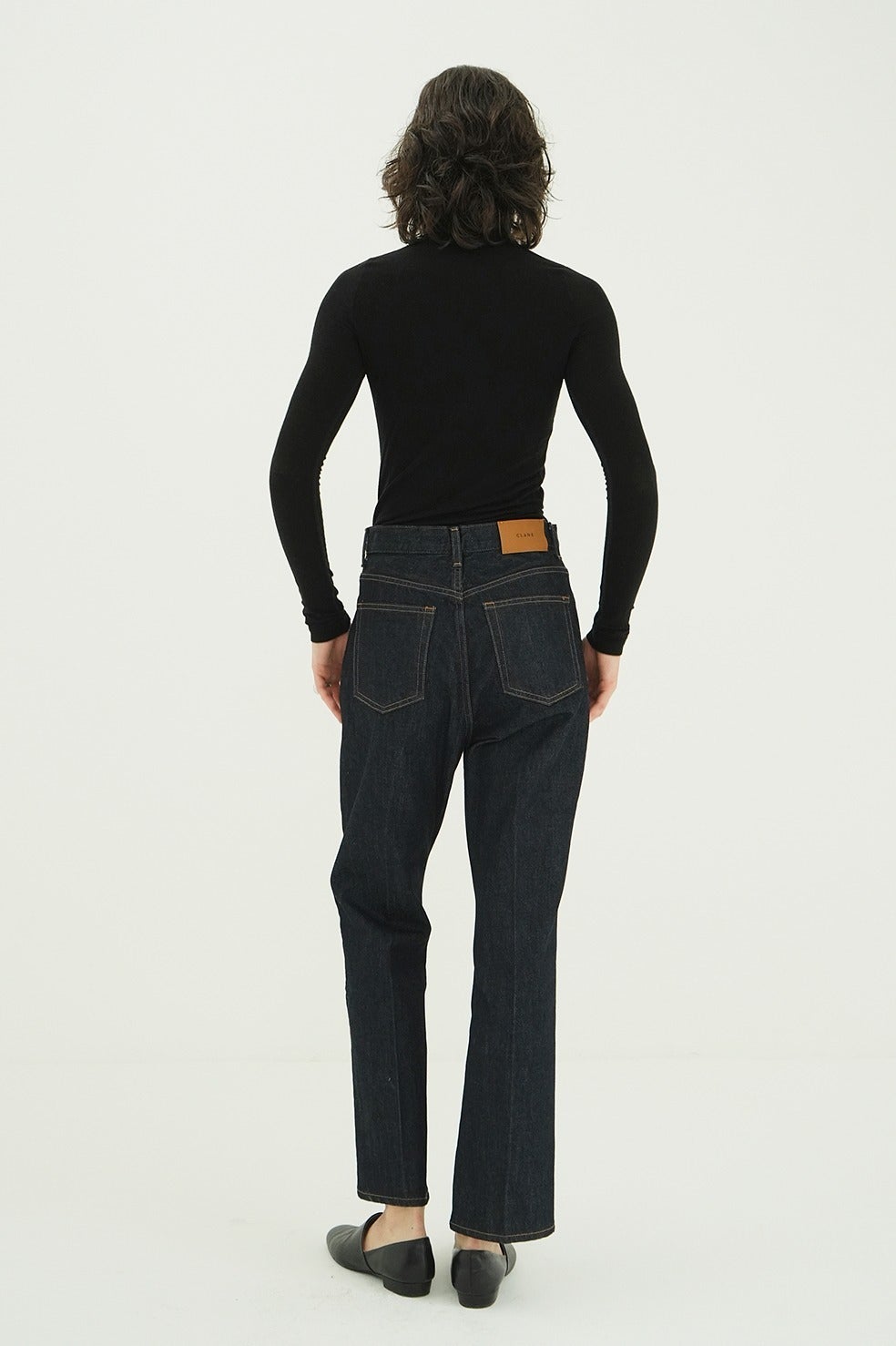腰回りはコンパクトなシルエットですっきりさせ、真っ直ぐ入ったセンタープレスが足を長く見せてくれます。ウエストの位置も高く設定してあるので、スタイルアップ効果も。センタープレスを入れる事で綺麗めな印象で着用いただけます。生地は12.25ozの程よい肉感のあるデニムを使用しました。
