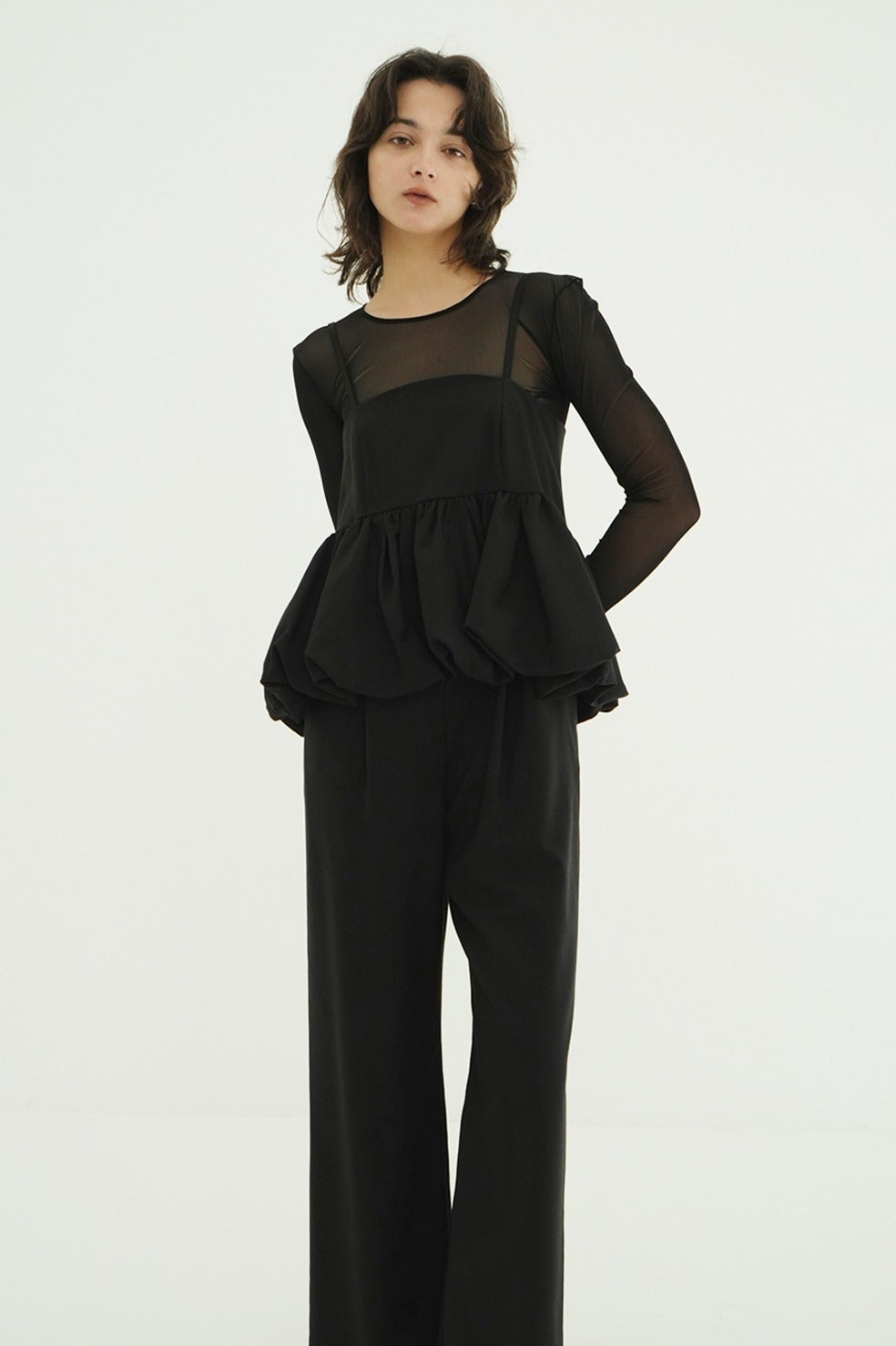 高めの位置に施したペプラムと、後ろにかけて描くカーブラインが印象的で、スタイルアップ効果があります。