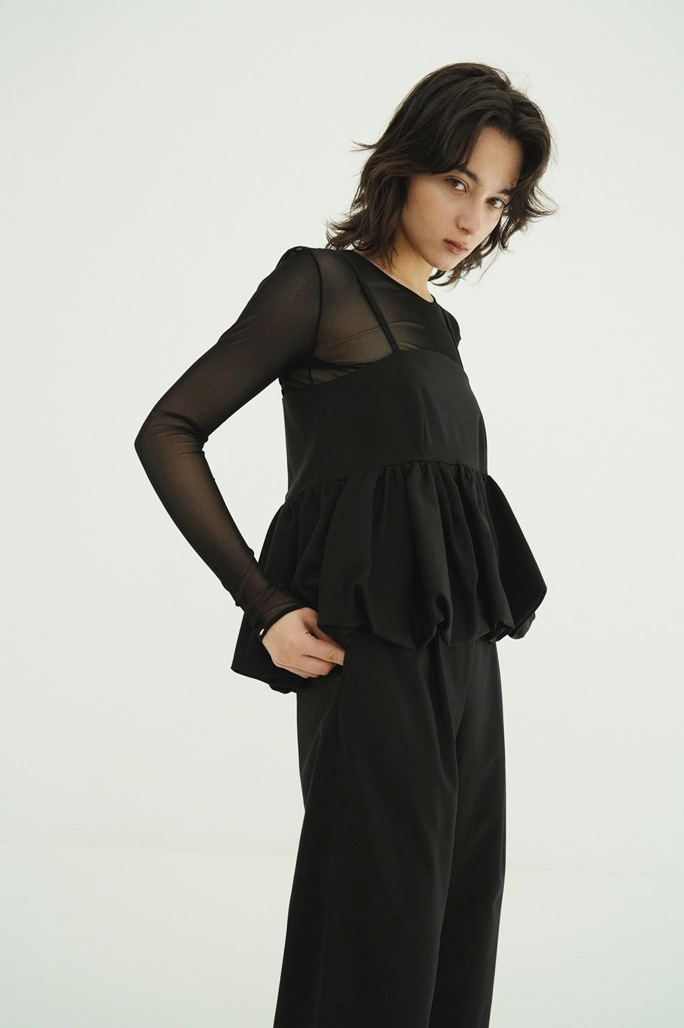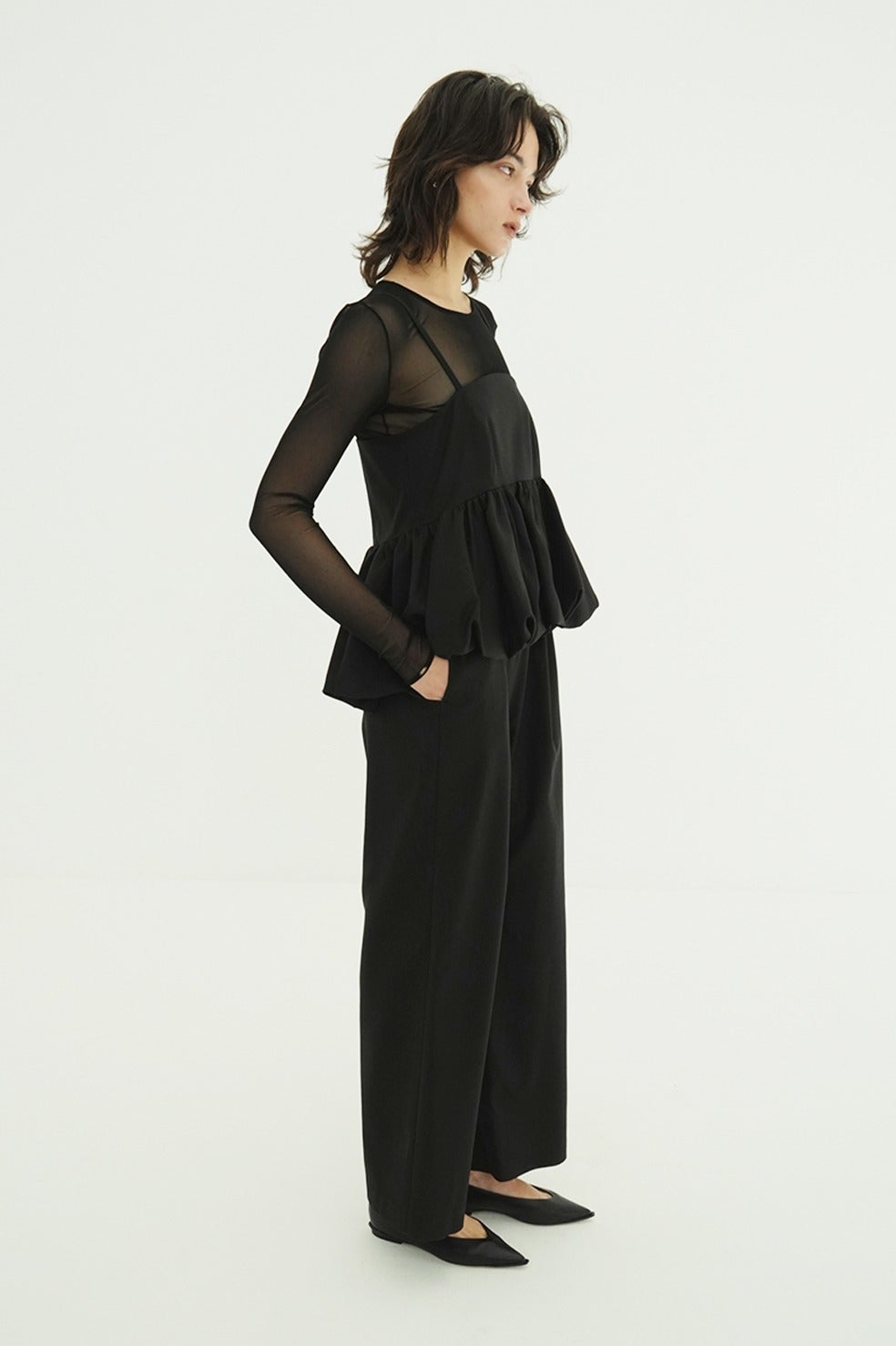 ストラップは長さ調整が可能で、インナーを合わせたレイヤードスタイルから一枚での着用まで幅広く対応。程よくゆとりのあるパンツシルエットが抜け感をプラスし、シーズンを通して活躍する一着です。