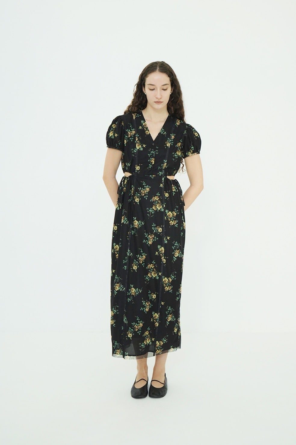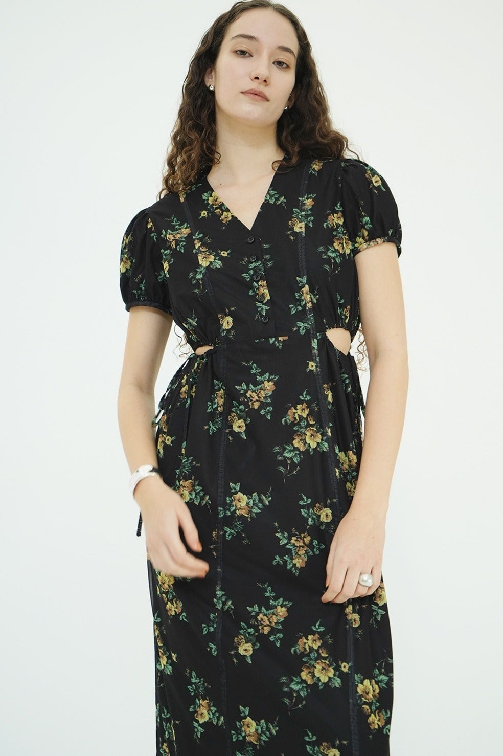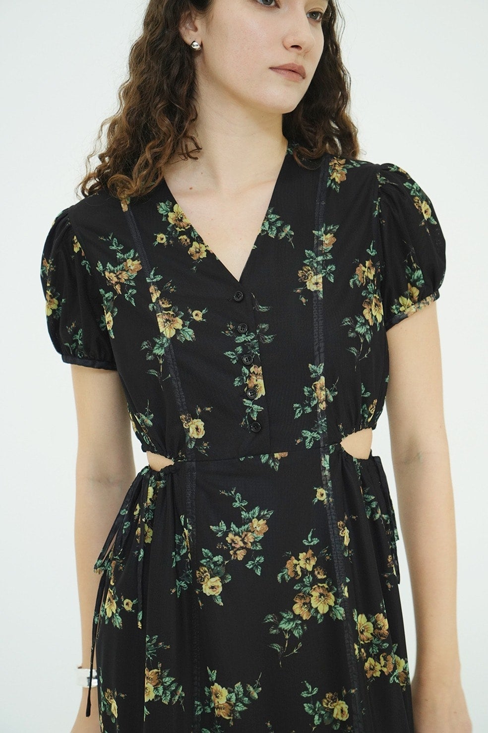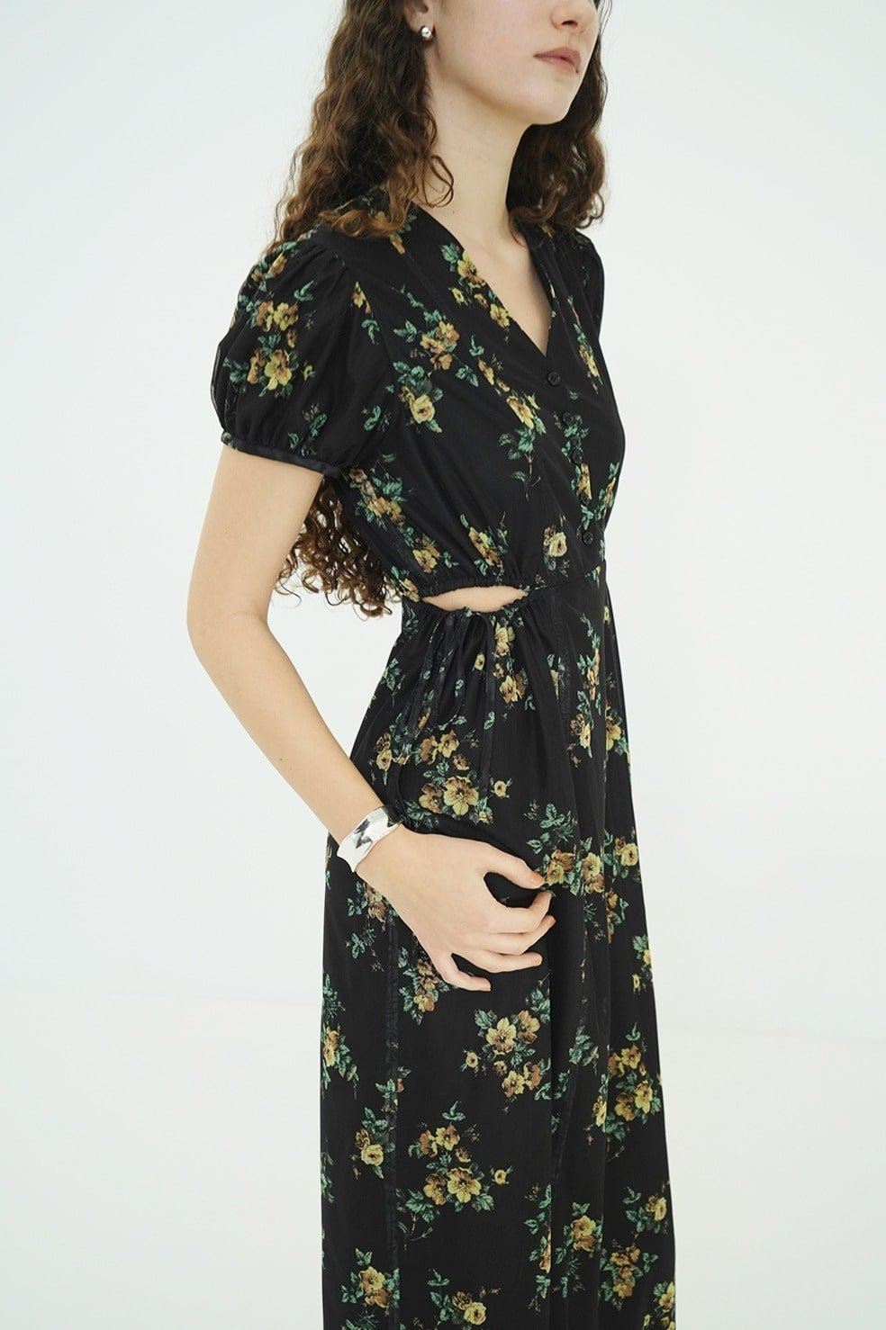 鎖骨を美しく見せるVラインに、サイドホールディテールを加えることで、甘さを抑えた大人な表情に。サイドホールはドローストリングで調整が可能。すっきりとしたIラインシルエットと高めのウエスト位置が、自然なスタイルアップを演出。パフスリーブが華やかさと柔らかさをプラスし、女性らしいムードを高めます。