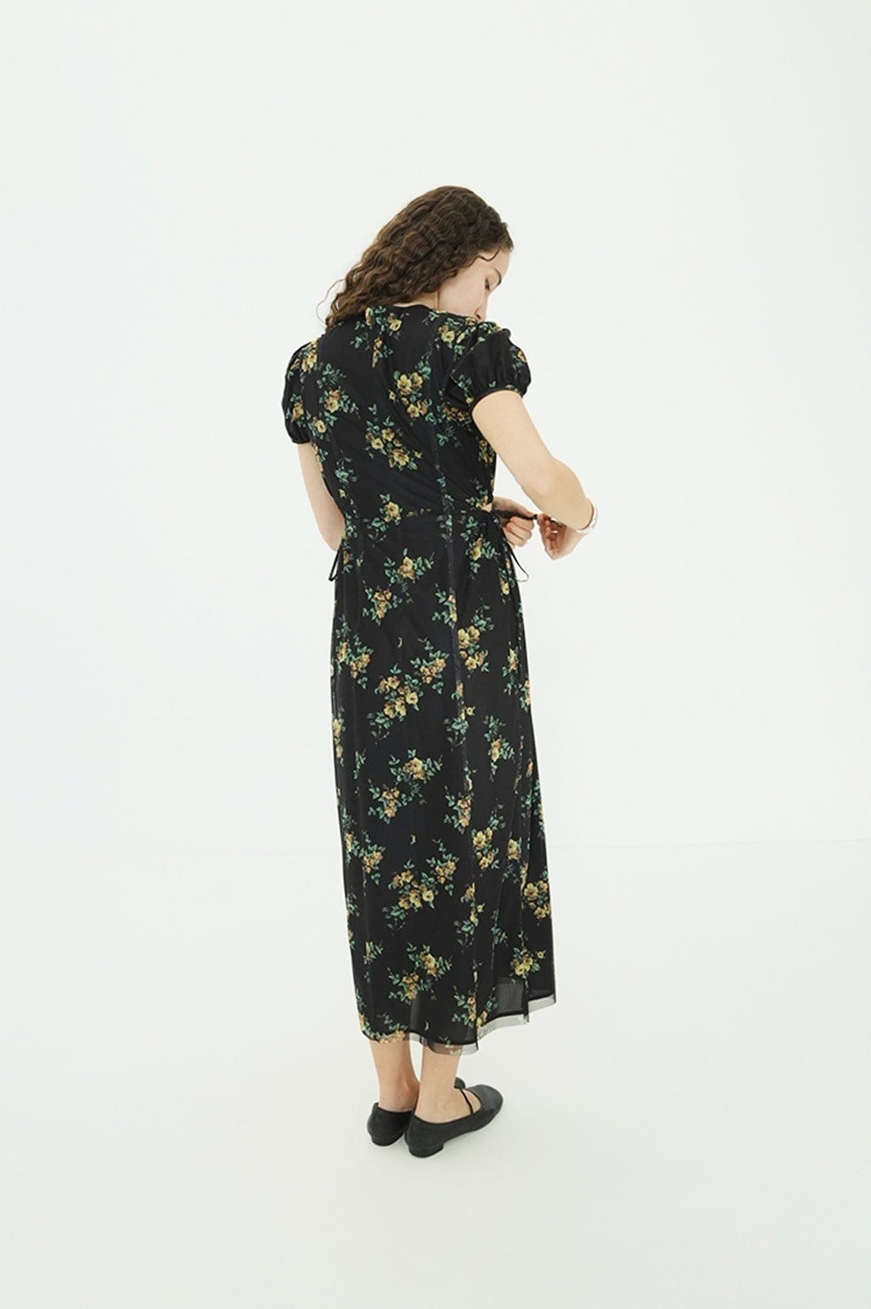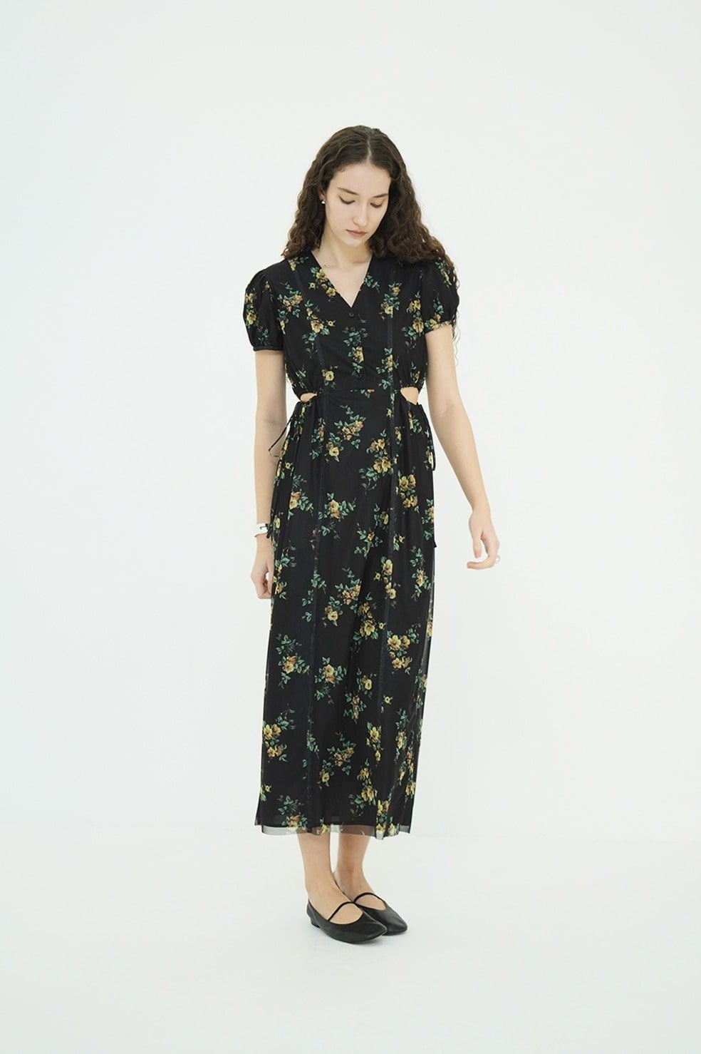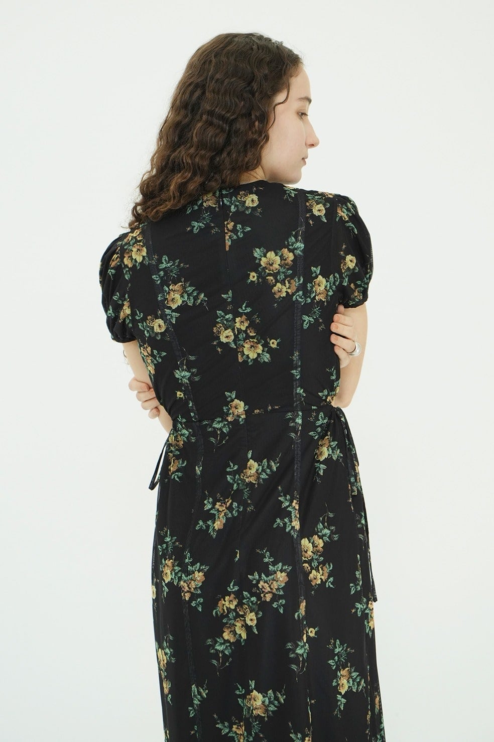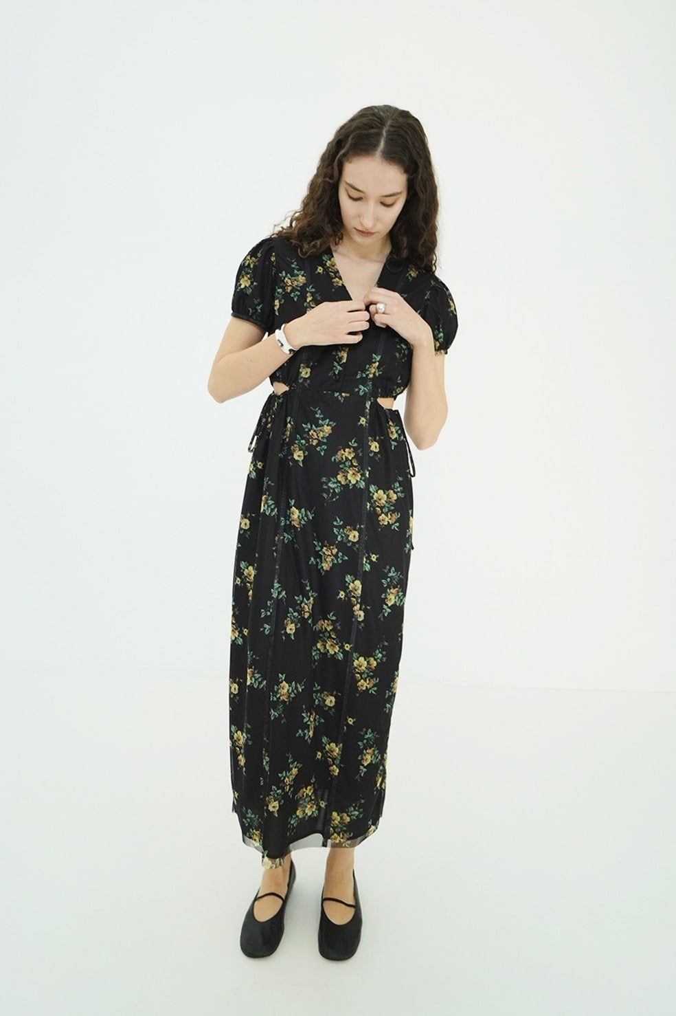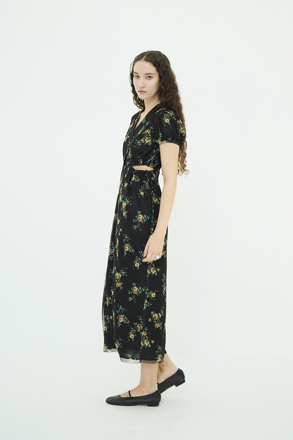 鎖骨を美しく見せるVラインに、サイドホールディテールを加えることで、甘さを抑えた大人な表情に。サイドホールはドローストリングで調整が可能。すっきりとしたIラインシルエットと高めのウエスト位置が、自然なスタイルアップを演出。パフスリーブが華やかさと柔らかさをプラスし、女性らしいムードを高めます。
