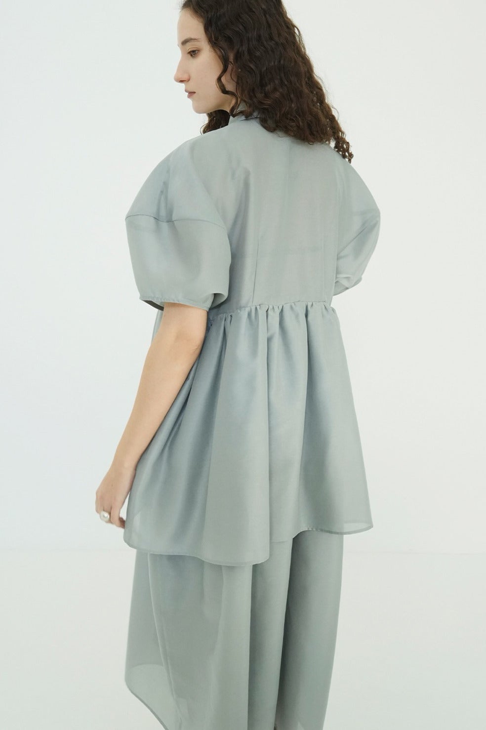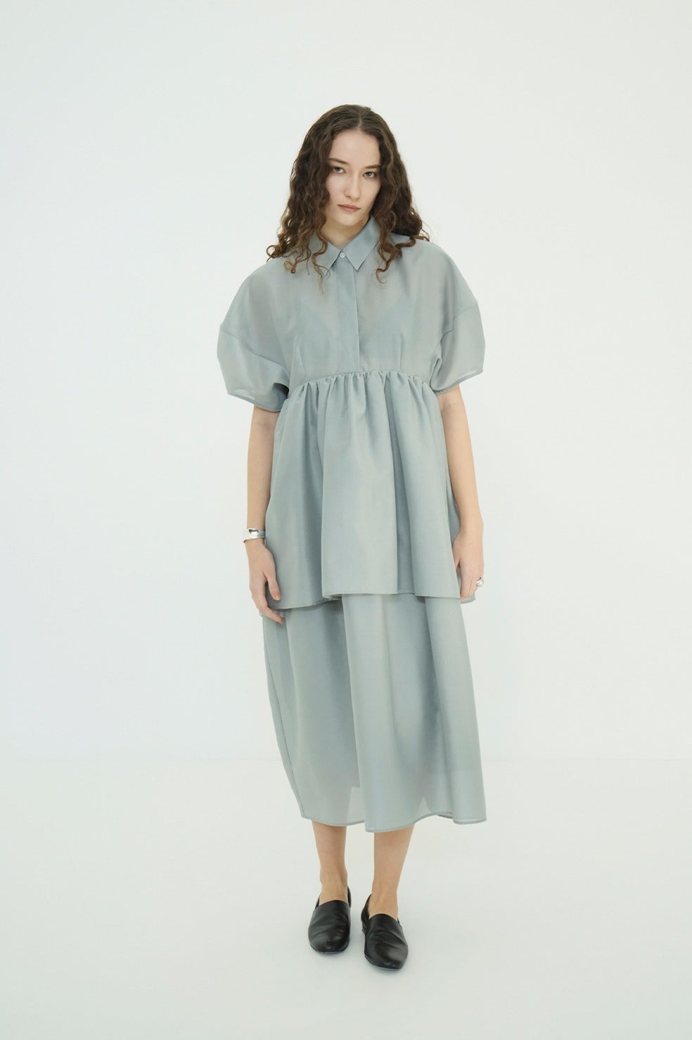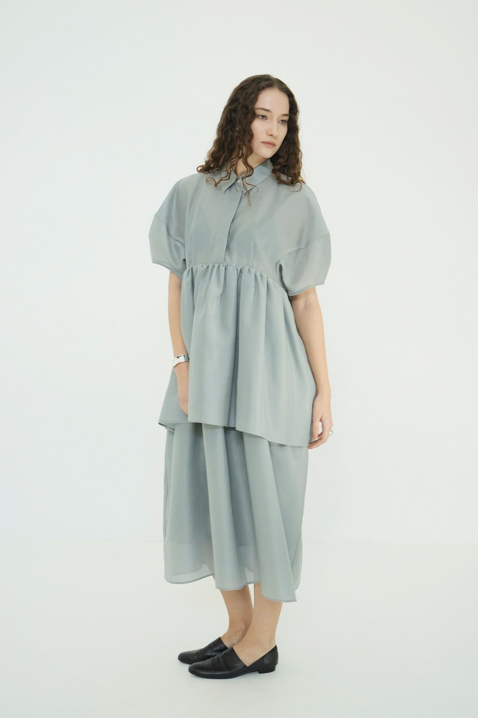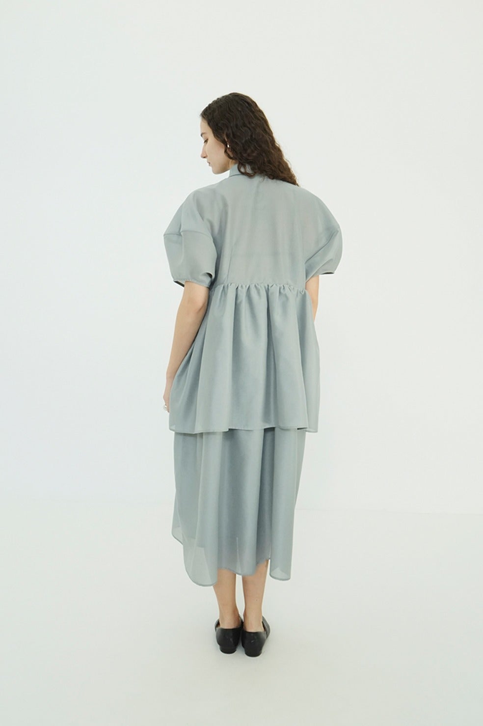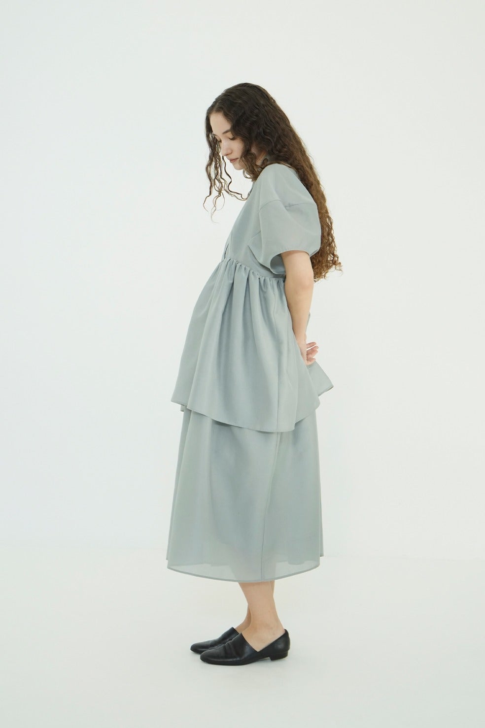 スカート部分はティアードになっており、動く度にふんわりと広がる美しいシルエットがポイント。丸みのあるフォルムスリーブがCLANEらしく、二の腕もすっきりとカバーしてくれます。