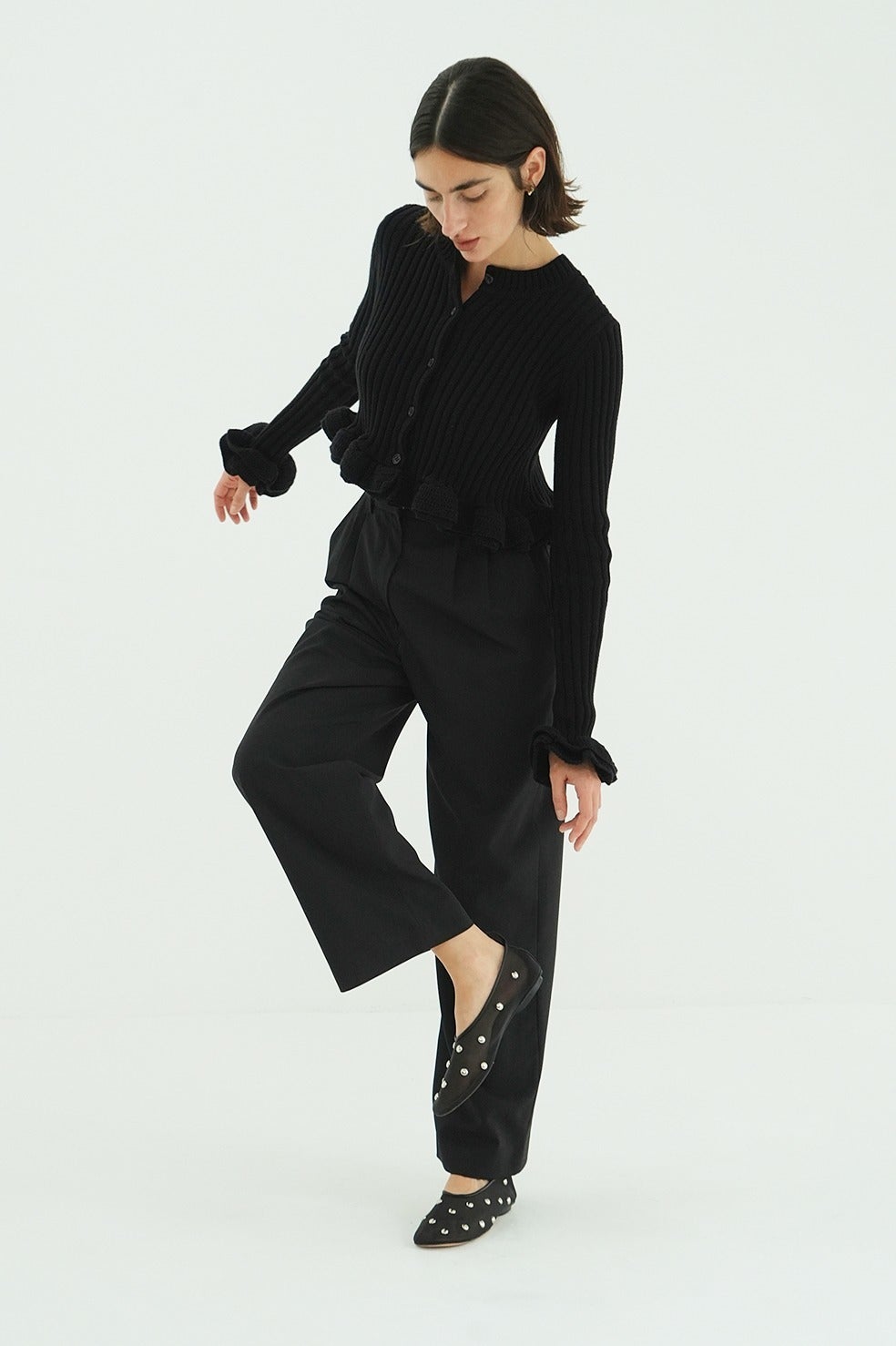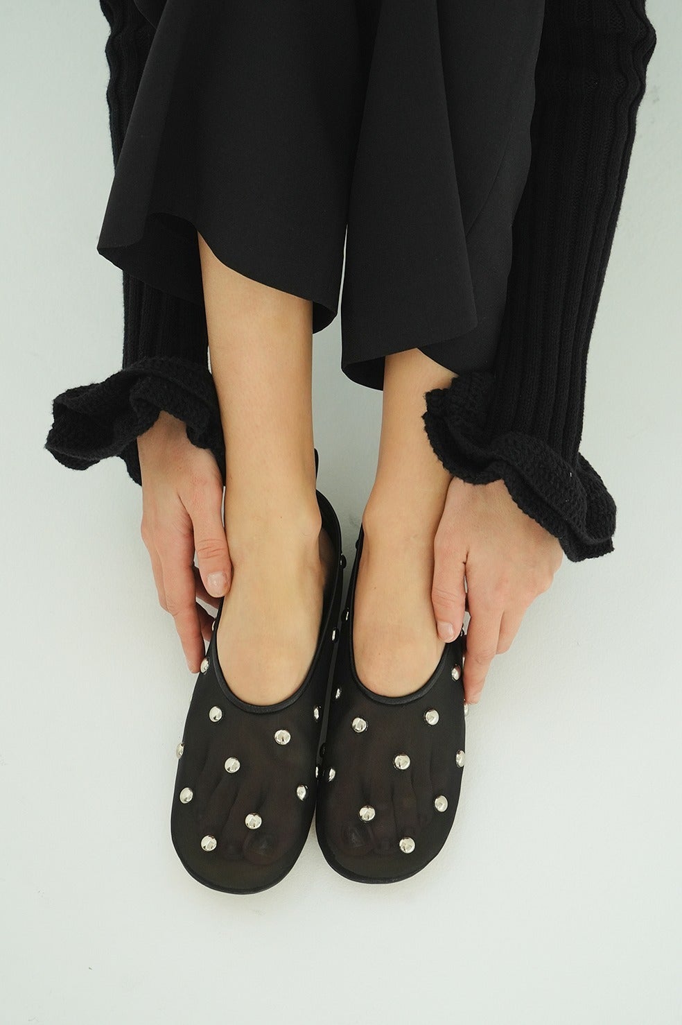 ほのかな透けで抜け感のあるパンプスに、半ドームスタッズをあしらったフラットシューズです。程よい存在感がありながら重たくならず、日常のスタイリングにも取り入れやすいデザイン。