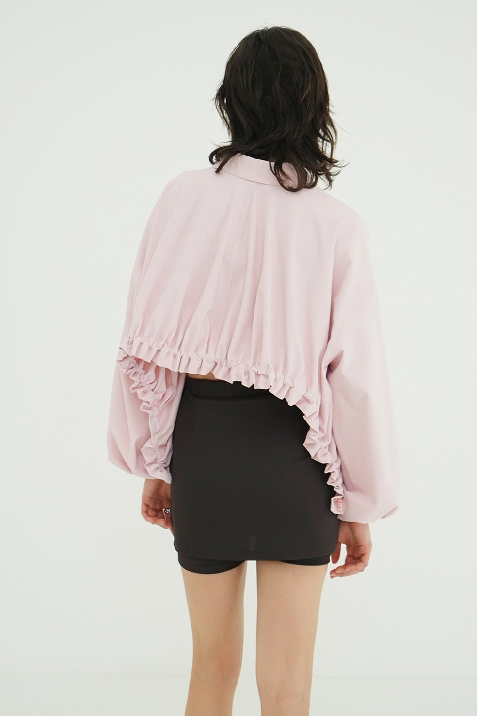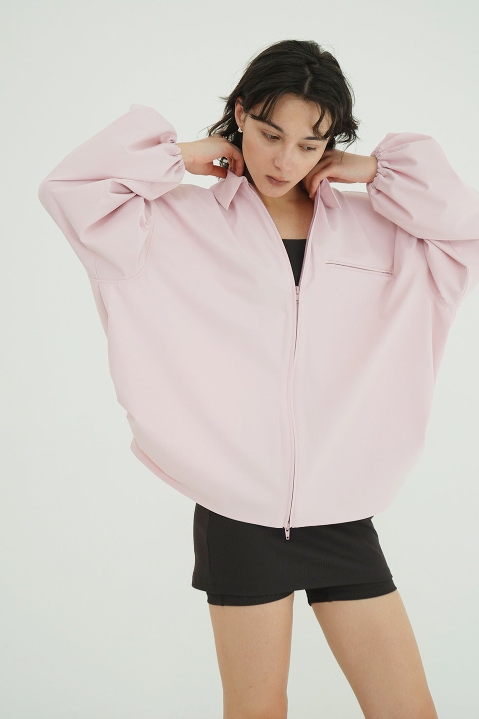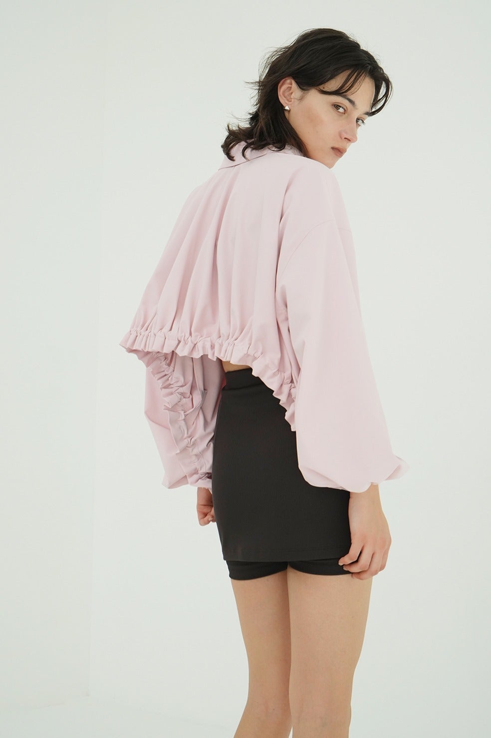 サイドからバックにかけて施したアーチ型のドローストリングデザインがポイントで、バックスタイルまで印象的に仕上げた一枚。ダブルジップ仕様で、フロントはすっきりとしたデザインにすることで、スタイリングバランスが取りやすい仕様にしました。