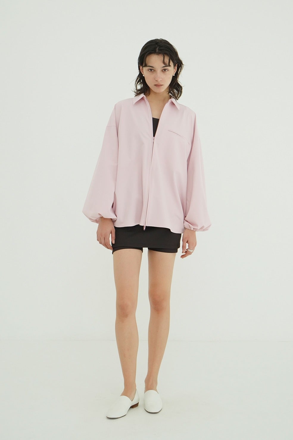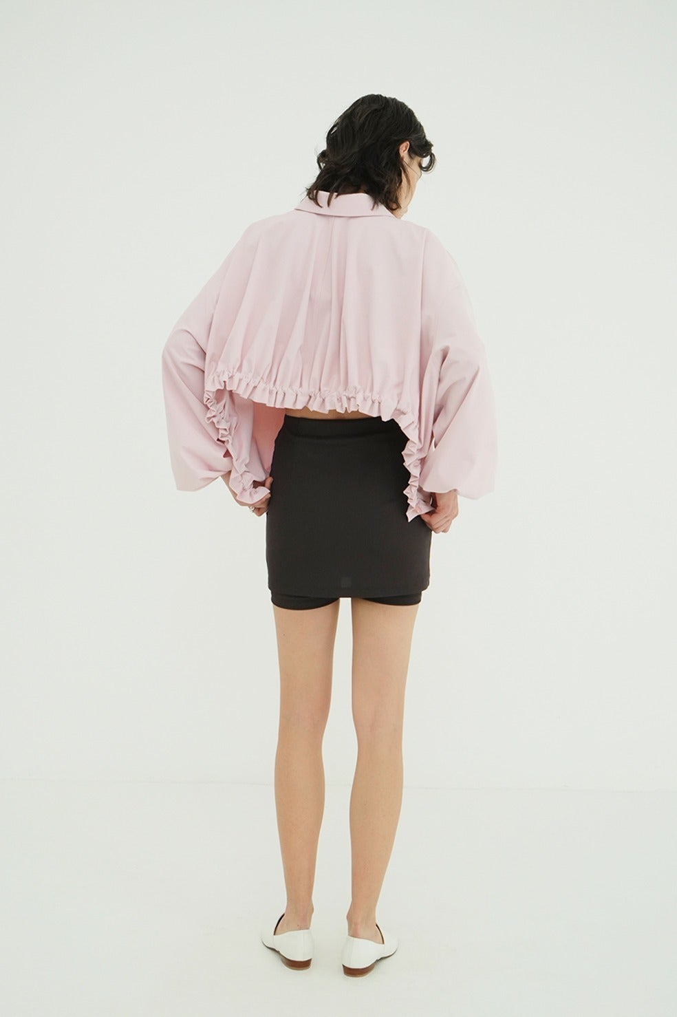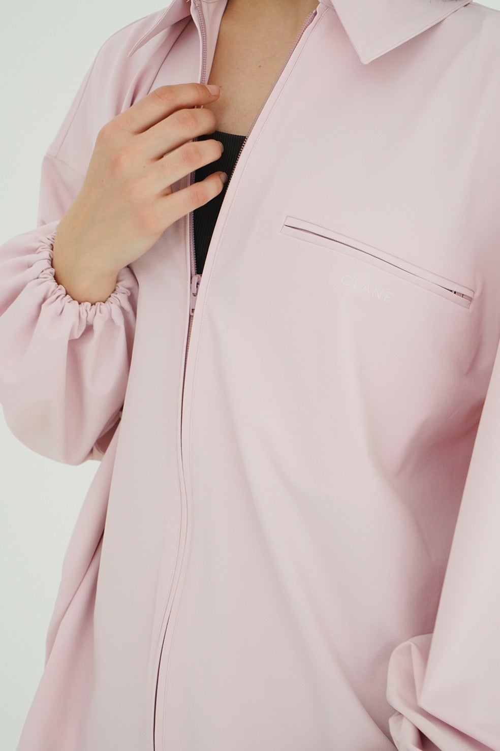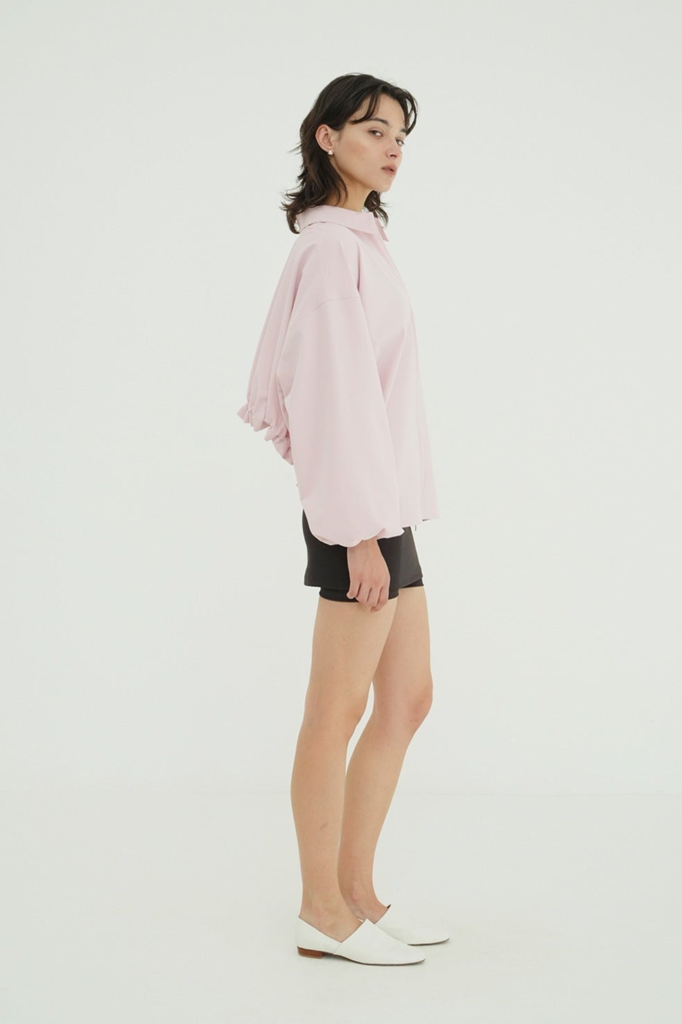 サイドからバックにかけて施したアーチ型のドローストリングデザインがポイントで、バックスタイルまで印象的に仕上げた一枚。ダブルジップ仕様で、フロントはすっきりとしたデザインにすることで、スタイリングバランスが取りやすい仕様にしました。