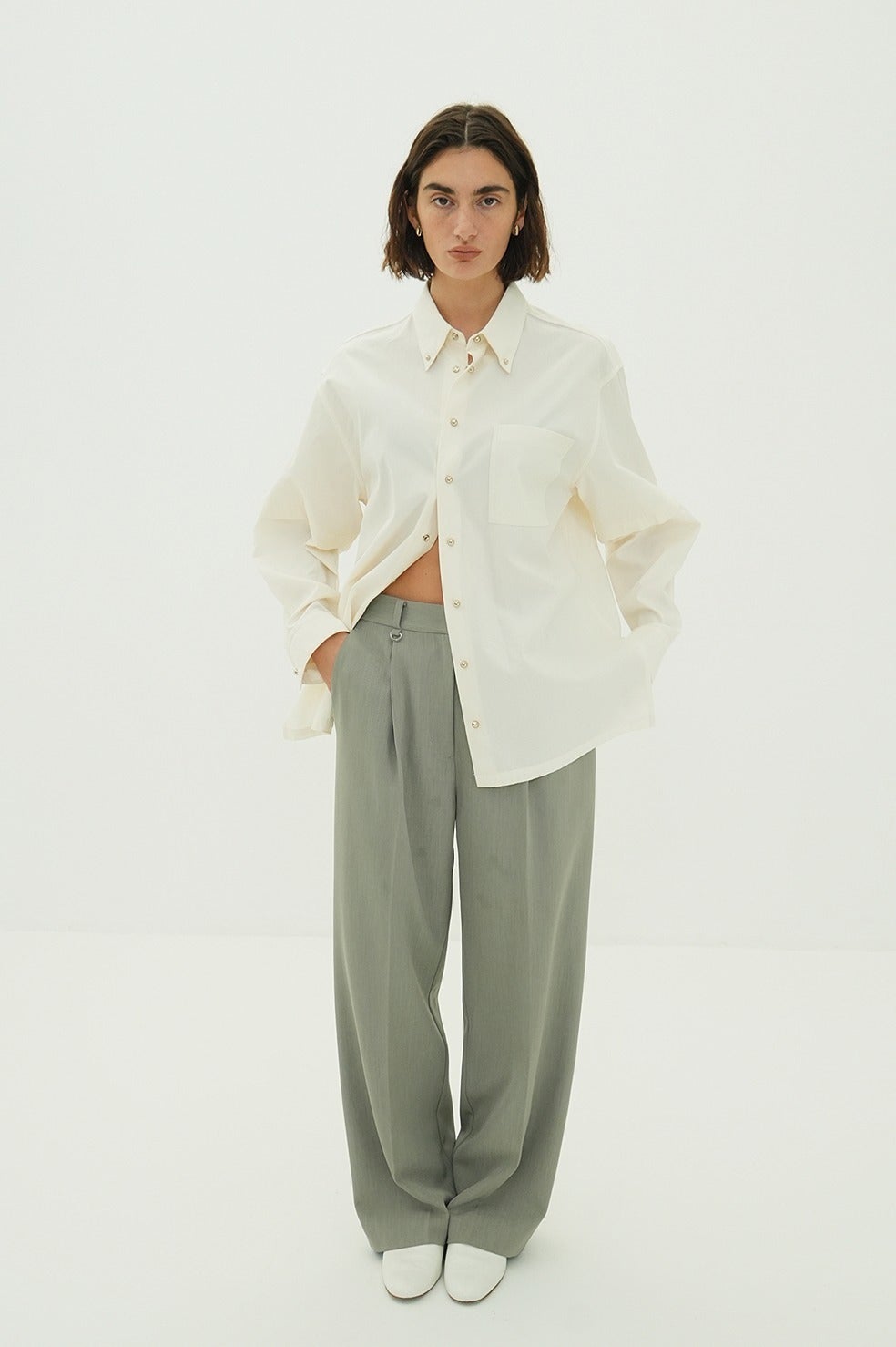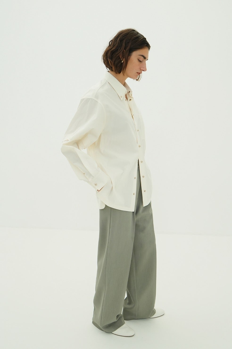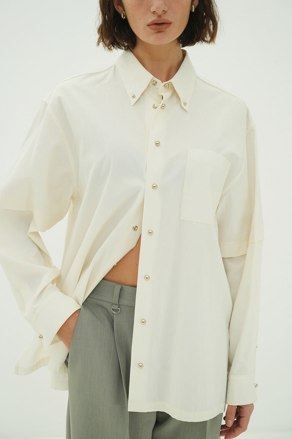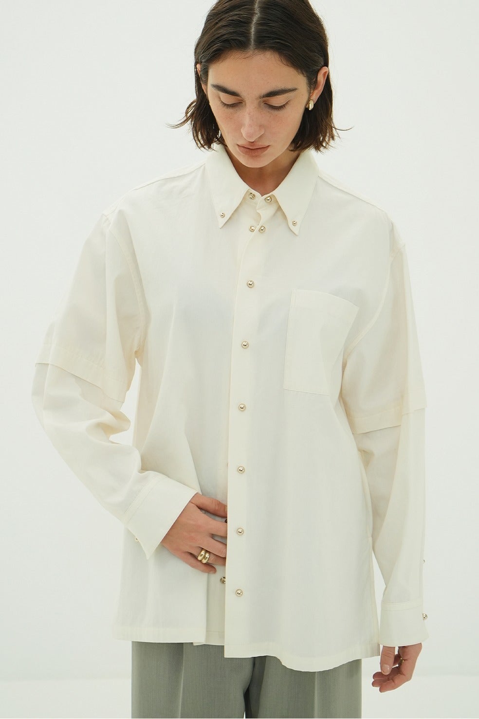 ボタンを配する部分に、球体のメタルスナップをあしらうことで、クリーンなシャツに華やかさをプラス。ボックスシルエットをベースに、袖にはレイヤードデザインを施し、シンプルながらも存在感のあるデザインに仕上げました。