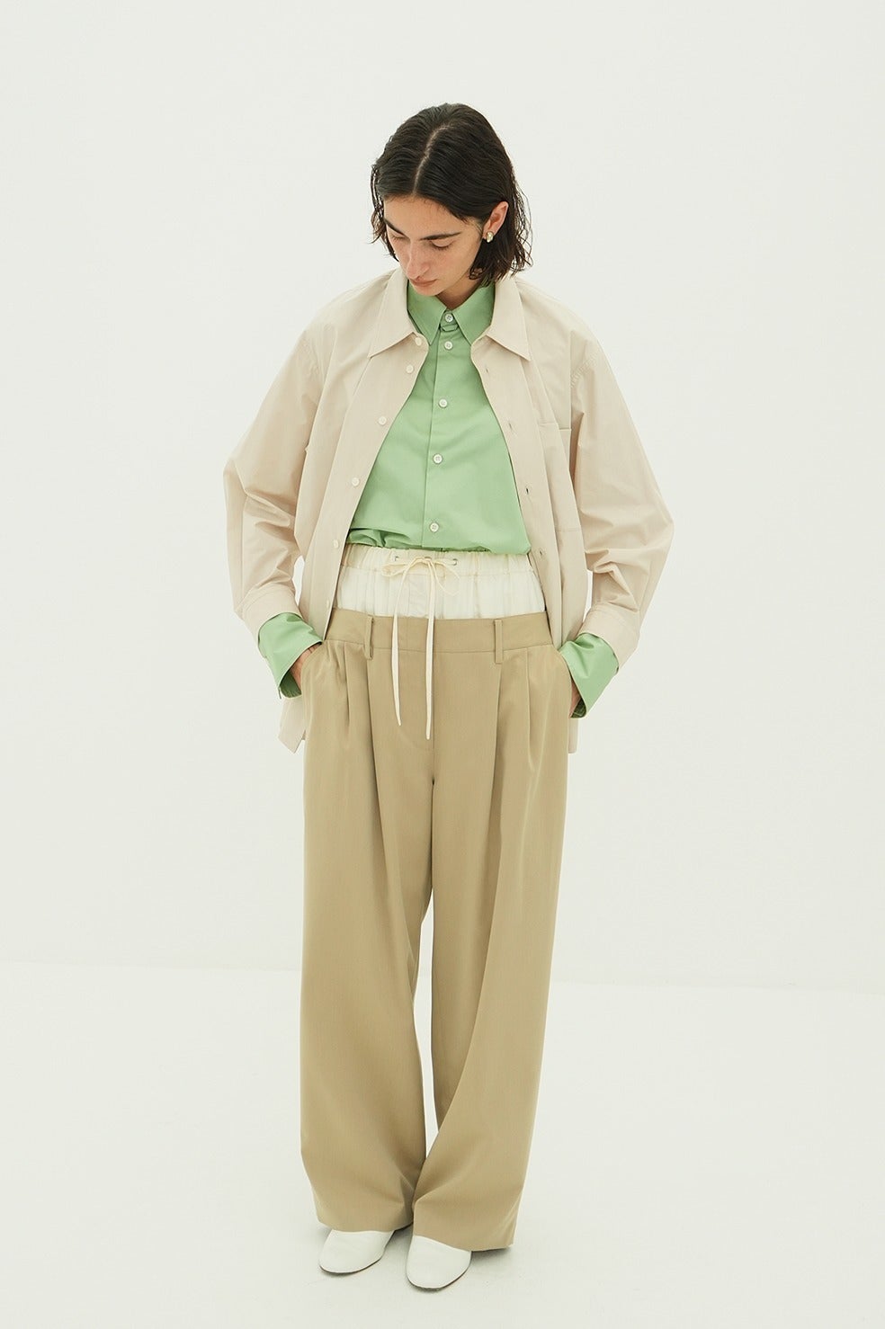 はっきりとしたバイカラーと異素材の組み合わせで、より立体的なレイヤー感を表現。インナーシャツにはスリットを入れており、フロントだけをインした着こなしも可能です。