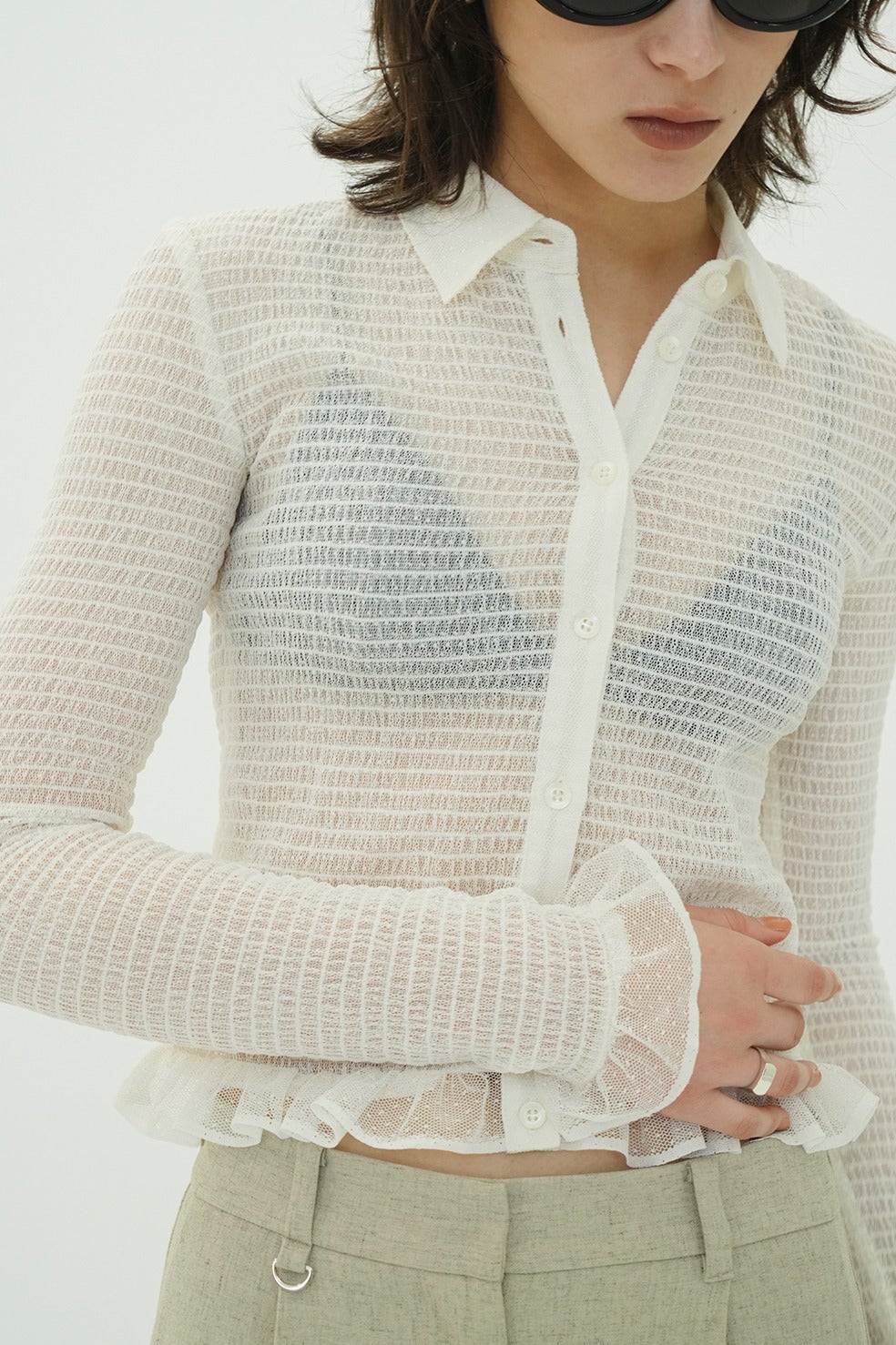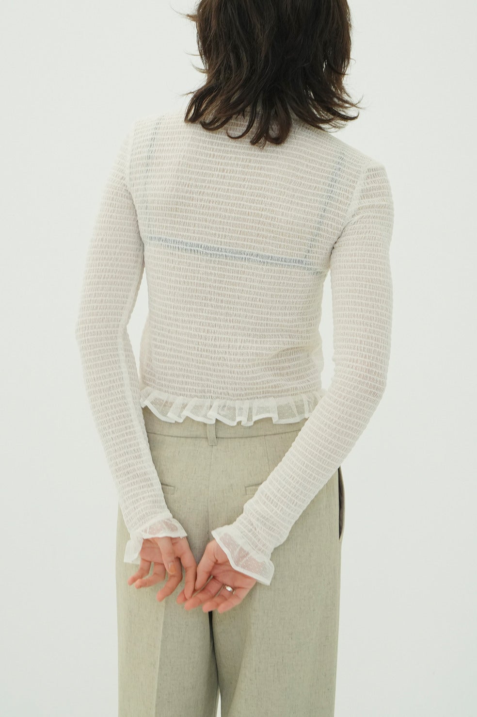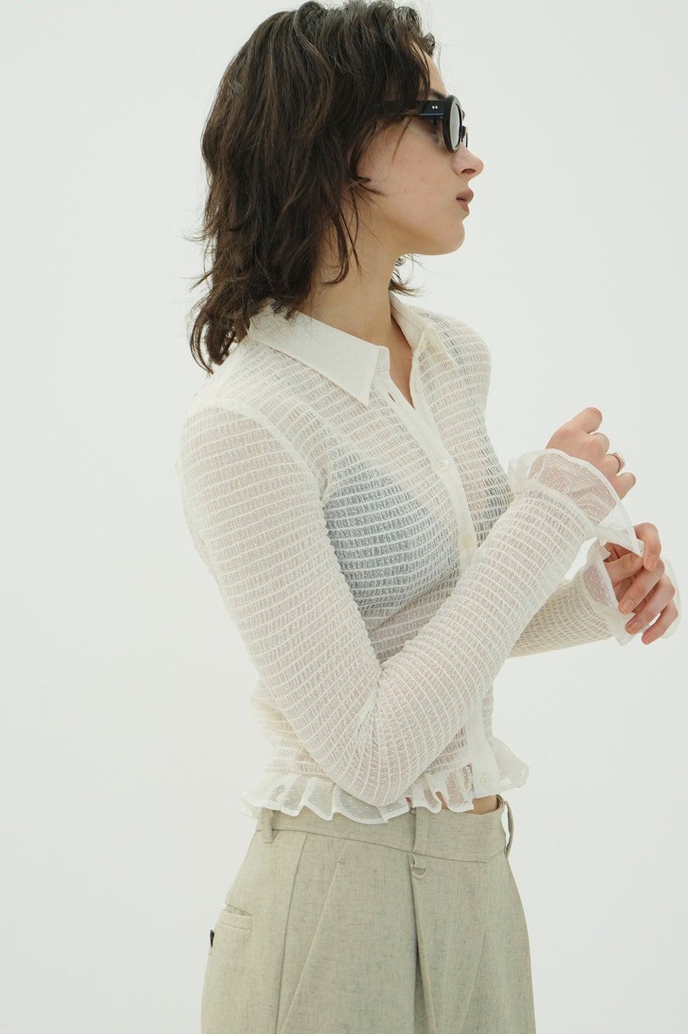 ベースの形は25AWのMIX MESH GATHER SHIRT同様で、タイトめなシルエットに、裾と袖口の華奢なフリルで女性らしいモードなシャツに仕上げました。
