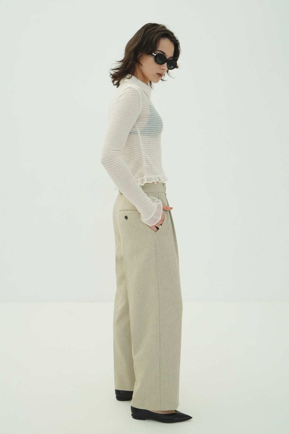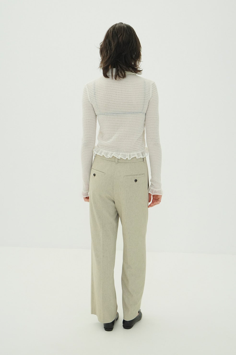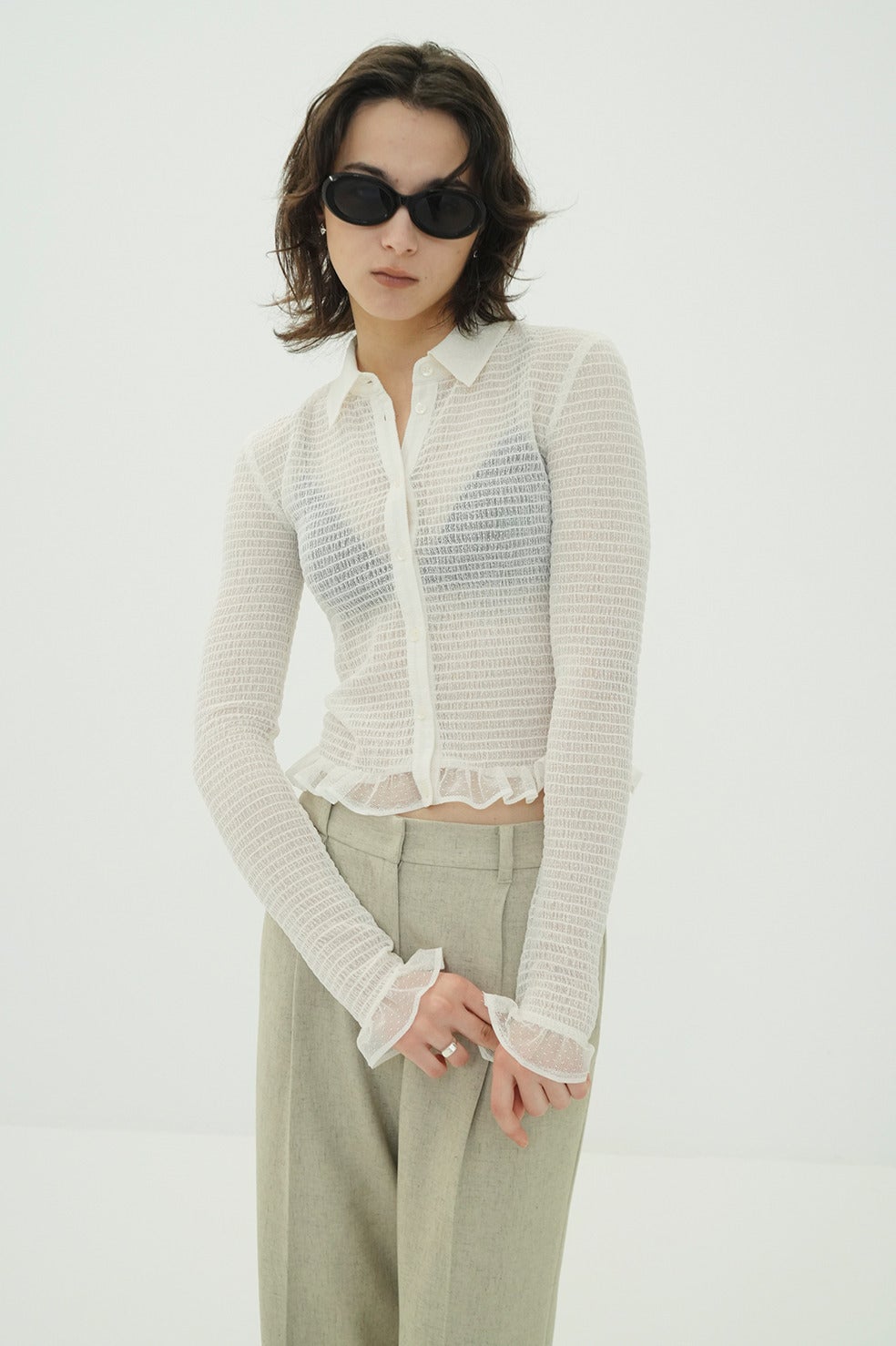 ベースの形は25AWのMIX MESH GATHER SHIRT同様で、タイトめなシルエットに、裾と袖口の華奢なフリルで女性らしいモードなシャツに仕上げました。