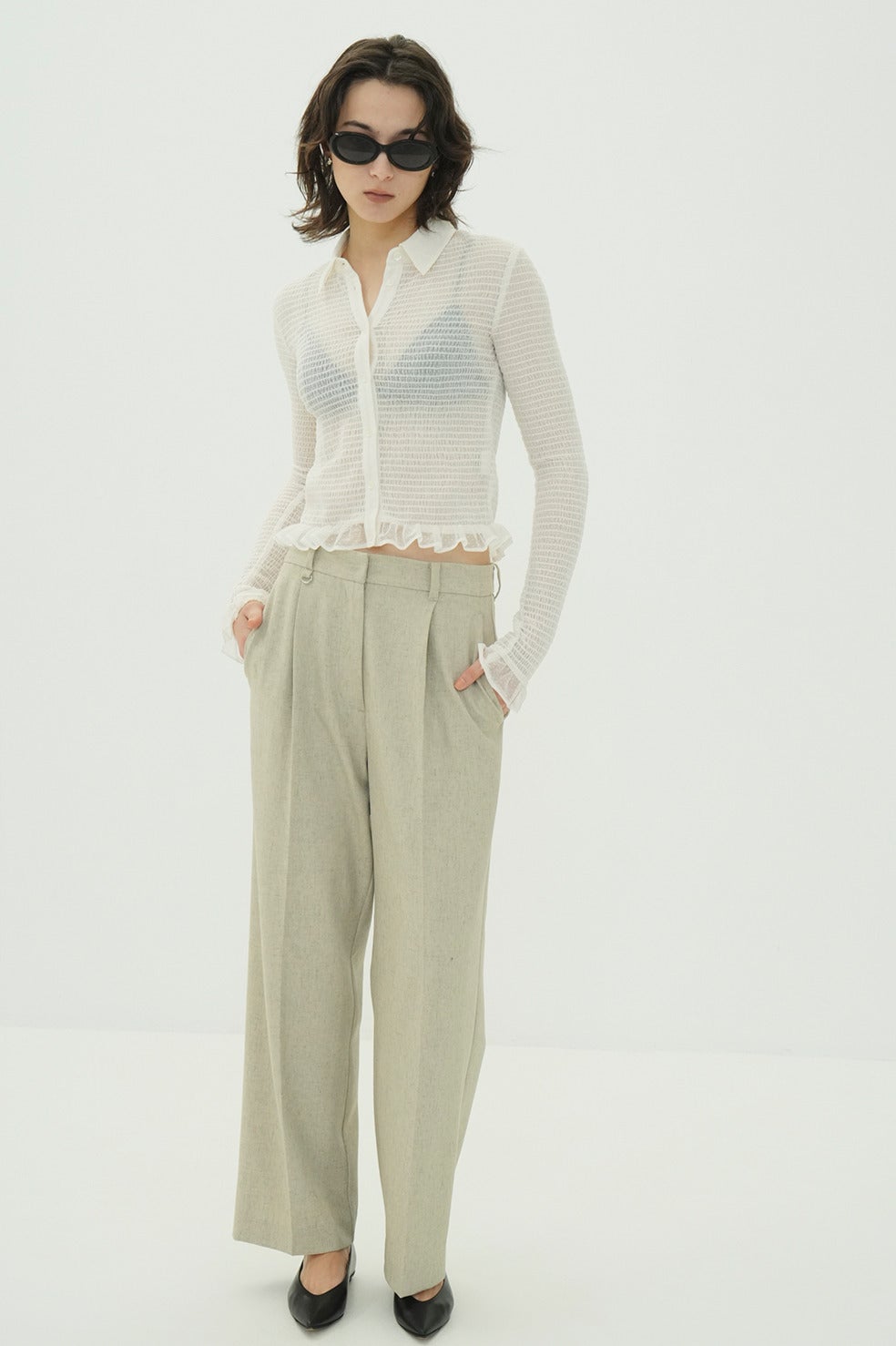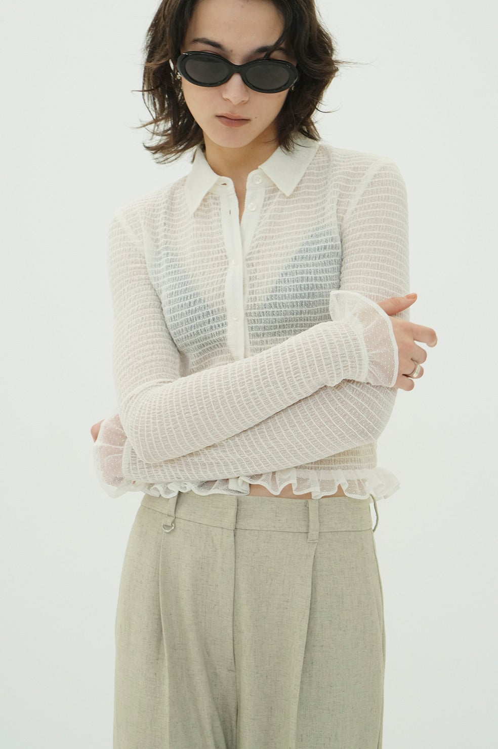 メッシュにシャーリングをかけることで程良い肌見せができ、シャーリングのかかっていない襟や前たて、フリル部分にさりげなく見えるドット柄で春らしい印象に。スタイリング次第でデイリーに着こなせるおすすめのアイテムです。