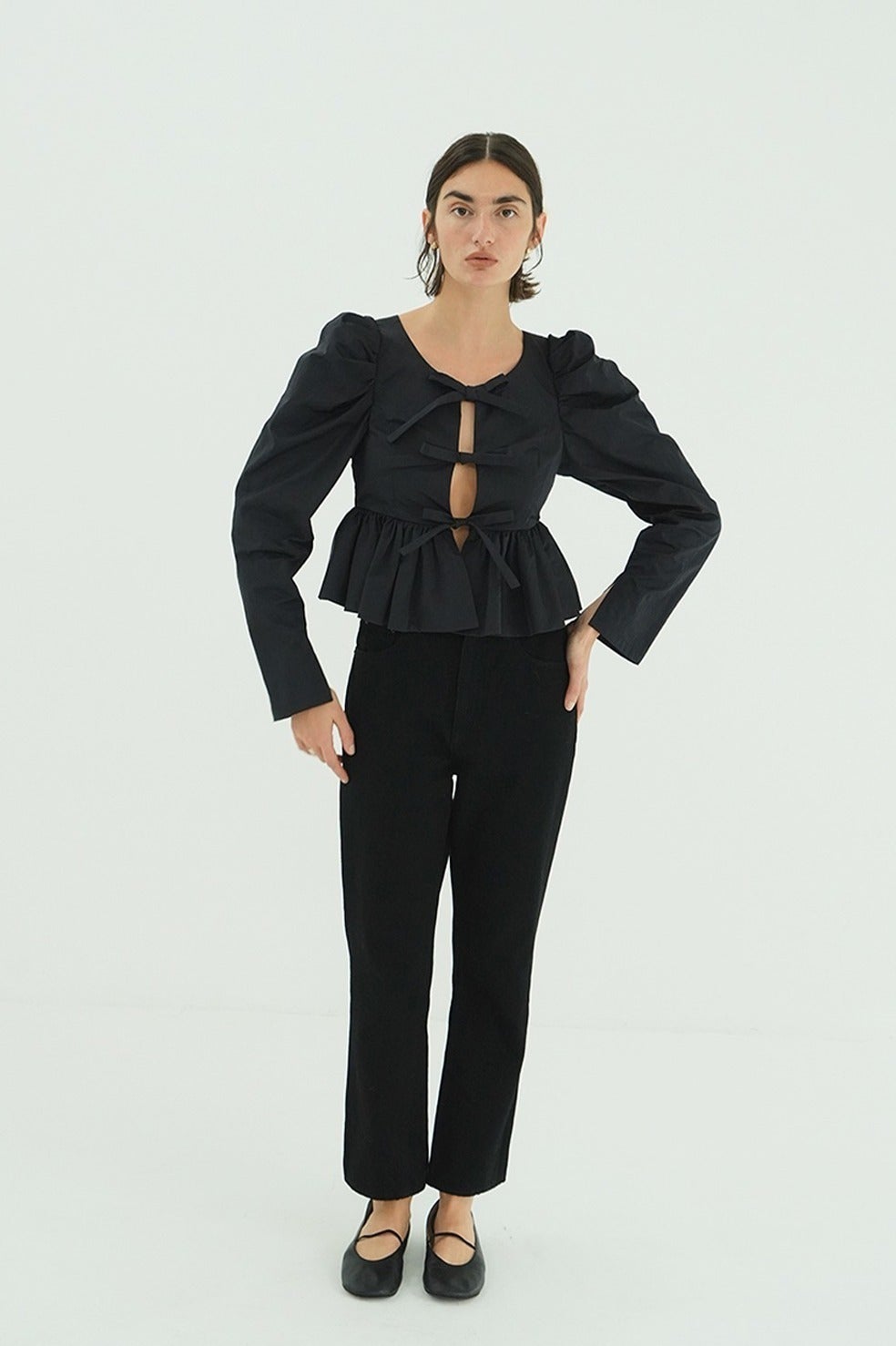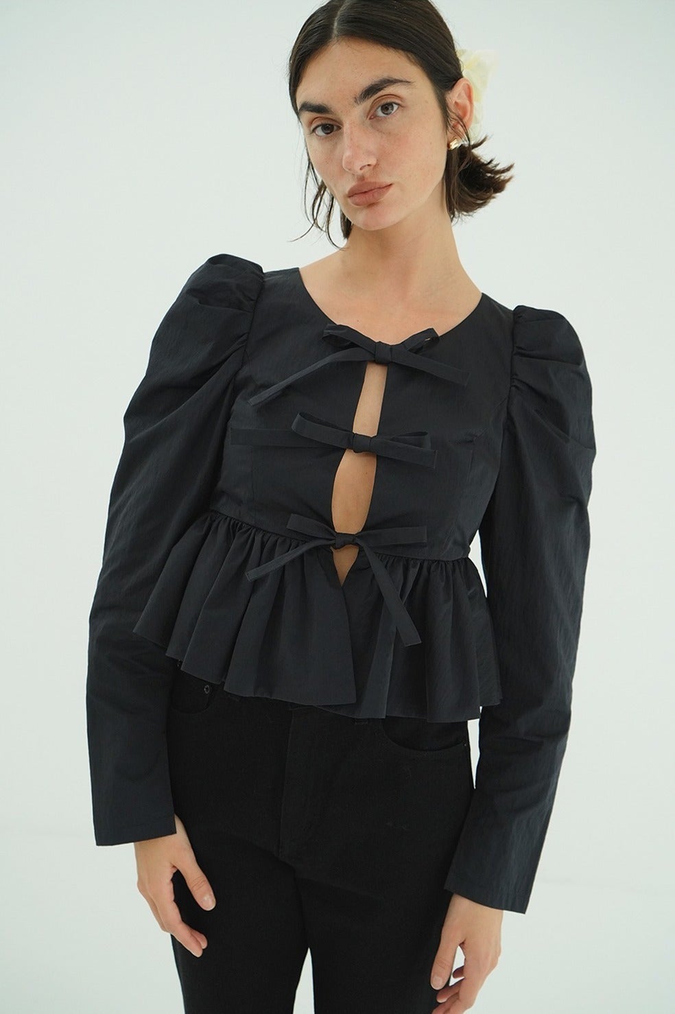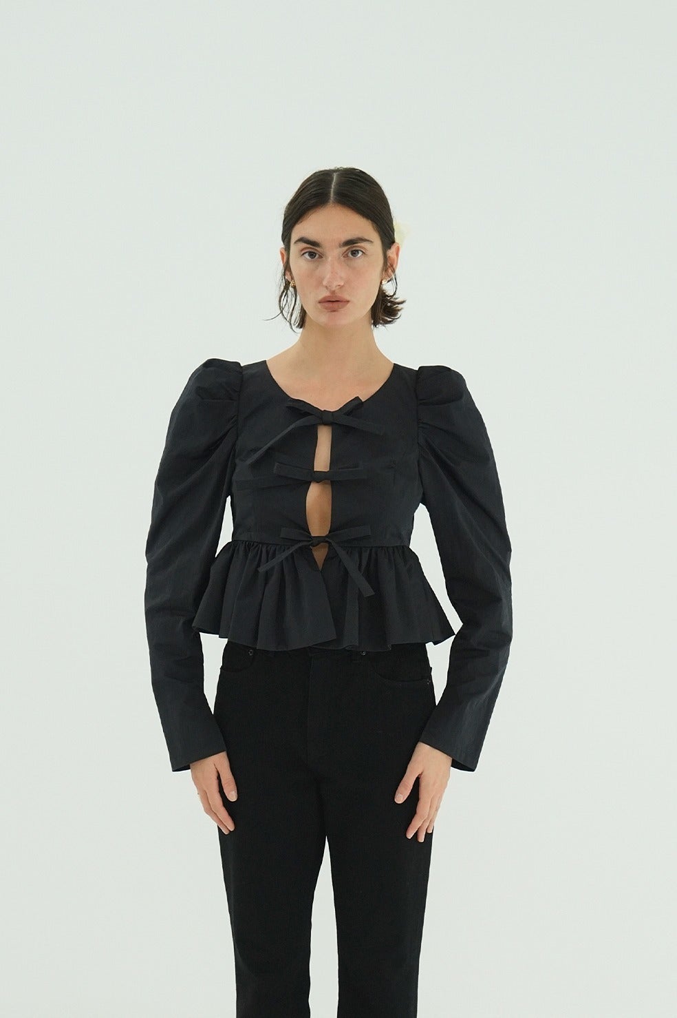 フロントに施したリボンディテールがフェミニンで女性らしいデザインです。タックの入った立体的なパフスリーブと、バルーンディテールで仕上げたぺプラムデザインで甘すぎずモダンな印象に仕上げました。