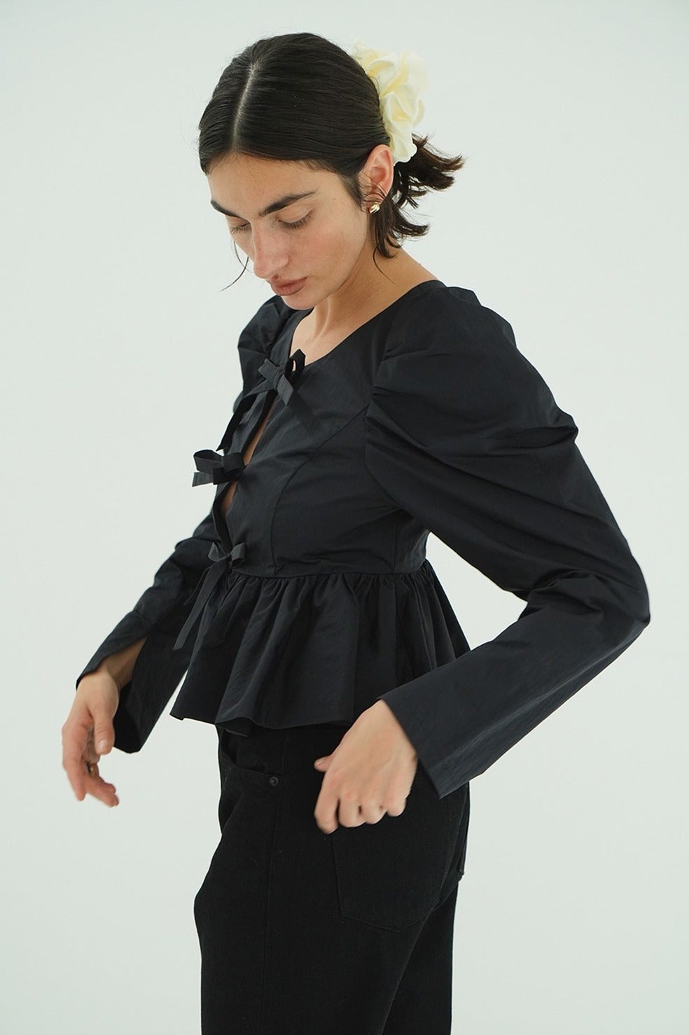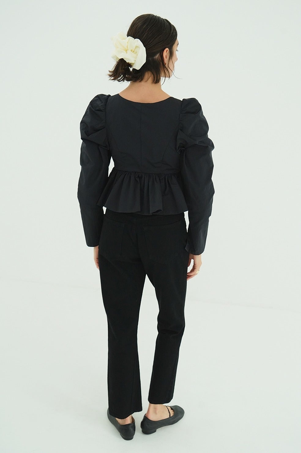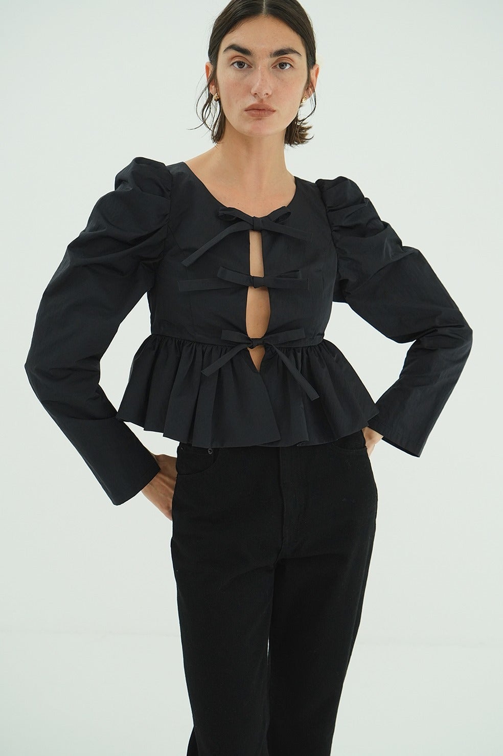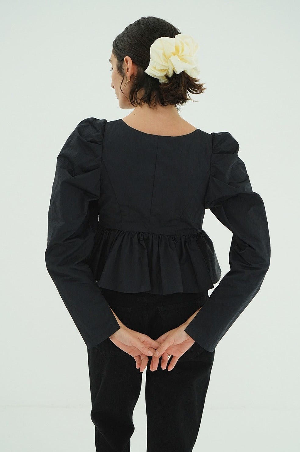 フロントに施したリボンディテールがフェミニンで女性らしいデザインです。タックの入った立体的なパフスリーブと、バルーンディテールで仕上げたぺプラムデザインで甘すぎずモダンな印象に仕上げました。