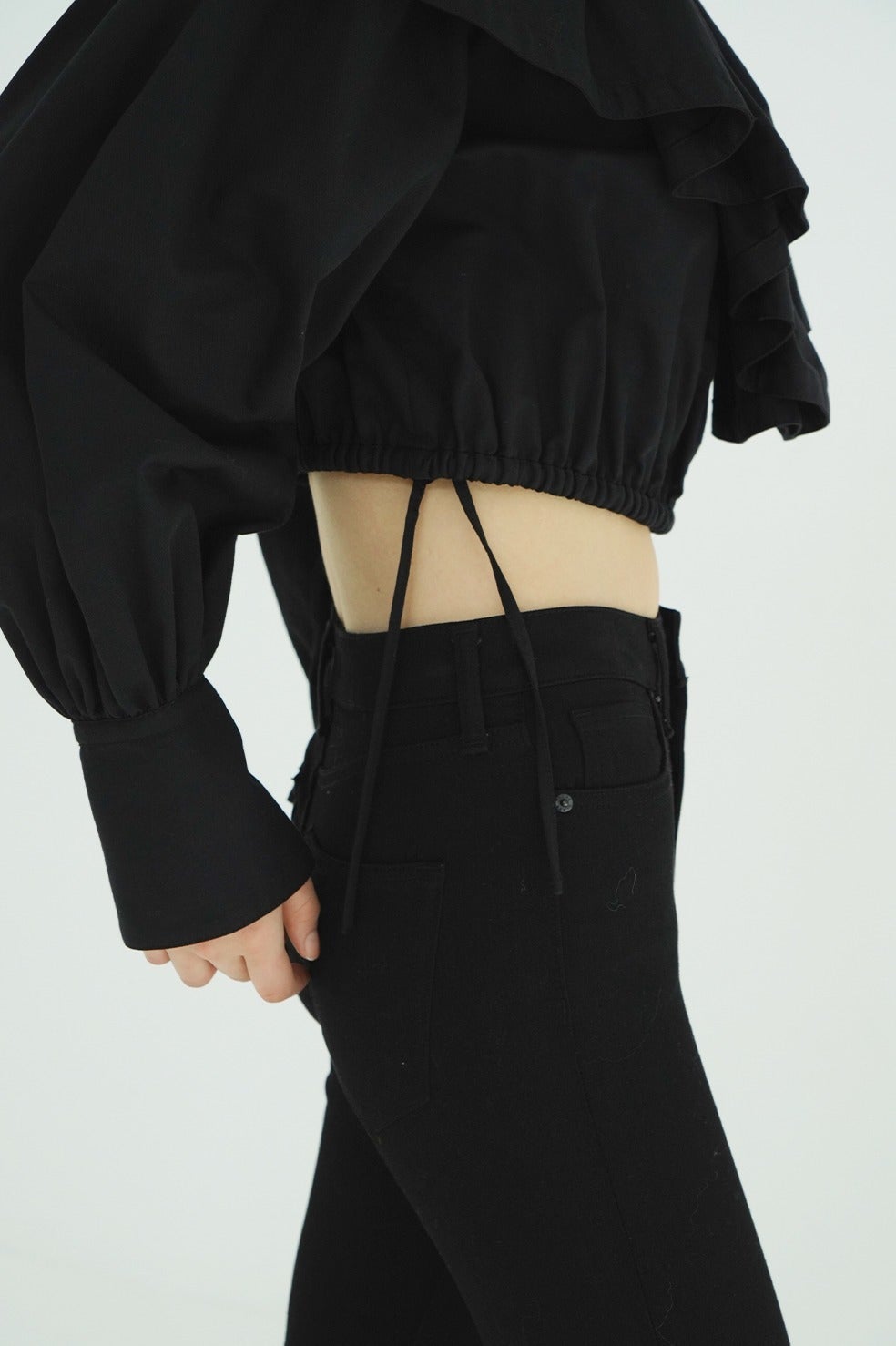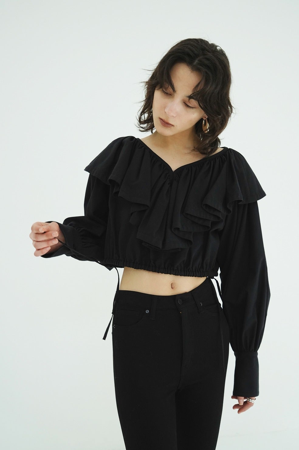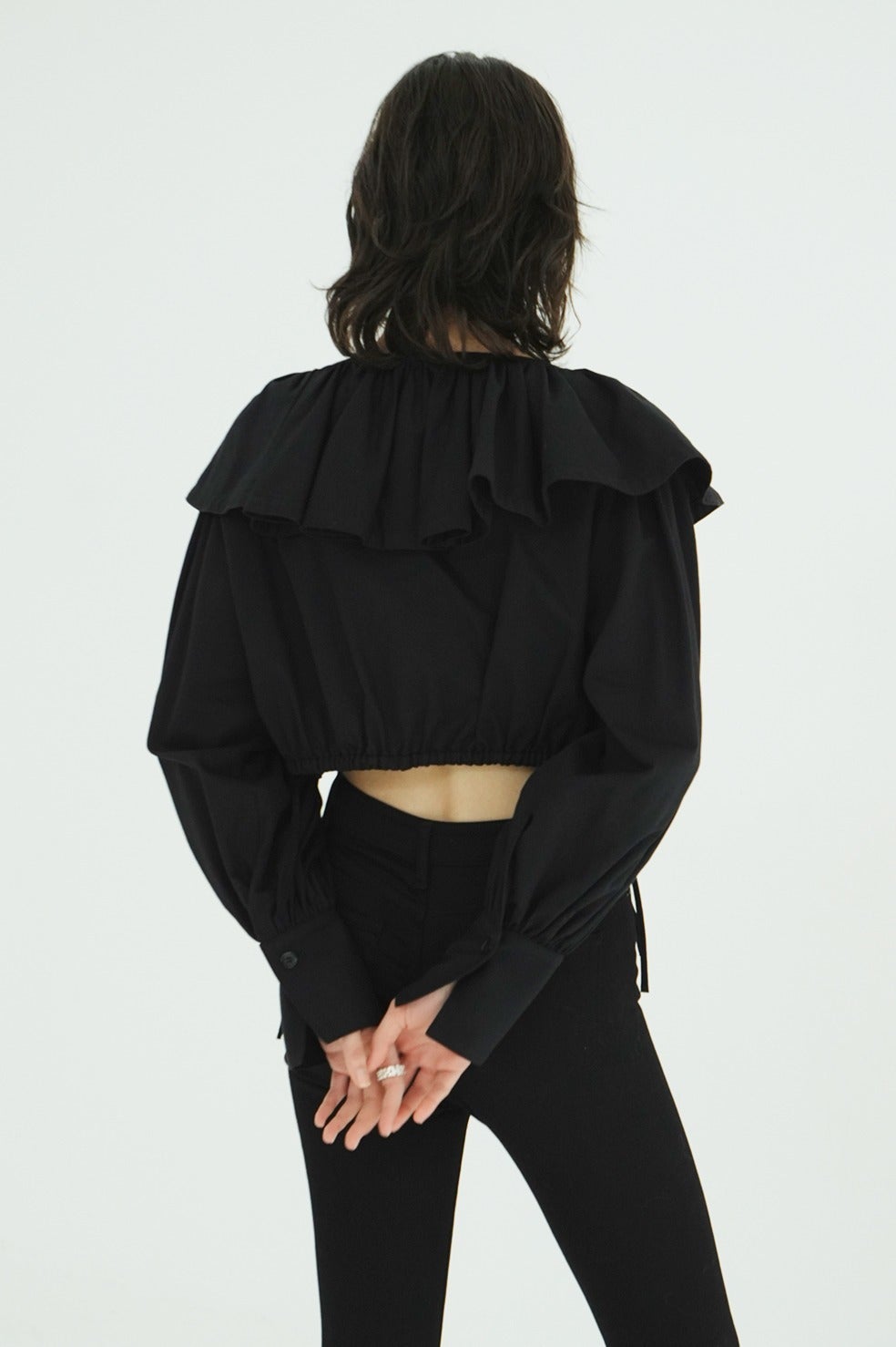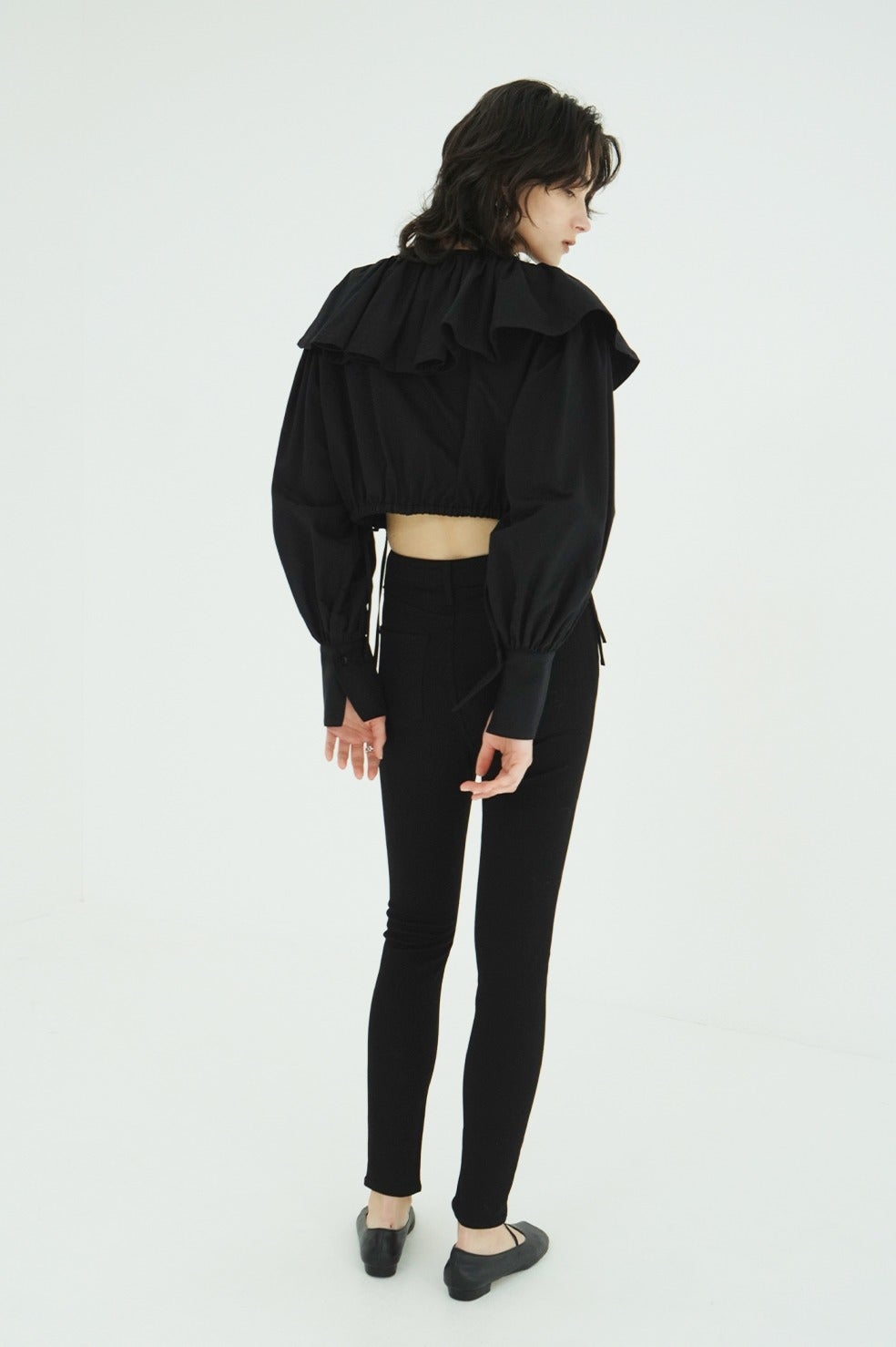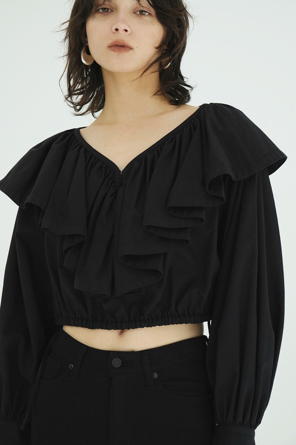 ショート丈にすることでフリルデザインを引き立たせ、女性らしい印象に仕上げました。袖のギャザーボリュームもデザインのポイントとなり、シルエットに立体感と華やかさをプラス。