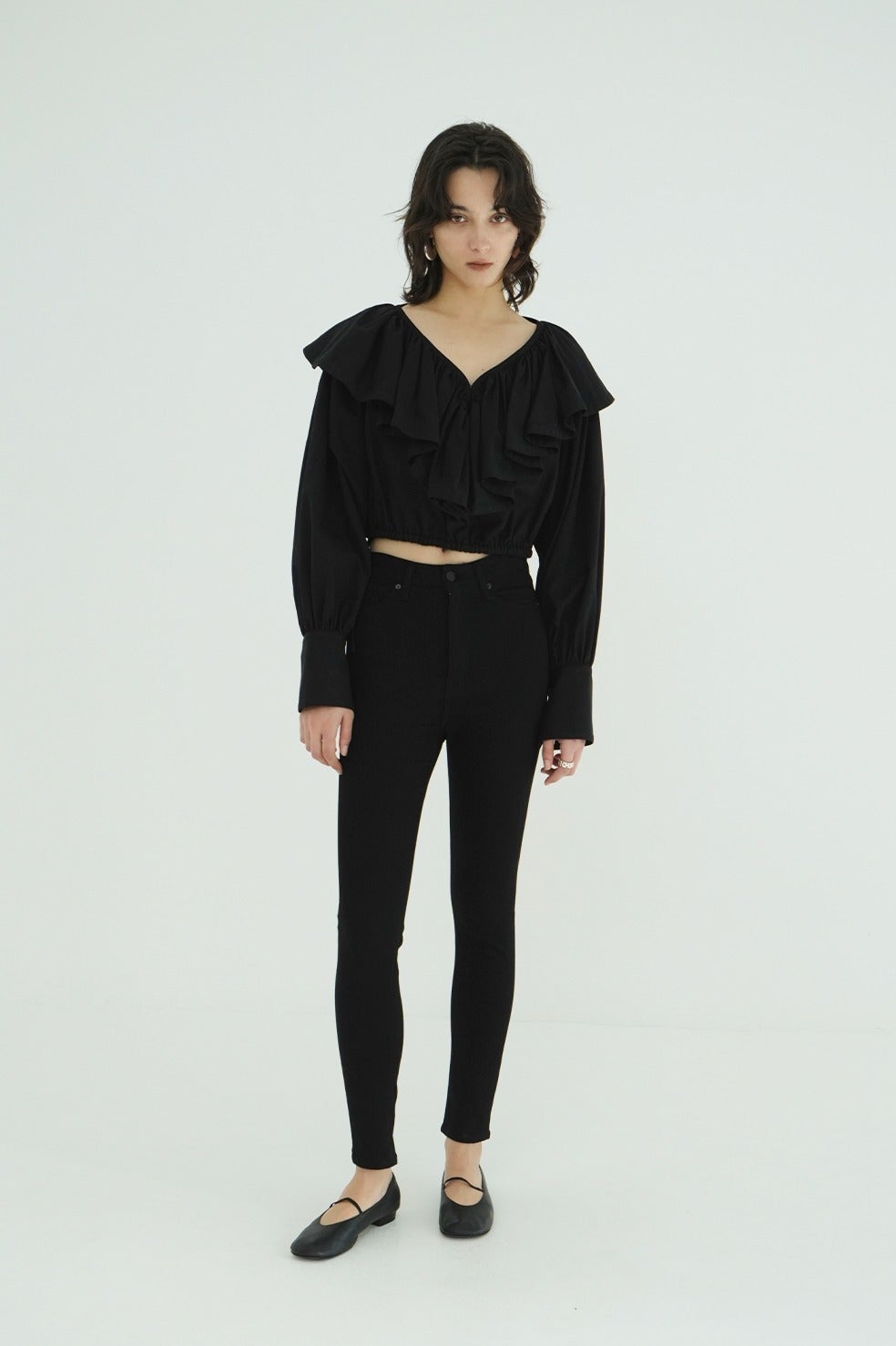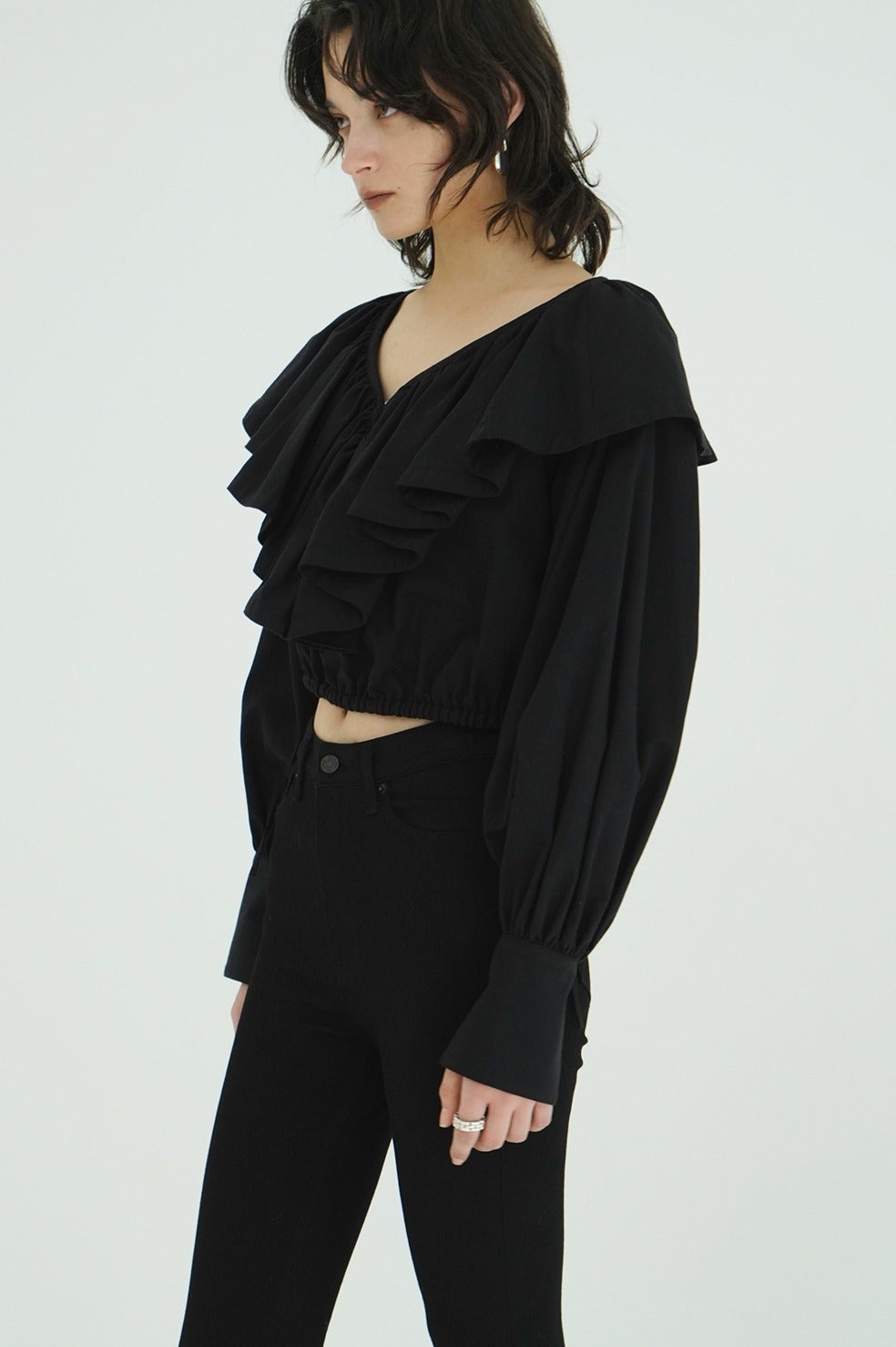 衿ぐりに施したフリルディテールが映えるブラウス。
