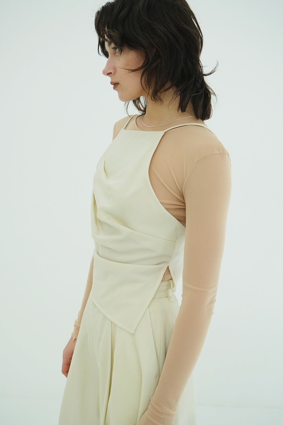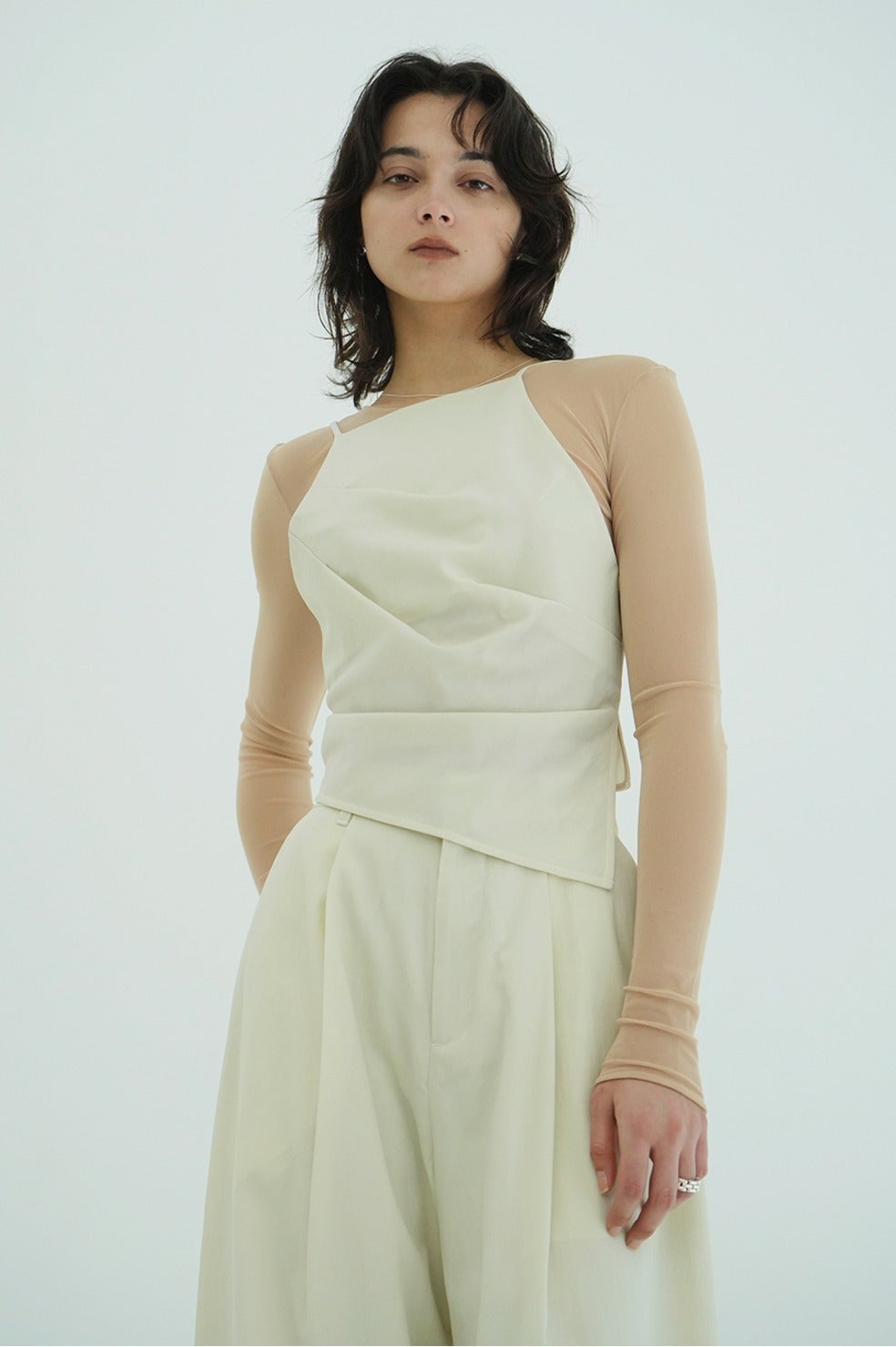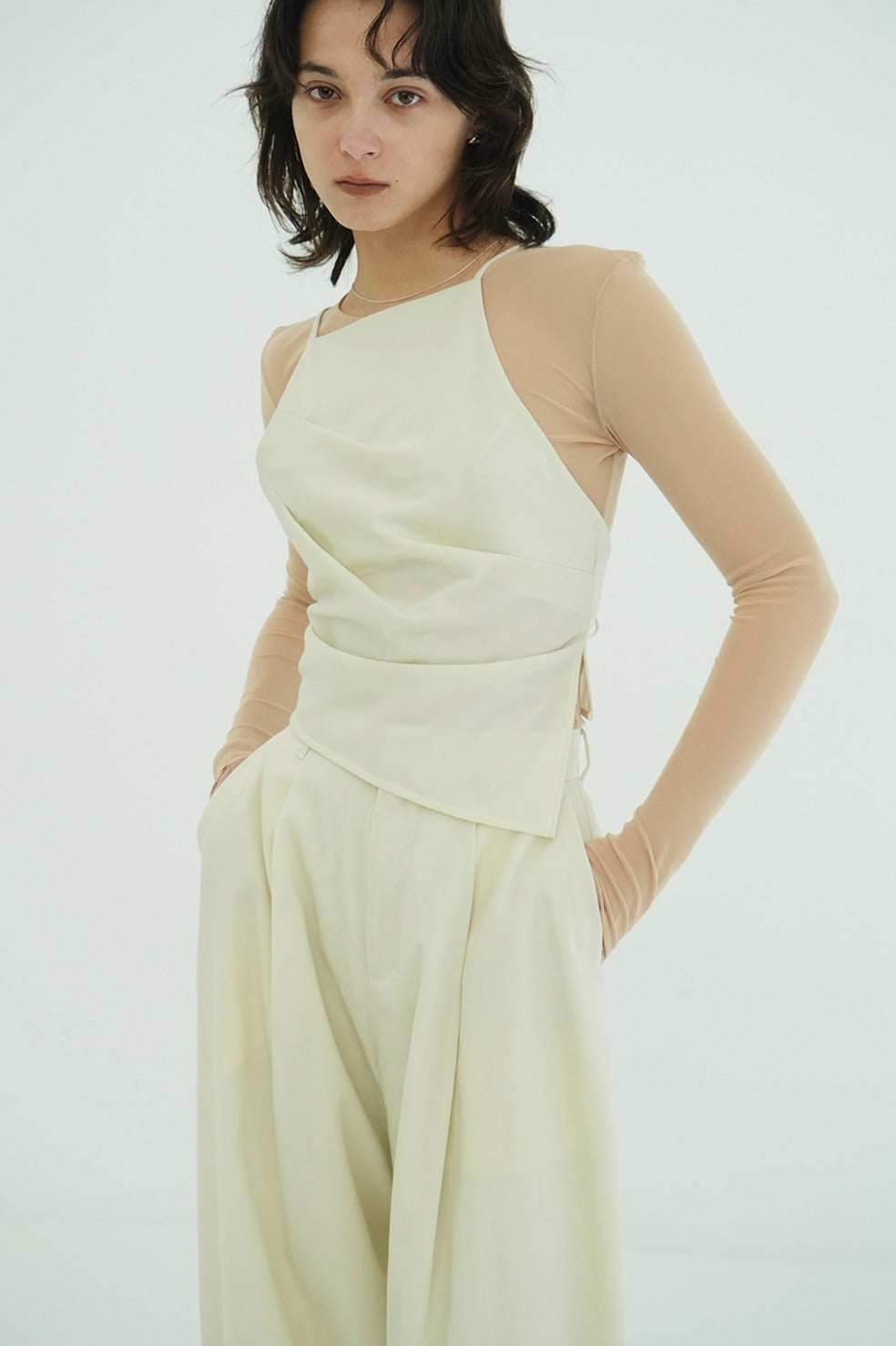 ドライタッチで洗練された表情感が魅力のウールナイロンシリーズから登場したモードビスチェ。