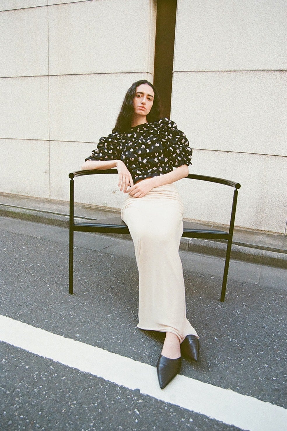 MINAMI TANAKA×CLANEコラボレーションのフラワージャガードのシャーリングトップス。