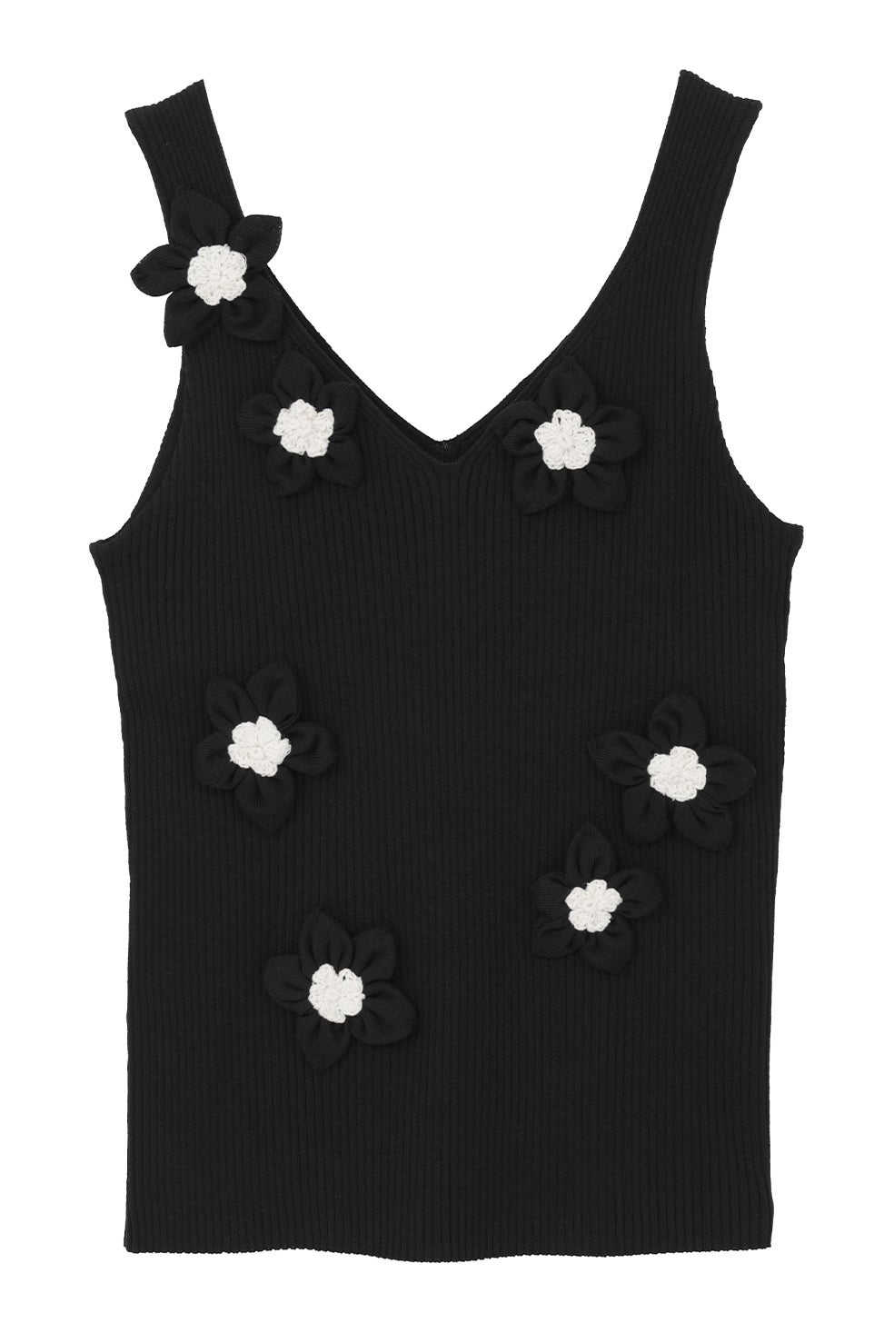 フラワーモチーフをあしらい、一つ一つ手作業で仕上げたニットタンクトップ。