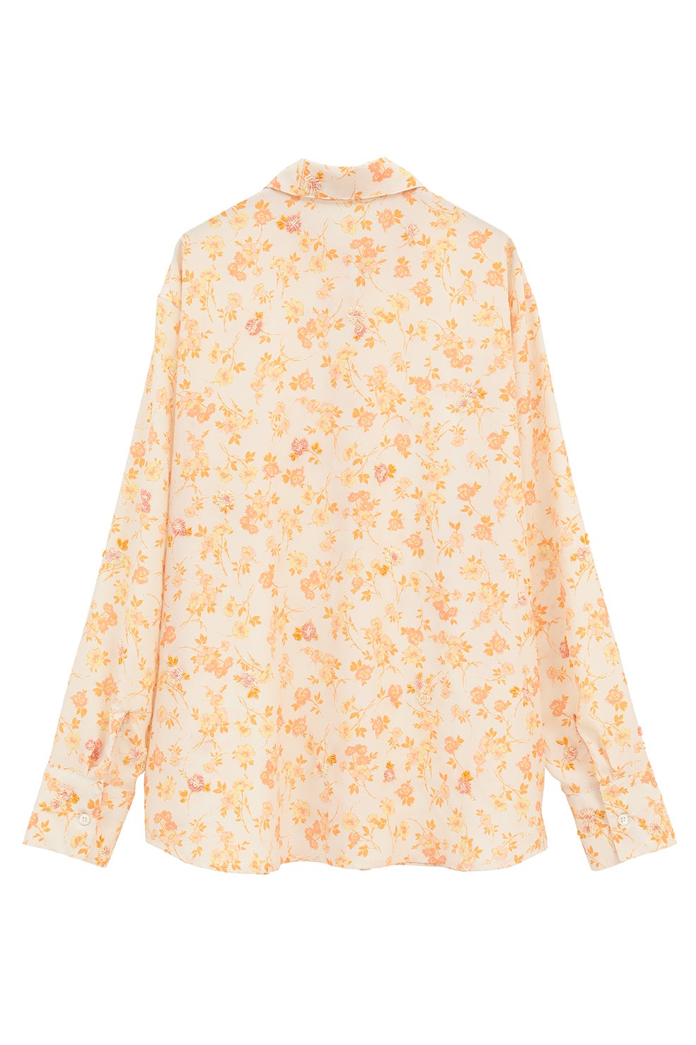美しいドレープ感が魅力のフラワーシリーズのクラフト感のあるデザインシャツ。フラワープリントにビーズを手刺繍であしらいました。