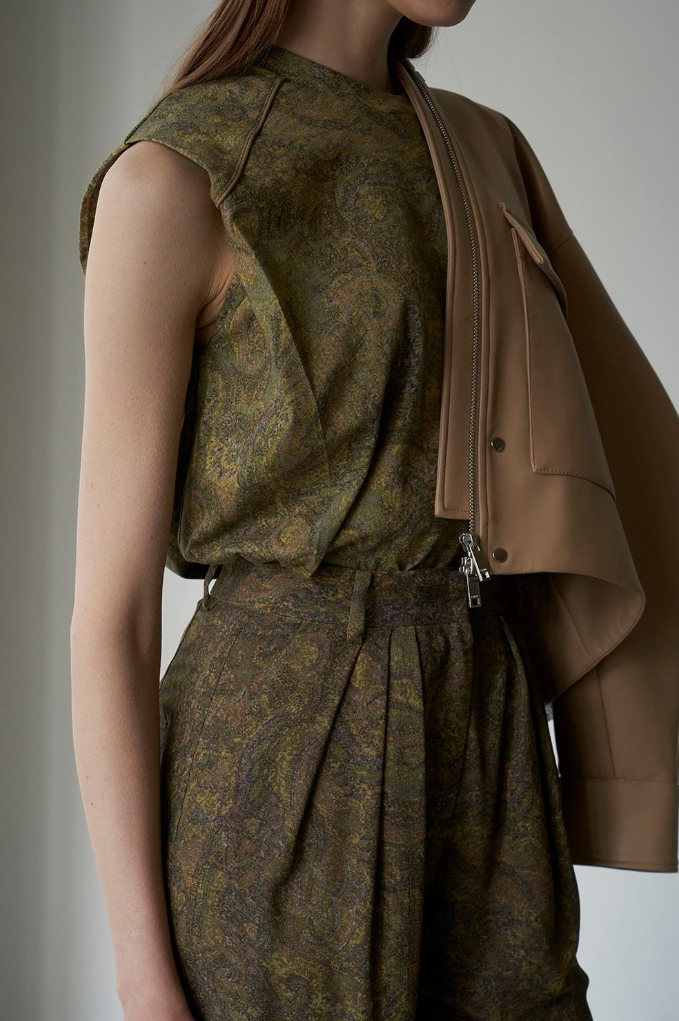ヴィンテージのゴブラン織りを綿100%の素材にプリントで表現したCLANEオリジナル柄のパンツ。 タックも入っており、足を綺麗に見せてくれるシルエットです。トップスはシンプルなデザインでも、カジュアルすぎず着ていただけます。