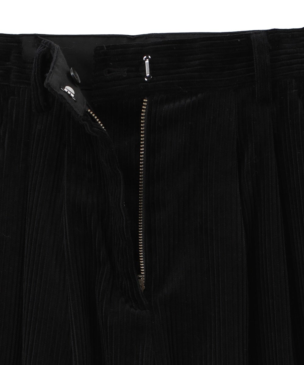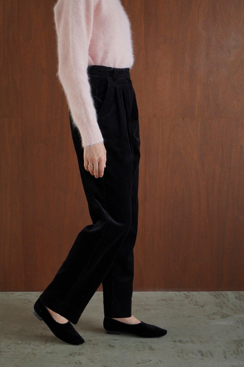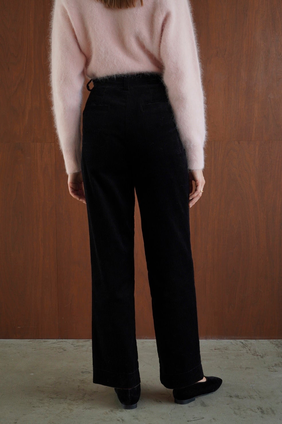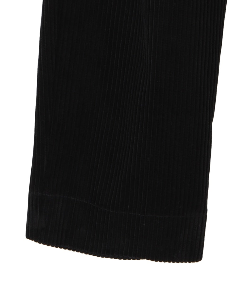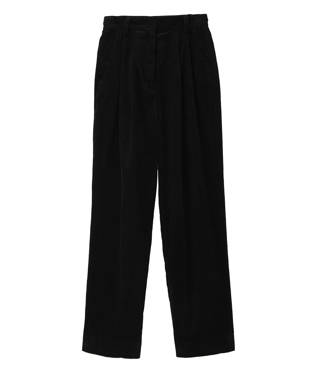 程よい艶感があるコーデュロイは、モードなボリュームを出しつつ、しなやかで女性らしい印象にしてくれます。ウエストのダブルタックと程よいボリューム感が他にない拘りのシルエットです。裾をロールアップしても可愛いデザインなので、低身長の方でも着やすいパンツです。