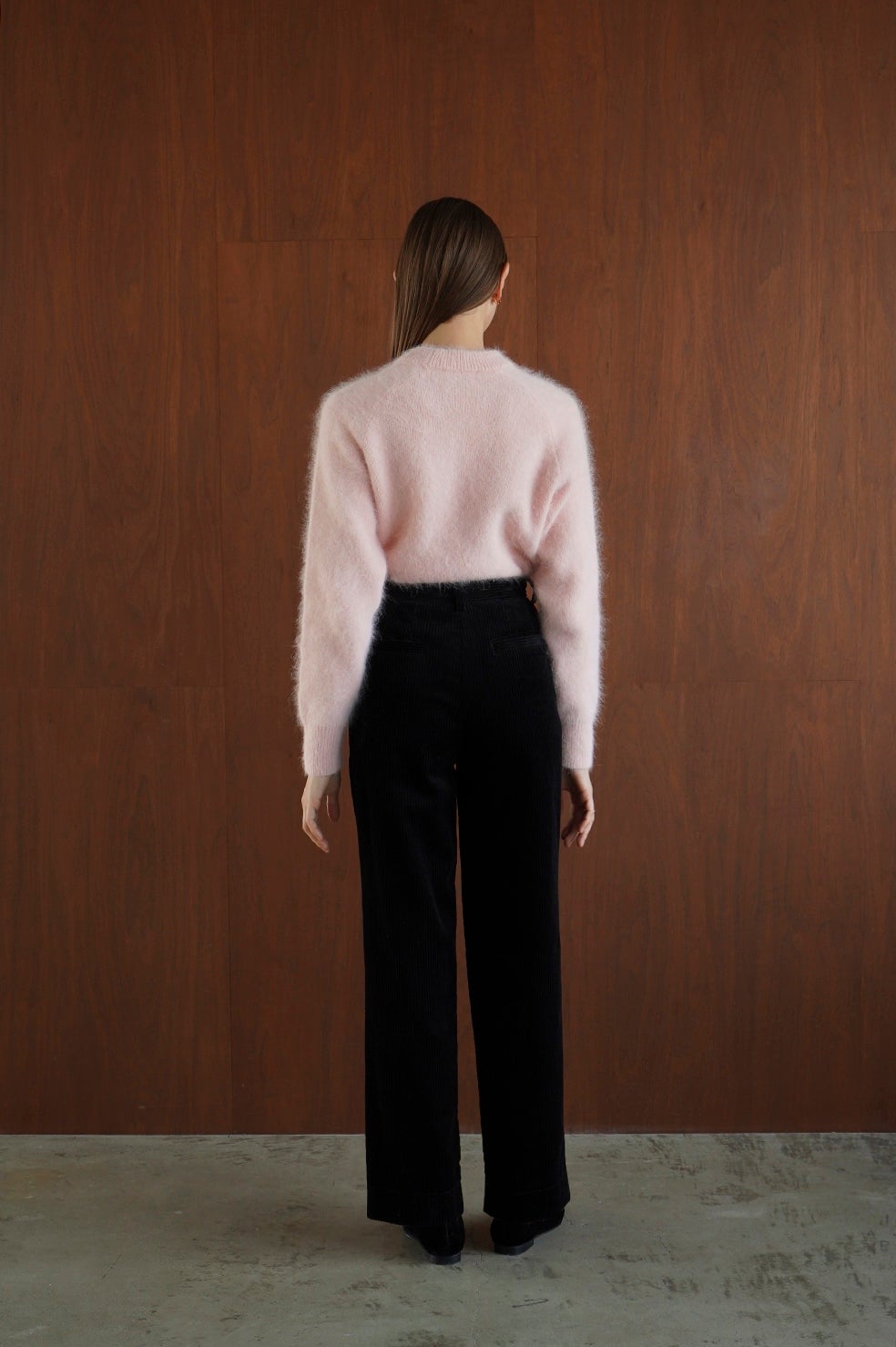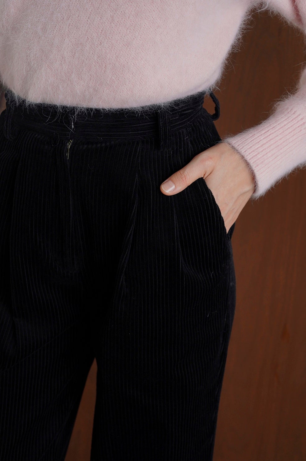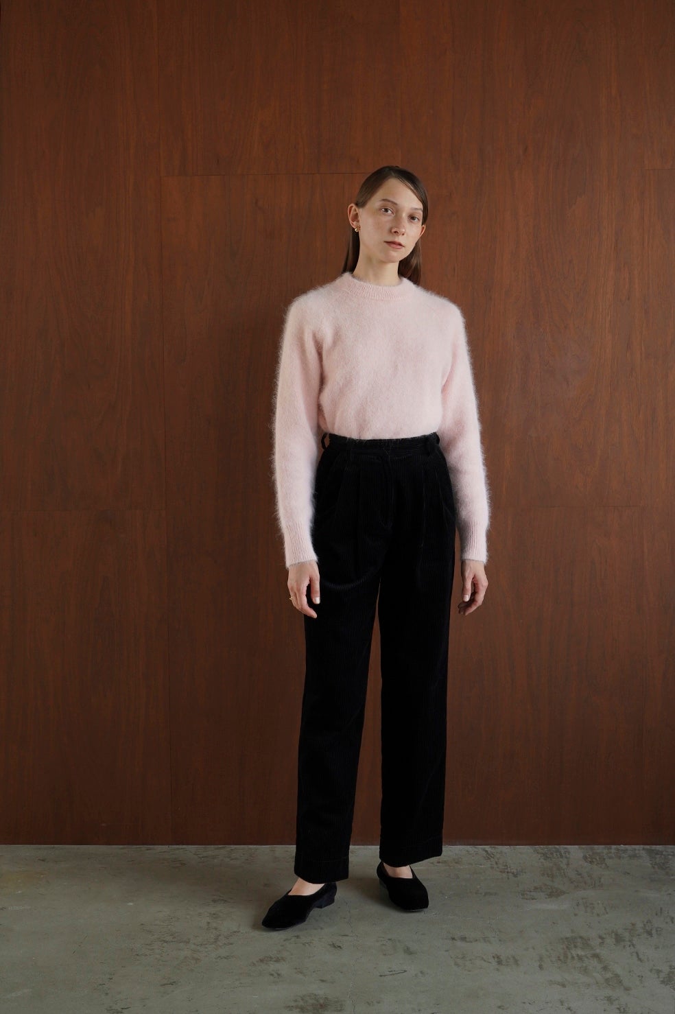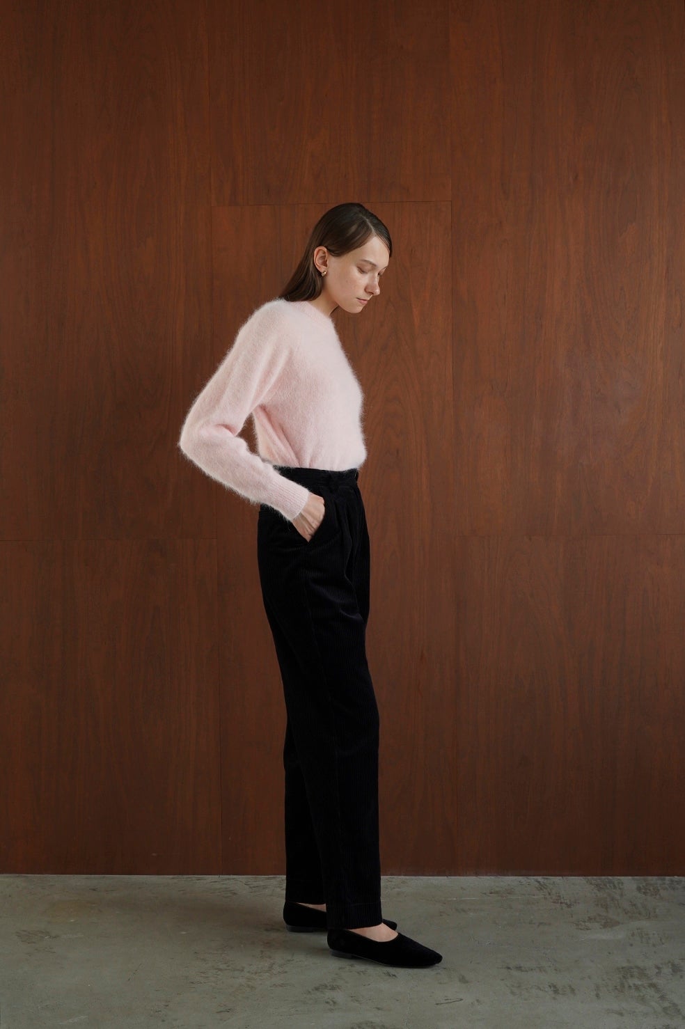 程よい艶感があるコーデュロイは、モードなボリュームを出しつつ、しなやかで女性らしい印象にしてくれます。ウエストのダブルタックと程よいボリューム感が他にない拘りのシルエットです。裾をロールアップしても可愛いデザインなので、低身長の方でも着やすいパンツです。